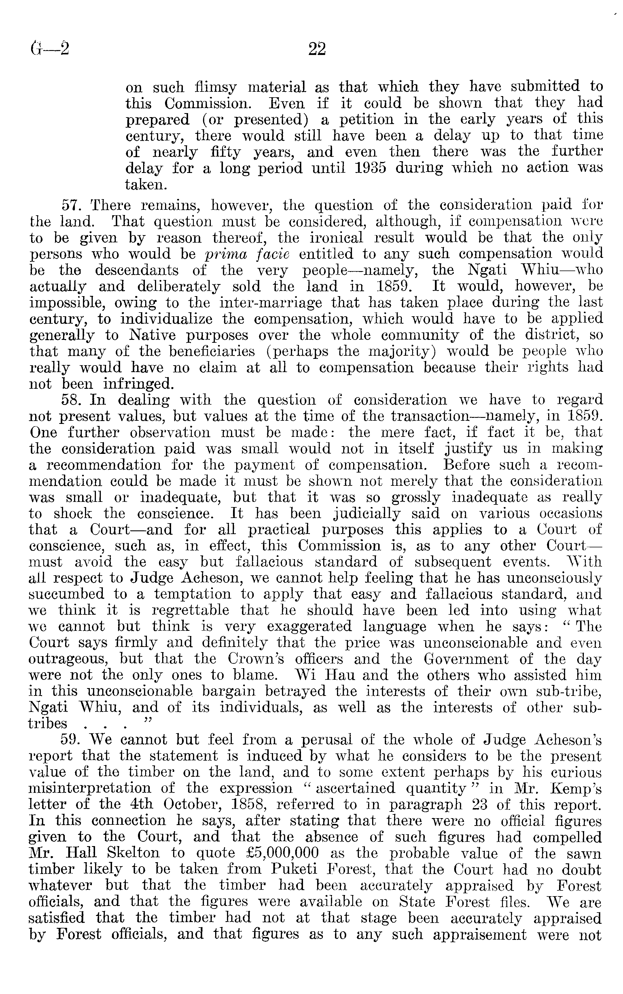 on such flimsy material as that which they have submitted to this Commission. Even if it could be shown that they had prepared (or presented) a petition in the early years of this century, there would still have been a delay up to that time of nearly fifty years, and even then there was the further delay for a long period until 1935 during which no action was taken. 57. There remains, however, the question of the consideration paid for the land. That question must be considered,- although, if compensation were to be given by reason thereof, the ironical result would be that the only persons who would be prima facie entitled to any such compensation would be the descendants of the very people—namely, the Ngati Whiu—who actually and deliberately sold the land in 1859. It would, however, be impossible, owing to the inter-marriage that has taken place during the last century, to individualize the compensation, which would have to be applied generally to Native purposes over the whole community of the district, so that many of the beneficiaries (perhaps the majority) would be people who really would have no claim at all to compensation because their rights had not been infringed. 58. In dealing with the question of consideration we have to regard not present values, but values at the time of the transaction—namely, in 1859. One further observation must be made: the mere fact, if fact it be, that the consideration paid was small would not in itself justify us in making a recommendation for the payment of compensation. Before such a recommendation could be made it must be shown not merely that the consideration was small or inadequate, but that it was so grossly inadequate as really to shock the conscience. It has been judicially said on various occasions that a Court —and for all practical purposes this applies to a Court of conscience, such as, in effect, this Commission is, as to any other Court—must avoid the easy but fallacious standard of subsequent events. With all respect to Judge Acheson, we cannot help feeling that he has unconsciously succumbed to a temptation to apply that easy and fallacious standard, and we think it is regrettable that he should have been led into using what we cannot but think is very exaggerated language when he says: " The Court says firmly and definitely that the price was unconscionable and even outrageous, but that the Crown's officers and the Government of the day were not the only ones to blame. Wi Hau and the others who assisted him in this unconscionable bargain betrayed the interests of their own sub-tribe, Ngati "Whiu, and of its individuals, as well as the interests of other subtribes ..." 59. We cannot but feel from a perusal of the whole of Judge Acheson's report that the statement is induced by what he considers to be the present value of the timber on the land, and to some extent perhaps by his curious misinterpretation of the expression " ascertained quantity" in Mr. Kemp's letter of the 4th October, 1858, referred to in paragraph 23 of this report. In this connection he says, after stating that there were no official figures given to the Court, and that the absence of such figures had compelled Mr. Hall Skelton to quote £5,000,000 as the probable value of the sawn timber likely to be taken from Puketi Forest, that the Court had no doubt whatever but that the timber had been accurately appraised by Forest officials, and that the figures were available on State Forest files. We are satisfied that the timber had not at that stage been accurately appraised by Forest officials, and that figures as to any such appraisement were not