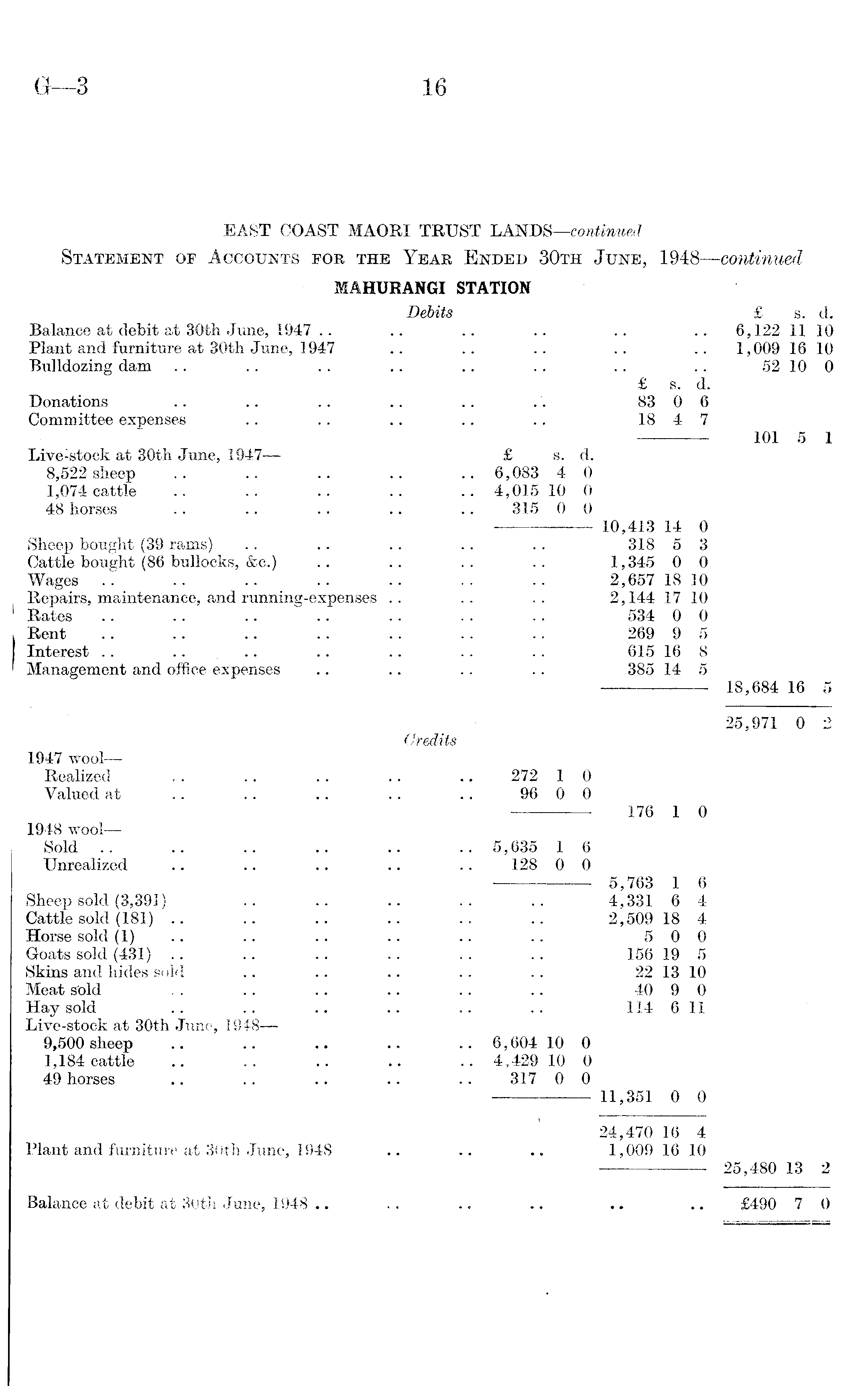 EAST COAST MAORI TRUST LANDS—continued Statement of Accounts for the Year Ended 30th June, 1948 —continued MAHURANGI STATION Debits £ s. d. Balance at debit at 30th June, 1947 .. .. .. .. .. .. 6,122 11 10 Plant and furniture at 30th June, 1947 .. .. .. .. .. 1,009 16 10 Bulldozing dam .. .. .. .. .. .. .. .. 52 10 0 £ s. d. Donations .. .. .. .. .. .. 83 0 6 Committee expenses .. .. .. .. .. 18 4 7 lOl 5 1 Livestock at 30th June, 1947 £ s. d. 8,522 sheep .. .. .. .. .. 6,083 4 0 1,074 cattle .. .. .. .. .. 4,015 10 0 48 horses .. .. .. .. .. 315 0 0 10,413 14 0 Sheep bought (39 rams) .. .. .. .. .. 318 5 3 . Cattle bought (86 bullocks, &c.) .. .. .. .. 1,345 0 0 ! Wages .. .. .. .. .. .. .. 2,657 18 10 j Repairs, maintenance, and running-expenses .. .. .. 2,144 17 10 ' Rates .. .. .. .. .. .. .. 534 0 0 t Rent .. .. .. .. .. .. .. 269 9 5 I Interest .. .. .. .. .. .. .. 615 16 8 ( Management and office expenses .. .. .. .. 385 14 5 18,684 16 5 25,971 0 2 Credits 1947 wool— Realized .. .. .. .. .. 272 1 0 Valued at .. .. .. .. .. 96 0 0 176 1 0 i 1948 wool — Sold .. .. .. V. .. .. 5,635 1 6 Unrealized .. .. .. .. .. 128 0 0 5,763 1 6 Sheep sold (3,391) .. .. .. .. .. 4,331 6 4 Cattle sold (181) .. .. .. .. .. .. 2,509 18 4 Horse sold (1) .. .. .. .. .. .. 5 0 0 Goats sold (431) .. .. .. .. .. .. 156 19 5 Skins and hides sold .. .. .. .. .. 22 13 10 Meat sold .. .. .. .. .. .. 40 9 0 Hay sold .. .. .. .. .. .. 114 6 11 Live-stock at 30th June, 1948 9,500 sheep .. .. .. .. .. 6,604 10 0 1,184 cattle .. .. .. .. .. 4,429 10 0 49 horses .. .. .. .. .. 317 0 0 11,351 0 0 24,470 16 4 Plant and furniture at 30th June, 1948 .. .. .. 1,009 16 10 25,480 13 2 Balance at debit at 30th June, 1948 .. .. .. .. .. .. £490 7 0