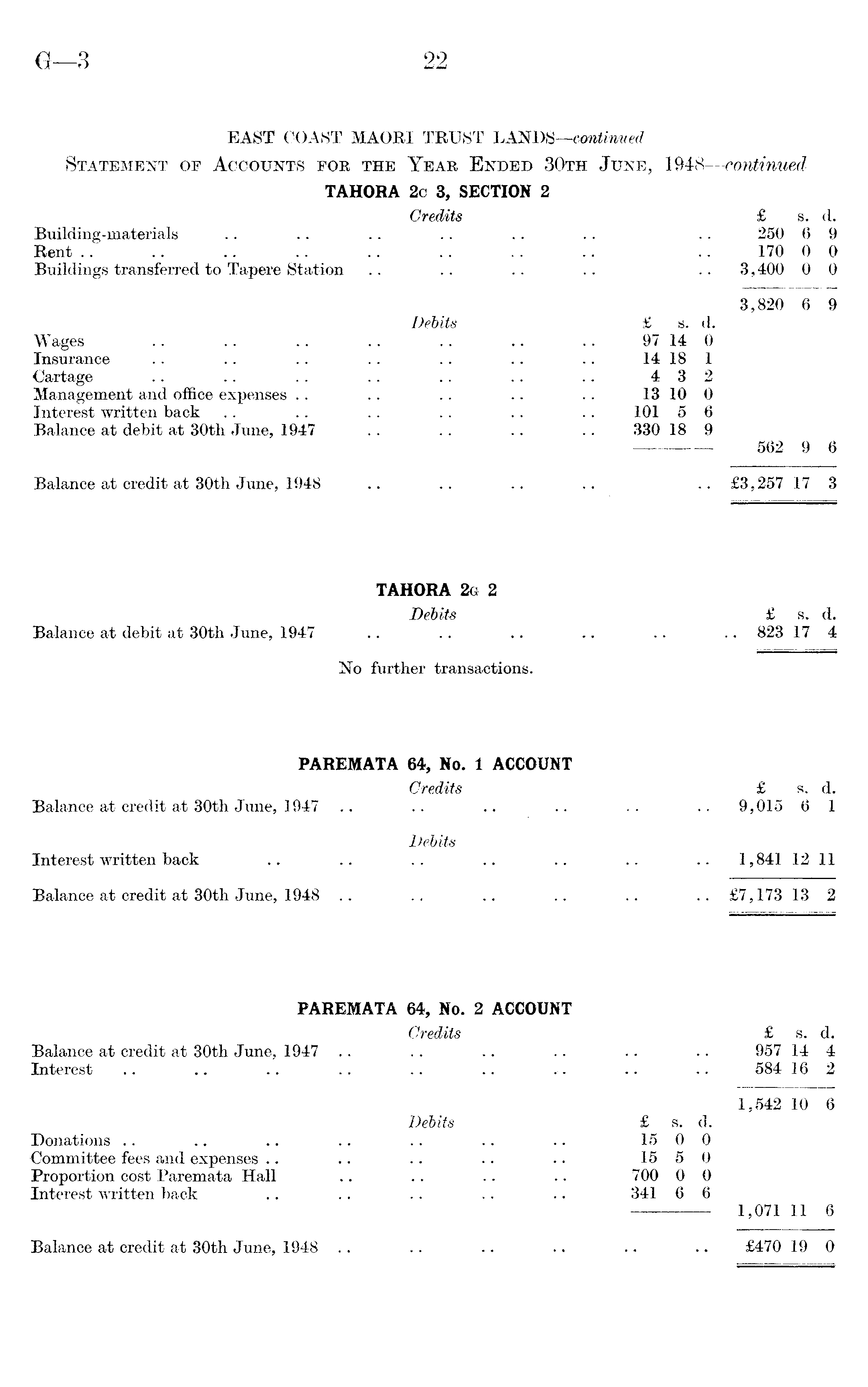 EAST COAST MAORI TRUST LANDS —continued Statement op Accounts for the Year Ended 30th June, 1948 —continued TAHORA 2c 3, SECTION 2 Credits £ s. d. Building-materials .. .. .. .. .. .. .. 250 6 9 Rent .. .. .. .. .. .. .. .. .. 170 0 0 Buildings transferred to Tapere Station .. .. .. .. .. 3,400 0 0 3,820 6 9 Debits £ s. d. Wages .. .. .. .. .. .. .. 97 14 0 Insurance .. .. .. .. .. .. .. 14 18 1 Cartage .... .. .. .. .. .. 432 Management and office expenses .. .. .. .. .. 13 10 0 Interest written back .. .. .. .. .. .. 101 5 6 Balance at debit at 30th June, 1947 .. .. .. .. 330 18 9 562 9 6 Balance at credit at 30th June, 1948 .. .. .. .. .. £3,257 17 3 TAHORA 2g 2 Debits £ s. d. Balance at debit at 30th June, 1947 .. .. .. .. .. .. 823 17 4 No further transactions. PAREMATA 64, No. 1 ACCOUNT Credits £ s. d. Balance at credit at 30th June, 1947 .. .. .. .. .. .. 9,015 6 1 Debits Interest written back .. .. .. .. .. .. .. 1,841 12 11 Balance at credit at 30th June, 1948 .. .. .. .. .. .. £7,173 13 2 PAREMATA 64, No. 2 ACCOUNT Credits £ s. d. Balance at credit at 30th June, 1947 .. .. .. .. .. .. 957 14 4 Interest .. .. .. .. .. .. ~ .. .. 584 16 2 1,542 10 6 Debits £ s. d. Donations .. .. .. .. .. .. .. 15 0 0 Committee fees and expenses .. .. .. .. .. 15 5 0 Proportion cost Paremata Hall .. .. .. .. 700 0 0 Interest written back .. .. .. .. .. 341 6 6 1,071 11 6 Balance at credit at 30th June, 1948 . . .. .. .. .. .. £470 19 0