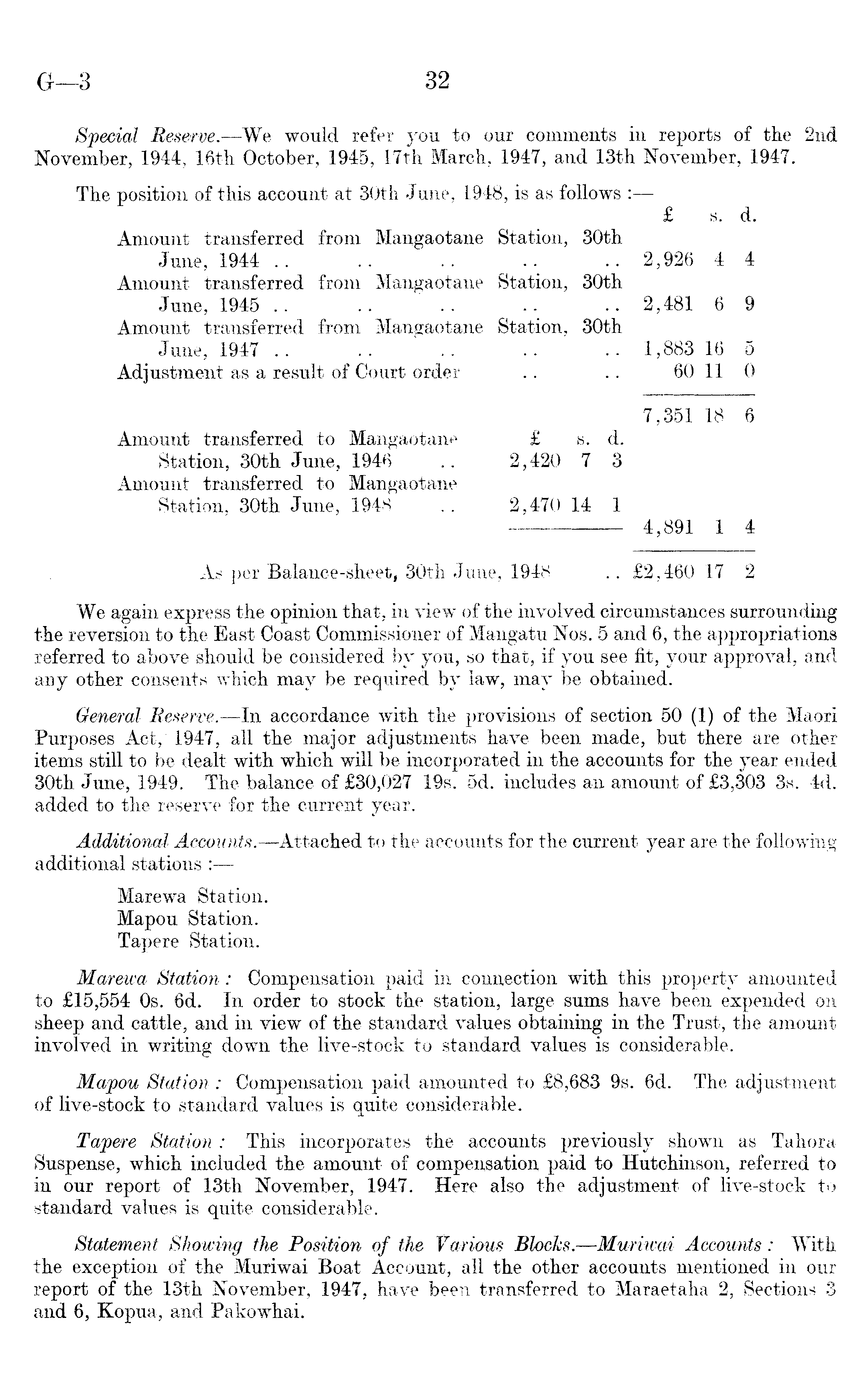 Special Reserve. —We would refer you to our comments in reports of the 2nd November, 1944, 16th October, 1945, 17th March, 1947, and 13th November, 1947. The position of this account at 30th June, 1948, is as follows : £ s. d. Amount transferred from Mangaotane Station, 30th June, 1944 .. .. .. .. .. 2,926 4 4 Amount transferred from Mangaotane Station, 30th June, 1945 .. .. .. .. .. 2,481 6 9 Amount transferred from Mangaotane Station, 30th June, 1947 .. .. .. .. .. 1,883 16 5 Adjustment as a result of Court order .. .. 60 11 0 7,351 18 6 Amount transferred to Mangaotane £ s. d. Station, 30th June, 1946 .. 2,420 7 3 Amount transferred to Mangaotane Station, 30th June, 1948 .. 2,470 14 1 4,891 1 4 As per Balance-sheet, 30th June, 1948 .. £2,460 17 2 We again express the opinion that, in view of the involved circumstances surrounding the reversion to the East Coast Commissioner of Mangatu Nos. 5 and 6, the appropriations referred to above should be considered by you, so that, if you see fit, your approval, and any other consents which may be required by law, may be obtained. General Reserve.—ln accordance with the provisions of section 50 (1) of the Maori Purposes Act, 1947, all the major adjustments have been made, but there are other items still to be dealt with which will be incorporated in the accounts for the year ended 30th June, 1949. The balance of £30,027 19s. sd. includes an amount of £3,303 3s. 4d. added to the reserve for the current year. Additional Accounts. —Attached to the accounts for the current year are the following additional stations : Marewa Station. Mapou Station. Tapere Station. Marewa Station : Compensation paid in connection with this property amounted to £15,554 os. 6d. In order to stock the station, large sums have been expended on sheep and cattle, and in view of the standard values obtaining in the Trust, the amount involved in writing down the live-stock to standard values is considerable. Ma-pou Station : Compensation paid amounted to £8,683 9s. 6d. The adjustment of live-stock to standard values is quite considerable. Tapere Station: This incorporates the accounts previously shown as Tahora Suspense, which included the amount of compensation paid to Hutchinson, referred to in our report of 13th November, 1947. Here also the adjustment of live-stock to standard values is quite considerable. Statement Showing the Position of the Various Blocks.—Muriwai Accounts: With the exception of the Muriwai Boat Account, all the other accounts mentioned in our report of the 13th November, 1947, have been transferred to Maraetaha 2, Sections 3 and 6, Kopua, and Pakowhai.
