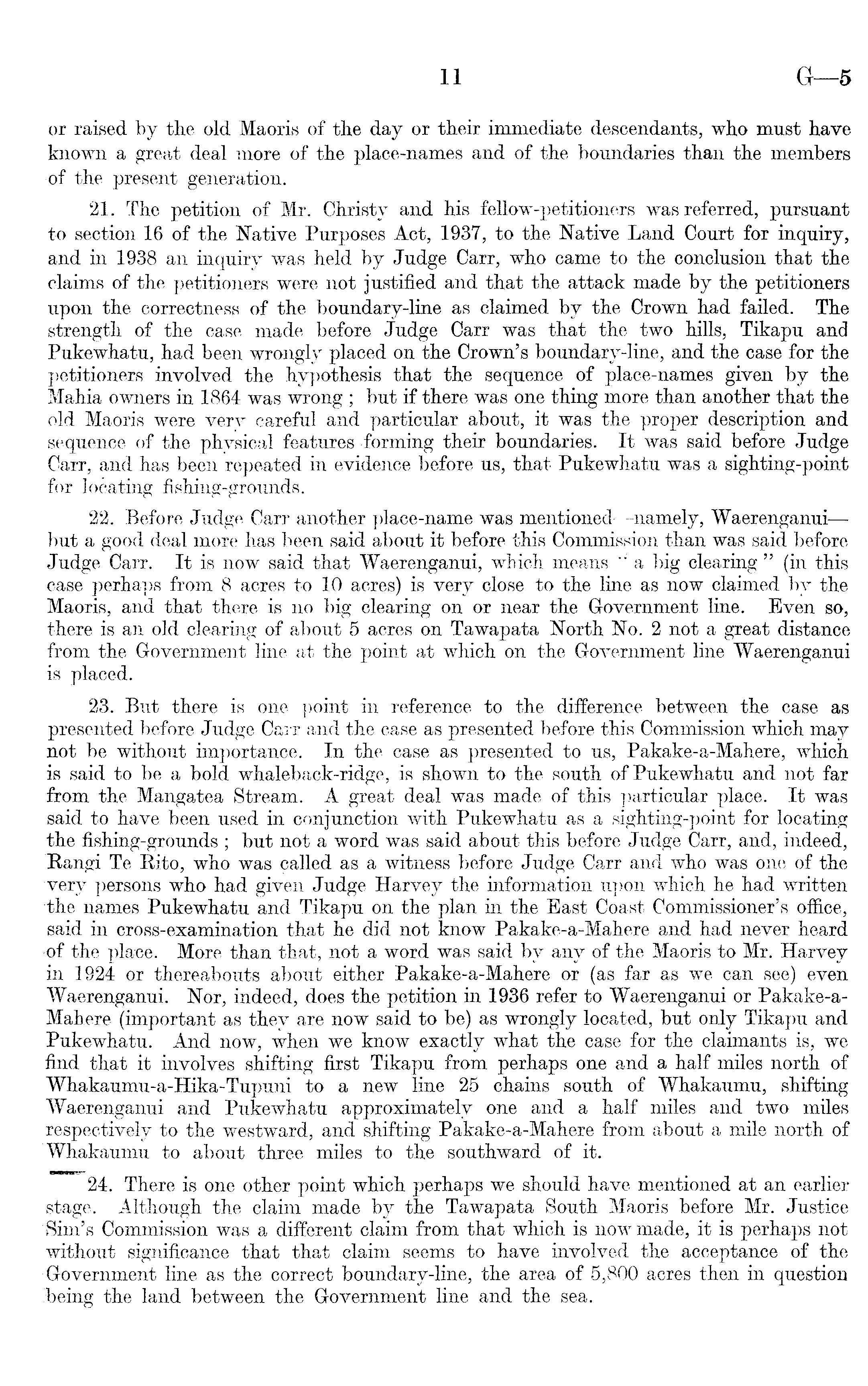 or raised by the old Maoris of the day or their immediate descendants, who must have known a great deal more of the place-names and of the boundaries than the members -of the present generation. 21. The petition of Mr. Christy and his fellow-petitioners was referred, pursuant to section 16 of the Native Purposes Act, 1937, to the Native Land Court for inquiry, and in 1938 an inquiry was held by Judge Carr, who came to the conclusion that the claims of the petitioners were not justified and that the attack made by the petitioners upon the correctness of the boundary-line as claimed by the Crown had failed. The strength of the case made before Judge Carr was that the two hills, Tikapu and Pukewhatu, had been wrongly placed on the Crown's boundary-line, and the case for the petitioners involved the hypothesis that the sequence of place-names given by the Mahia owners in 1864 was wrong ; but if there was one thing more than another that the old Maoris were very careful and particular about, it was the proper description and sequence of the physical features forming their boundaries. It was said before Judge Carr, and has been repeated in evidence before us, that Pukewhatu was a sighting-point for locating fishing-grounds. 22. Before Judge Carr another place-name was mentioned —namely, Waerenganui—but a good deal more has been said about it before this Commission than was said before Judge Carr. It is now said that Waerenganui, which means " a big clearing " (in this case perhaps from 8 acres to 10 acres) is very close to the line as now claimed by the Maoris, and that there is no big clearing on or near the Government line. Even so, there is an old clearing of about 5 acres on Tawapata North No. 2 not a great distance from the Government line at the point at which on the Government line Waerenganui is placed. 23. But there is one point in reference to the difference between the case as presented before Judge Carr and the case as presented before this Commission which may not be without importance. In the case as presented to us, Pakake-a-Mahere, which is said to be a bold whaleback-ridge, is shown to the south of Pukewhatu and not far from the Mangatea Stream. A great deal was made of this particular place. It was said to have been used in conjunction with Pukewhatu as a sighting-point for locating the fishing-grounds ; but not a word was said about this before Judge Carr, and, indeed, Rangi Te Rito, who was called as a witness before Judge Carr and who was one of the very persons who had given Judge Harvey the information upon which he had written i:he names Pukewhatu and Tikapu on the plan in the East Coast Commissioner's office, said in cross-examination that he did not know Pakake-a-Mahere and had never heard of the place. More than that, not a word was said by any of the Maoris to Mr. Harvey in 1924 or thereabouts about either Pakake-a-Mahere or (as far as we can see) even Waerenganui. Nor, indeed, does the petition in 1936 refer to Waerenganui or Pakake-a-Mahere (important as they are now said to be) as wrongly located, but only Tikapu and Pukewhatu. And now, when we know exactly what the case for the claimants is, we find that it involves shifting first Tikapu from perhaps one and a half miles north of Whakaumu-a-Hika-Tupuni to a new line 25 chains south of Whakaumu, shifting Waerenganui and Pukewhatu approximately one and a half miles and two miles respectively to the westward, and shifting Pakake-a-Mahere from about a mile north of Whakaumu to about three miles to the southward of it. 24. There is one other point which perhaps we should have mentioned at an earlier stage. Although the claim made by the Tawapata South Maoris before Mr. Justice Sim's Commission was a different claim from that which is now made, it is perhaps not without significance that that claim seems to have involved the acceptance of the 'Government line as the correct boundary-line, the area of 5,800 acres then in question Sbeing the land between the Government line and the sea.