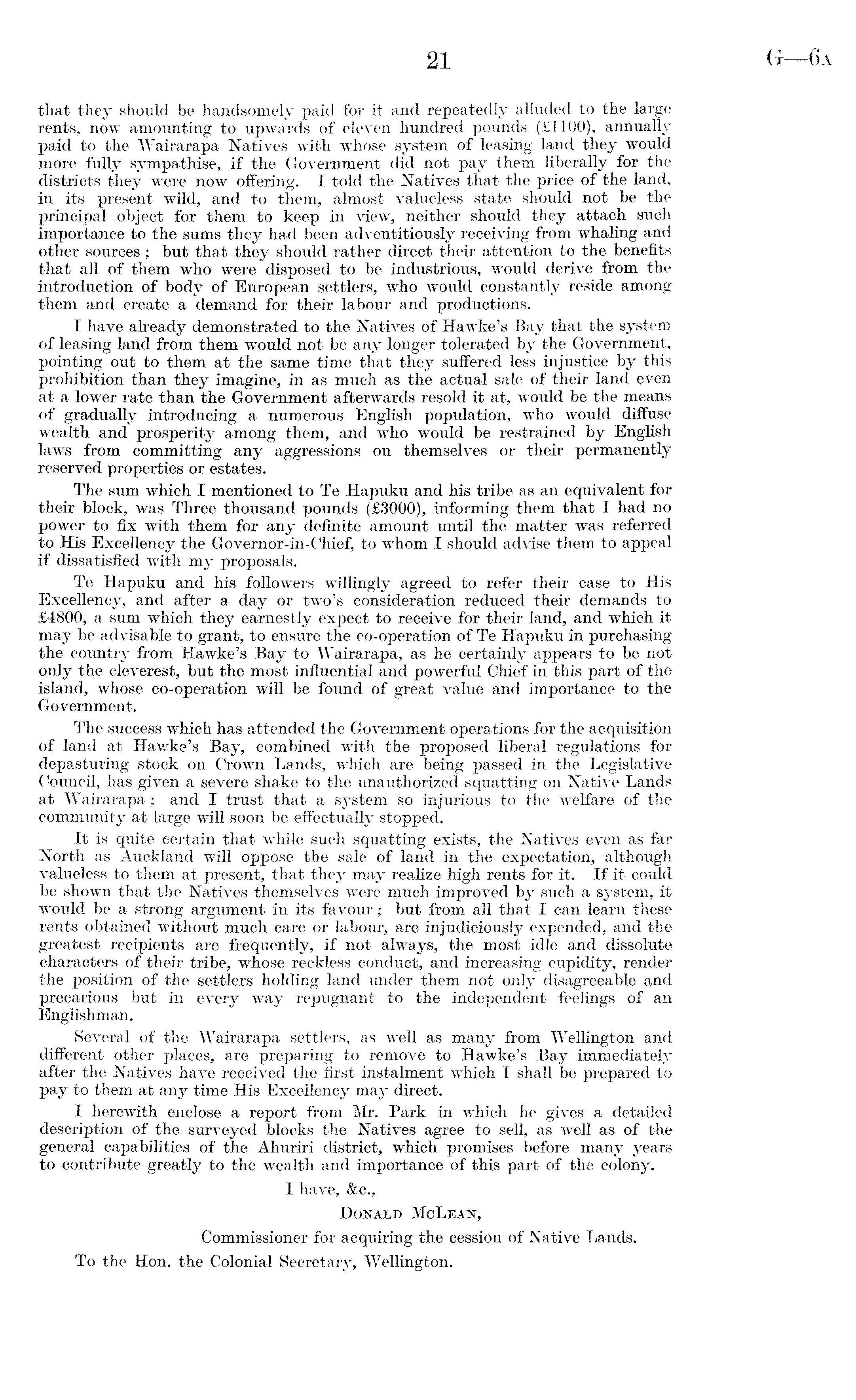 that they should be handsomely paid for it and repeatedly alluded to the large rents, now amounting to upwards of eleven hundred pounds (£1100), annually paid to the Wairarapa Natives with whose system of leasing land they would more fully sympathise, if the Government did not pay them liberally for the districts they were now offering. I told the Natives that the price of the land, in its present wild, and to them, almost valueless state should not be the principal object for them to keep in view, neither shoidd they attach such importance to the sums they had been adventitiously receiving from whaling and other sources ; but that they should rather direct their attention to the benefits that all of them who were disposed to be industrious, would derive from the introduction of body of European settlers, who would constantly reside among them and create a demand for their labour and productions. I have already demonstrated to the Natives of Hawke's Bay that the system of leasing land from them would not be any longer tolerated by the Government, pointing out to them at the same time that they suffered less injustice by this prohibition than they imagine, in as much as the actual sale of their land even at a lower rate than the Government afterwards resold it at, would be the means of gradually introducing a numerous English population, who would diffuse wealth and prosperity among them, and who would be restrained by English laws from committing any aggressions on themselves or their permanently reserved properties or estates. The sum which I mentioned to Te Hapuku and his tribe as an equivalent for their block, was Three thousand pounds (£3000), informing them that I had no power to fix with them for any definite amount until the matter was referred to His Excellency the Governor-in-Chief, to whom I should advise them to appeal if dissatisfied with my proposals. Te Hapuku and his followers willingly agreed to refer their case to His Excellency, and after a day or two's consideration reduced their demands to £4BOO, a sum which they earnestly expect to receive for their land, and which it may be advisable to grant, to ensure the co-operation of Te Hapuku in purchasing the country from Hawke's Bay to Wairarapa, as he certainly appears to be not only the cleverest, but the most influential and powerful Chief in this part of the island, whose co-operation will be found of great value and importance to the Government. The success which has attended the Government operations for the acquisition of land at Hawke's Bay, combined with the proposed liberal regulations for depasturing stock on Crown Lands, which are being passed in the Legislative Council, has given a severe shake to the unauthorized squatting on Native Lands at Wairarapa; and I trust that a system so injurious to the welfare of the community at large will soon be effectually stopped. It is quite certain that while such squatting exists, the Natives even as far North as Auckland will oppose the sale of land in the expectation, although valueless to them at present, that they may realize high rents for it. If it could be shown that the Natives themselves were much improved by such a system, it would be a strong argument in its favour; but from all that I can learn these rents obtained without much care or labour, are injudiciously expended, and the greatest recipients are frequently, if not always, the most idle and dissolute characters of their tribe, whose reckless conduct, and increasing cupidity, render the position of the settlers holding land under them not only disagreeable and precarious but in every way repugnant to the independent feelings of an Englishman. Several of the Wairarapa settlers, as well as many from Wellington and different other places, are preparing to remove to Hawke's Bay immediately after the Natives have received the first instalment which I shall be prepared to pay to them at any time His Excellency may direct. I herewith enclose a report from Mr. Park in which he gives a detailed description of the surveyed blocks the Natives agree to sell, as well as of the general capabilities of the Ahuriri district, which promises before many years to contribute greatly to the wealth and importance of this part of the colony. I have, &c, Donald McLean, Commissioner for acquiring the cession of Native Lands. To the Hon. the Colonial Secretary, Wellington.