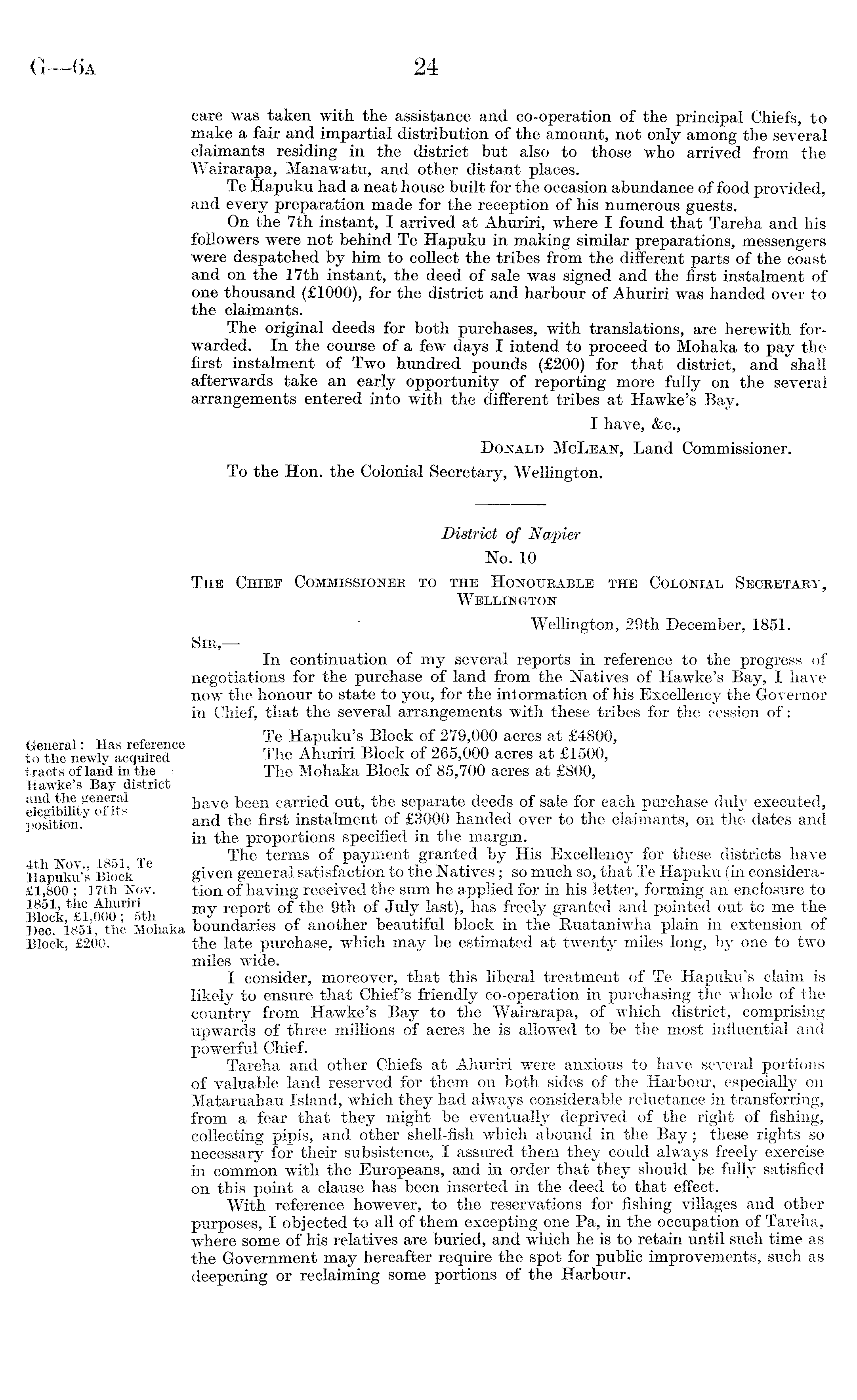 District of Napier No. 10 The Chief Commissioner to the Honourable the Colonial Secretary, Wellington Wellington, 29th December, 1851. Sir,—In continuation of my several reports in reference to the progress of negotiations for the purchase of land from the Natives of Hawke's Bay, I have now the honour to state to you, for the ini ormation of his Excellency the Governor in Chief, that the several arrangements with these tribes for the cession of: Te Hapuku's Block of 279,000 acres at £4BOO, The Ahuriri Block of 265,000 acres at £l5OO, The Mohaka Block of 85,700 acres at £BOO, have been carried out, the separate deeds of sale for each purchase duly executed, and the first instalment of £3OOO handed over to the claimants, on the dates and in the proportions specified in the margin. The terms of payment granted by His Excellency for these districts have given general satisfaction to the Natives; so much so, that Te Hapuku (in consideration of having received the sum he applied for in his letter, forming an enclosure to my report of the 9th of July last), has freely granted and pointed out to me the boundaries of another beautiful block in the Ruataniwha plain in extension of the late purchase, which may be estimated at twenty miles long, by one to two miles wide. I consider, moreover, that this liberal treatment of Te Hapuku's claim is likely to ensure that Chief's friendly co-operation in purchasing the whole of the country from Hawke's Bay to the Wairarapa, of which district, comprising upwards of three millions of acres he is allowed to be the most influential and powerful Chief. Tareha and other Chiefs at Ahuriri were anxious to have several portions of valuable land reserved for them on both sides of the Harbour, especially on Mataruahau Island, which they had always considerable reluctance in transferring, from a fear that they might be eventually deprived of the right of fishing, collecting pipis, and other shell-fish which abound in the Bay; these rights so necessary for their subsistence, I assured them they could always freely exercise in common with the Europeans, and in order that they should be fully satisfied on this point a clause has been inserted in the deed to that effect. With reference however, to the reservations for fishing villages and other purposes, I objected to all of them excepting one Pa, in the occupation of Tareha, where some of his relatives are buried, and which he is to retain until such time as the Government may hereafter require the spot for public improvements, such as deepening or reclaiming some portions of the Harbour.