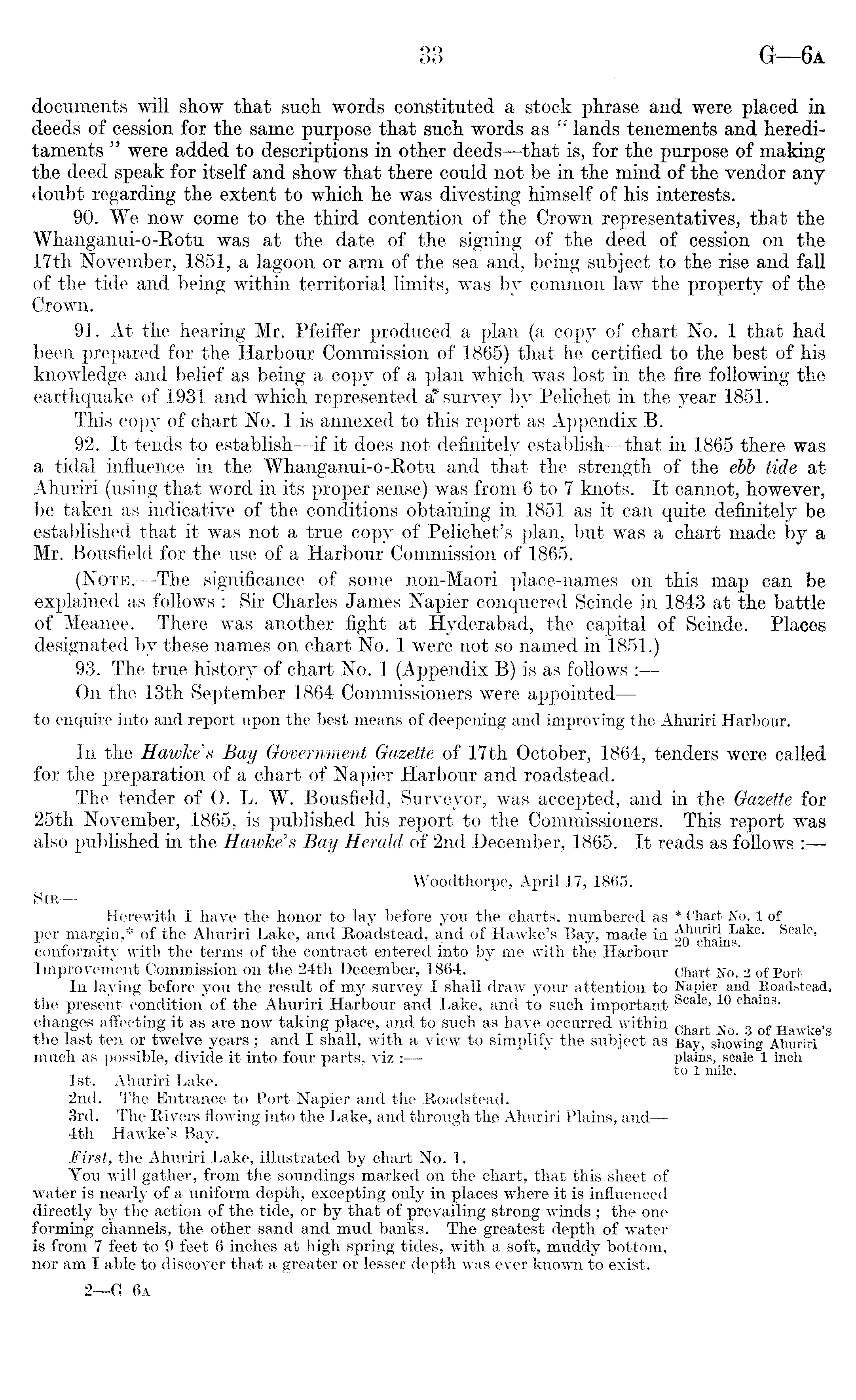 documents will show that such words constituted a stock phrase and were placed in deeds of cession for the same purpose that such words as " lands tenements and hereditaments " were added to descriptions in other deeds—that is, for the purpose of making the deed speak for itself and show that there could not be in the mind of the vendor any doubt regarding the extent to which he was divesting himself of his interests. 90. We now come to the third contention of the Crown representatives, that the Whanganui-o-Rotu was at the date of the signing of the deed of cession on the 17th November, 1851, a lagoon or arm of the sea and, being subject to the rise and fall of the tide and being within territorial limits, was by common law the property of the Crown. 91. At the hearing Mr. Pfeiffer produced a plan (a copy of chart No. 1 that had been prepared for the Harbour Commission of 1865) that he certified to the best of his knowledge and belief as being a copy of a plan Avhich was lost in the fire following the earthquake of 1931 and which represented a* survey by Pelichet in the year 1851. This copy of chart No. 1 is annexed to this report as Appendix B. 92. It tends to establish —if it does not definitely establish —that in 1865 there was a tidal influence in the Whanganui-o-Rotu and that the strength of the ebb tide at Ahuriri (using that word in its proper sense) was from 6to 7 knots. It cannot, however, be taken as indicative of the conditions obtaining in 1851 as it can quite definitely be established that it was not a true copy of Pelichet's plan, but was a chart made by a Mr. Bousfield for the use of a Harbour Commission of 1865. (Note. —The significance of some non-Maori place-names on this map can be explained as follows : Sir Charles James Napier conquered Scinde in 1843 at the battle of Meanee. There was another fight at Hyderabad, the capital of Scinde. Places designated by these names on chart No. 1 were not so named in 1851.) 93. The true history of chart No. 1 (Appendix B) is as follows : On the 13th September 1864 Commissioners were appointed —• to enquire into and report upon the best means of deepening and improving the Ahuriri Harbour. In the Hawke's Bay Government Gazette of 17th October, 1864, tenders were called for the. preparation of a chart of Napier Harbour and roadstead. The tender of 0. L. W. Bousfield, Surveyor, was accepted, and in the Gazette for 25th November, 1865, is published his report to the Commissioners. This report was also published in the Hawke's Bay Herald of 2nd December, 1865. It reads as follows : Woodthorpe, April 17, 1865. Sir—