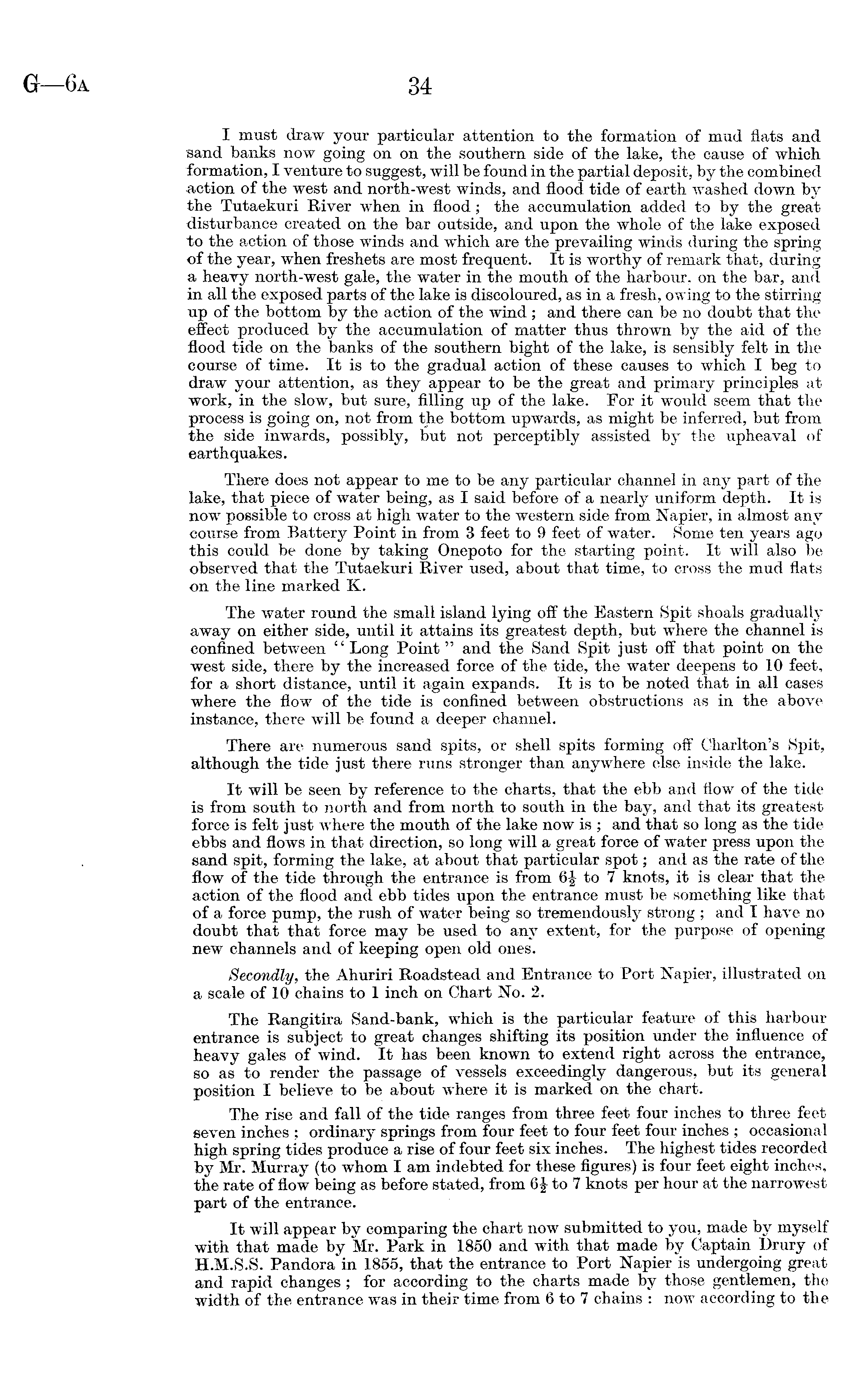I must draw your particular attention to the formation of mud flats and sand banks now going on on the southern side of the lake, the cause of which formation, I venture to suggest, will be found in the partial deposit, by the combined action of the west and north-west winds, and flood tide of earth washed down by the Tutaekuri River when in flood; the accumulation added to by the great disturbance created on the bar outside, and upon the whole of the lake exposed to the a,ction of those winds and which are the prevailing winds during the spring of the year, when freshets are most frequent. It is worthy of remark that, during a heavy north-west gale, the water in the mouth of the harbour, on the bar, and in all the exposed parts of the lake is discoloured, as in a fresh, owing to the stirring up of the bottom by the action of the wind ; and there can be no doubt that the effect produced by the accumulation of matter thus thrown by the aid of the flood tide on the banks of the southern bight of the lake, is sensibly felt in the course of time. It is to the gradual action of these causes to which I beg to draw your attention, as they appear to be the great and primary principles at work, in the slow, but sure, filling up of the lake. For it would seem that the process is going on, not from the bottom upwards, as might be inferred, but from the side inwards, possibly, but not perceptibly assisted by the iipheaval of earthquakes. There does not appear to me to be any particular channel in any part of the lake, that piece of water being, as I said before of a nearly uniform depth. It is now possible to cross at high water to the western side from Napier, in almost any course from Battery Point in from 3 feet to 9 feet of water. Some ten years ago this could be done by taking Onepoto for the starting point. It will also be observed that the Tutaekuri River used, about that time, to cross the mud flats on the line marked K. The water round the small island lying off the Eastern Spit shoals gradually away on either side, until it attains its greatest depth, but where the channel is confined between " Long Point" and the Sand Spit just off that point on the west side, there by the increased force of the tide, the water deepens to 10 feet, for a short distance, until it again expands. It is to be noted that in all cases where the flow of the tide is confined between obstructions as in the above instance, there will be found a deeper channel. There are numerous sand spits, or shell spits forming off Charlton's Spit, although the tide just there runs stronger than anywhere else inside the lake. It will be seen by reference to the charts, that the ebb and flow of the tide is from south to north and from north to south in the bay, and that its greatest force is felt just where the mouth of the lake now is ; and that so long as the tide ebbs and flows in that direction, so long will a great force of water press upon the sand spit, forming the lake, at about that particular spot; and as the rate of the flow of the tide throiigh the entrance is from 6J to 7 knots, it is clear that the action of the flood and ebb tides upon the entrance must be something like that of a force pump, the rush of water being so tremendously strong ; and I have no doubt that that force may be used to any extent, for the purpose of opening new channels and of keeping open old ones. Secondly, the Ahuriri Roadstead and Entrance to Port Napier, illustrated on a scale of 10 chains to 1 inch on Chart No. 2. The Rangitira Sand-bank, which is the particular feature of this harbour entrance is subject to great changes shifting its position under the influence of heavy gales of wind. It has been known to extend right across the entrance, so as to render the passage of vessels exceedingly dangerous, but its general position I believe to be about where it is marked on the chart. The rise and fall of the tide ranges from three feet four inches to three feet seven inches ; ordinary springs from four feet to four feet four inches ; occasional high spring tides produce a rise of four feet six inches. The highest tides recorded by Mr. Murray (to whom I am indebted for these figures) is four feet eight inches, the rate of flow being as before stated, from 6£ to 7 knots per hour at the narrowest part of the entrance. It will appear by comparing the chart now submitted to you, made by myself with that made by Mr. Park in 1850 and with that made by Captain Drury of H.M.S.S. Pandora in 1855, that the entrance to Port Napier'is undergoing great and rapid changes ; for according to the charts made by those gentlemen, the width of the entrance was in their time from 6to 7 chains : now according to the