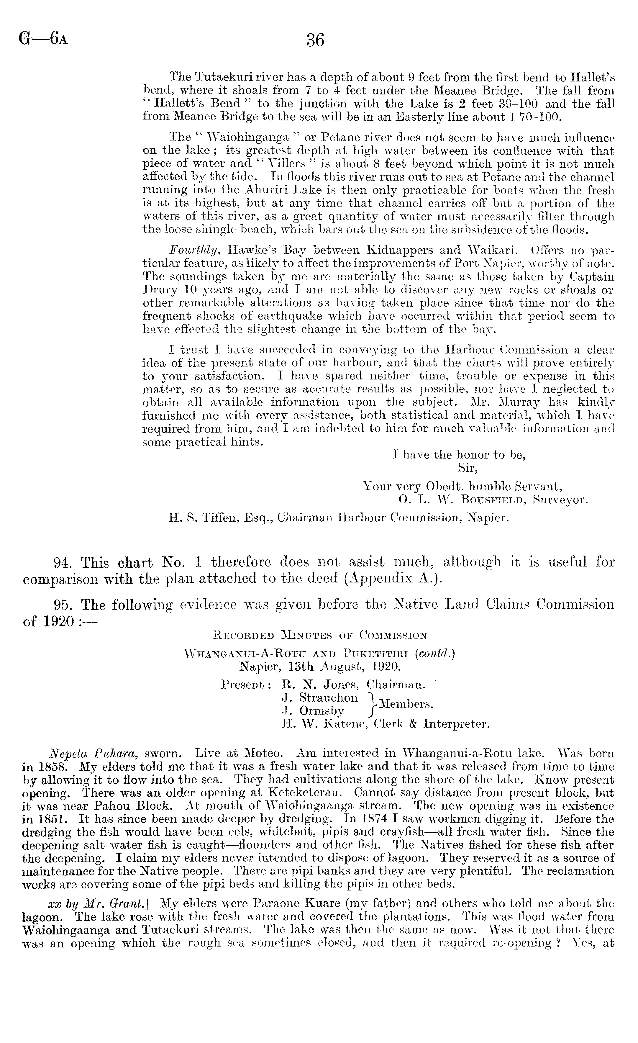 The Tutaekuri river has a depth of about 9 feet from the first bend to Hallet's bend, where it shoals from 7to 4 feet under the Meanee Bridge. The fall from " Hallett's Bend " to the junction with the Lake is 2 feet 39-100 and the fall from Meanee Bridge to the sea will be in an Easterly line about 1 70-100. The " Waiohinganga " or Petane river does not seem to have much influence on the lake; its greatest depth at high water between its confluence with that piece of water and " Villers " is about 8 feet beyond which point it is not much affected by the tide. In floods this river runs out to sea at Petane and the channel running into the Ahuriri Lake is then only practicable for boats when the fresh is at its highest, but at any time that channel carries off but a portion of the waters of this river, as a great quantity of water must necessarily filter through the loose shingle beach, which bars out the sea on the subsidence of the floods. Fourthly, Hawke's Bay between Kidnappers and Waikari. Offers no particular feature, as likely to affect the improvements of Port Napier, worthy of note. The soundings taken by me are materially the same as those taken by Captain Drury 10 years ago, and I am not able to discover any new rocks or shoals or other remarkable alterations as having taken place since that time nor do the frequent shocks of earthquake which have occurred within that period seem to have effected the slightest change in the bottom of the bay. I trust I have succeeded in conveying to the Harbour Commission a clear idea of the present state of our harbour, and that the charts will prove entirely to your satisfaction. I have spared neither time, trouble or expense in this matter, so as to secure as accurate results as possible, nor have I neglected to obtain all available information upon the subject.- Mr. Murray has kindly furnished me with every assistance, both statistical and material, which I have required from him, and I am indebted to him for much valuable information and some practical hints. I have the honor to be, Sir, Your very Obedt. humble Servant, O. L. W. Bousfield, Surveyor. H. S. Tiffen, Esq., Chairman Harbour Commission, Napier. 94. This chart No. 1 therefore does not assist much, although it is useful for comparison with the plan attached to the deed (Appendix A.). 95. The folio whig evidence was given before the Native Land Claims Commission of 1920 : Recorded Minutes of Commission Whanganui-A-Rotu and Puketitiri (contd.) Napier, 13th August, 1920. Present: Pv. N. Jones, Chairman. J. Strauchon l, r , J. Ormsby /Members. H. W. Katene, Clerk & Interpreter. Nepetu Puhara, sworn. Live at Moteo. Am interested in Whanganui-a-Rotu lake. Was born in 1858. My elders told me that it was a fresh water lake and that it was released from time to time by allowing it to flow into the sea. They had cultivations along the shore of the lake. Know present opening. There was an older opening at Keteketerau. Cannot say distance from present block, but it was near Pahou Block. At mouth of Waiohingaanga stream. The new opening was in existence in 1851. It has since been made deeper by dredging. In 1874 I saw workmen digging it. Before the dredging the fish would have been eels, whitebait, pipis and crayfish—all fresh water fish. Since the deepening salt water fish is caught—flounders and other fish. The Natives fished for these fish after the deepening. I claim my elders never intended to dispose of lagoon. They reserved it as a source of maintenance for the Native people. There are pipi banks and they are very plentiful. The reclamation works are covering some of the pipi beds and killing the pipis in other beds. xx by Mr. Grant.'] My elders were Paraone Kuare (my father) and others who told me about the lagoon. The lake rose with the fresh water and covered the plantations. This was flood Avater from Waiohingaanga and Tutaekuri streams. The lake was then the same as now. Was it not that there was an opening which the rough sea sometimes closed, and then it required re-opening ? Yes, at