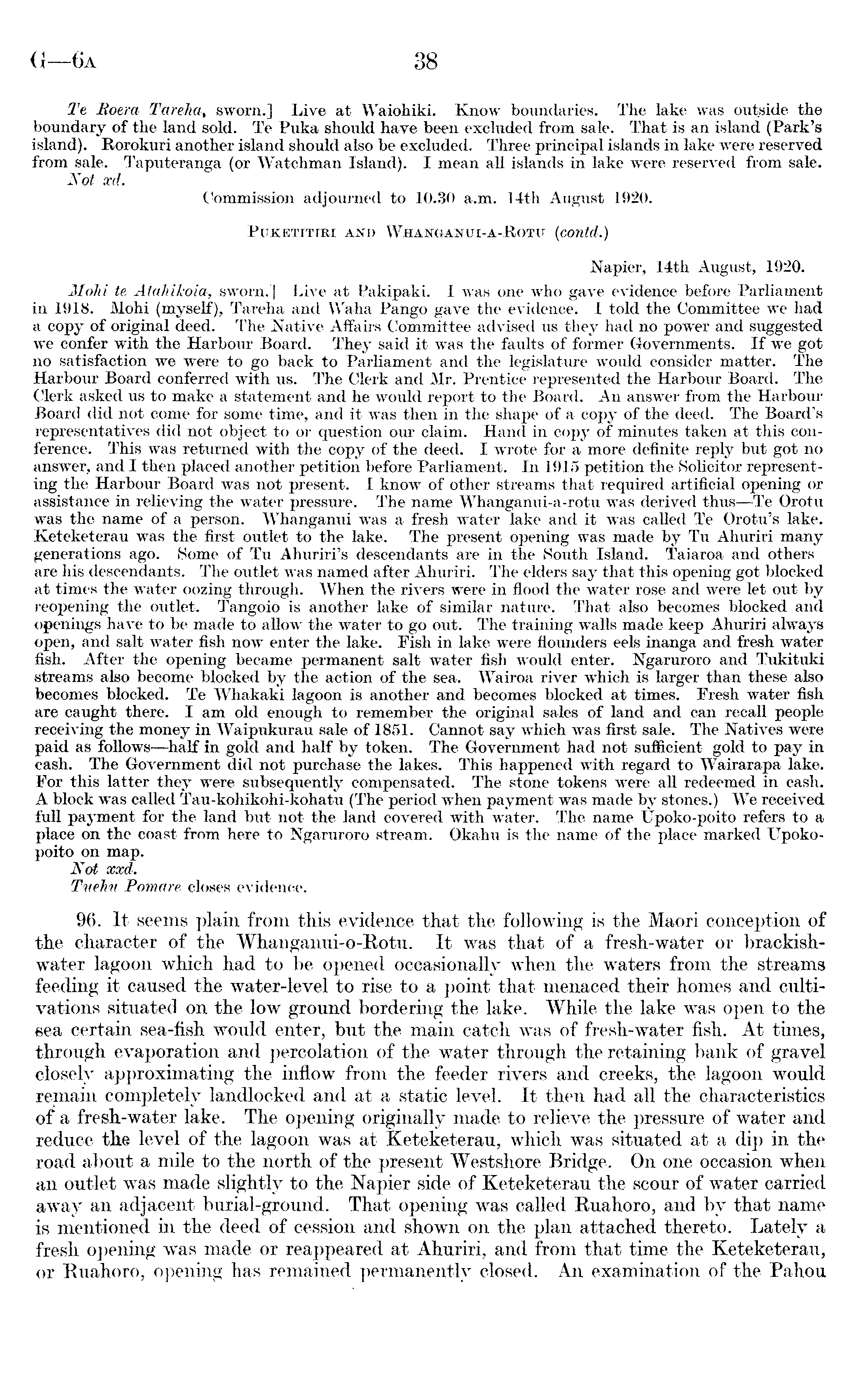 Te Roera Tareha, sworn.] Live at Waiohiki. Know boundaries. The lake was outside the boundary of the land sold. Te Puka shotdd have been excluded from sale. That is an island (Park's island). Rorokuri another island should also be excluded. Three principal islands in lake were reserved from sale. Taputeranga (or Watchman Island). I mean all islands in lake were reserved from sale. Not xd. Commission adjourned to 10.30 a.m. 14th August 1920. Ptjketitiri and Whanganui-a-Rotu (contd.) Napier, 14th August, 1920. 2lohi te Atahikoia, sworn.] Live at Pakipaki. I was one who gave evidence before Parliament in 1918. Mohi (myself), Tareha and Waha Pango gave the evidence. I told the Committee we had a copy of original deed. The Native Affairs Committee advised us they had no power and suggested we confer with the Harbour Board. They said it was the faults of former Governments. If we got no satisfaction we were to go back to Parliament and the legislature would consider matter. The Harbour Board conferred with us. The Clerk and Mr. Prentice represented the Harbour Board. The Clerk asked us to make a statement and he would report to the Board. An answer from the Harbour Board did not come for some time, and it was then in the shape of a copy of the deed. The Board's representatives did not object to or question our claim. Hand in copy of minutes taken at this conference. This was returned with the copy of the deed. I wrote for a more definite reply but got no answer, and I then placed another petition before Parliament. In 1915 petition the Solicitor representing the Harbour Board was not present. I know of other streams that required artificial opening or assistance in relieving the water pressure. The name Whanganui-a-rotu was derived thus—Te Orotu was the name of a person. Whanganui was a fresh water lake and it was called Te Orotu's lake. Keteketerau was the first outlet to the lake. The present opening was made by Tu Ahuriri many generations ago. Some of Tu Ahuriri's descendants are in the South Island. Taiaroa and others are his descendants. The outlet was named after Ahuriri. The elders say that this opening got blocked at times the water oozing through. When the rivers were in flood the water rose and were let out by reopening the outlet. Tangoio is another lake of similar nature. That also becomes blocked and openings have to be made to allow the water to go out. The training walls made keep Ahuriri always open, and salt water fish now enter the lake. Fish in lake were flounders eels inanga and fresh water fish. After the opening became permanent salt Avater fish would enter. Ngaruroro and Tukituki streams also become blocked by the action of the sea. Wairoa river which is larger than these also becomes blocked. Te Whakaki lagoon is another and becomes blocked at times. Fresh water fish are caught there. I am old enough to remember the original sales of land and can recall people receiving the money in Waipukurau sale of 1851. Cannot say which was first sale. The Natives were paid as follows —half in gold and half by token. The Government had not sufficient gold to pay in cash. The Government did not purchase the lakes. This happened with regard to Wairarapa lake. For this latter they were subsequently compensated. The stone tokens were all redeemed in cash. A block was called Tau-kohikohi-kohatu (The period when payment was made by stones.) We received full payment for the land but not the land covered Avith water. The name Upoko-poito refers to a place on the coast from here to Ngaruroro stream. Okahu is the name of the place marked Upokopoito on map. Not xxd. Tuehn Pomare closes evidence. 96. It seems plain from this evidence that the following is the Maori conception of the character of the Whanganui-o-Rotu. It was that of a fresh-water or brackishwater lagoon which had to be ojiened occasionally when the waters from the streams feeding it caused the water-level to rise to a point that menaced their homes and cultivations situated on the low ground bordering the lake. While the lake was open to the sea certain sea-fish would enter, but the main catch was of fresh-water fish. At times, through evaporation and percolation of the w r ater through the retaining bank of gravel closely approximating the inflow T from the feeder rivers and creeks, the lagoon would remain completely landlocked and at a static level. It then had all the characteristics of a fresh-water lake. The opening originally made to relieve the pressure of water and reduce the level of the lagoon was at Keteketerau, which was situated at a dip in the road about a mile to the north of the present Westshore Bridge. On one occasion when an outlet was made slightly to the Napier side of Keteketerau the scour of w T ater carried away an adjacent burial-ground. That opening was called Ruahoro, and by that name is mentioned, in the deed of cession and shown on the plan attached thereto. Lately a fresh opening was made or reappeared at Ahuriri, and from that time the Keteketerau, or Ruahoro, opening has remained permanently closed. An examination of the Pahou