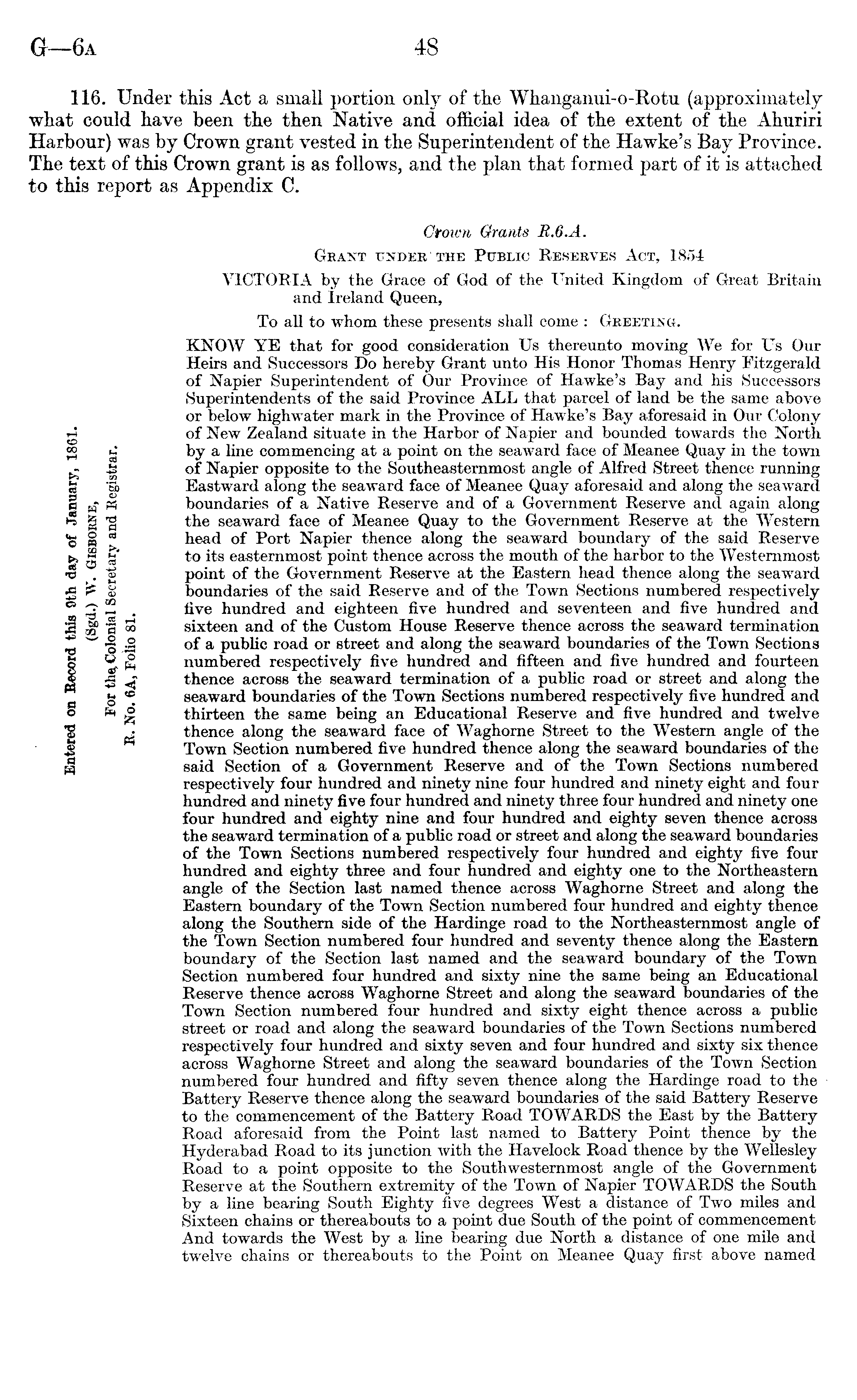 116. Under this Act a small portion only of the Whanganui-o-Rotu (approximately what could have been the then Native and official idea of the extent of the Ahuriri Harbour) was by Crown grant vested in the Superintendent of the Hawke's Bay Province. The text of this Crown grant is as follows, and the plan that formed part of it is attached to this report as Appendix C.