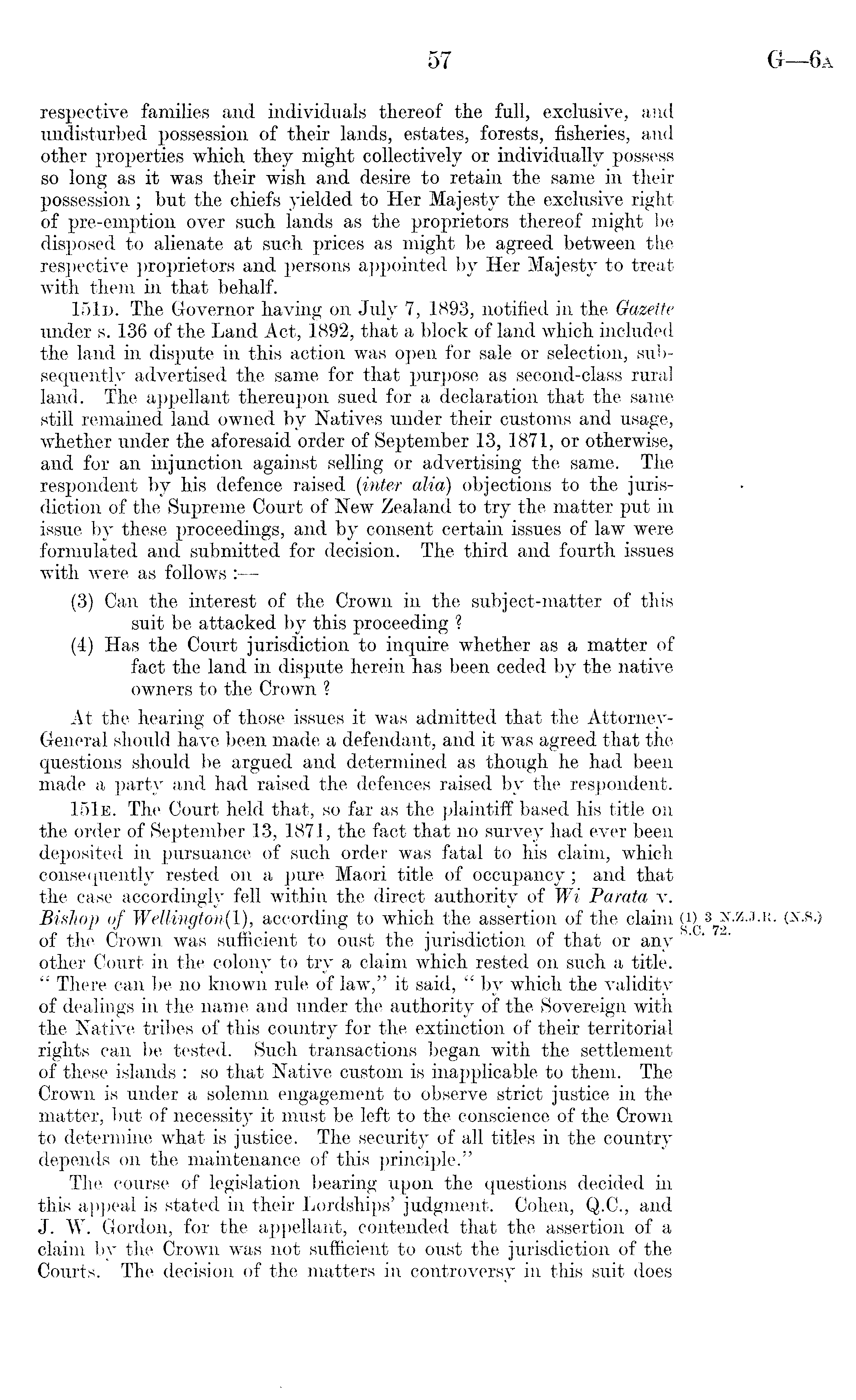 respective families and individuals thereof the full, exclusive, and undisturbed possession of their lands, estates, forests, fisheries, and other properties which they might collectively or individually possess so long as it was their wish and desire to retain the same in their possession; but the chiefs yielded to Her Majesty the exclusive right of pre-emption over such lands as the proprietors thereof might be disposed to alienate at such prices as might be agreed between therespective proprietors and persons appointed by Her Majesty to treat with them in that behalf. 151 d. The Governor having on July 7, 1893, notified in the Gazette under s. 136 of the Land Act, 1892, that a block of land which included the land in dispute in this action was open for sale or selection, subsequently advertised the same for that purpose as second-class rural land. The appellant thereupon sued for a declaration that the same still remained land owned by Natives under their customs and usage, whether under the aforesaid order of September 13, 1871, or otherwise, and for an injunction against selling or advertising the same. The respondent by his defence raised (inter alia) objections to the jurisdiction of the Supreme Court of New Zealand to try the matter put in issue by these proceedings, and by consent certain issues of law were formulated and submitted for decision. The third and fourth issues with were as follows : (3) Can the interest of the Crown in the subject-matter of this suit be attacked by this proceeding ? (4) Has the Court jurisdiction to inquire whether as a matter of fact the land in dispute herein has been ceded by the native owners to the Crown ? At the hearing of those issues it was admitted that the AttorneyGeneral should have been made a defendant, and it was agreed that the questions should be argued and determined as though he had been made a party and had raised the defences raised by the respondent. 151e. The Court held that, so far as the plaintiff based his title on the order of September 13, 1871, the fact that no survey had ever been deposited in pursuance of such order was fatal to his claim, which consequently rested on a pure Maori title of occupancy ; and that the case accordingly fell within the direct authority of Wi Parata v. Bishop of according to which the assertion of the claim of the Crown was sufficient to oust the jurisdiction of that or any other Court in the colony to try a claim which rested on such a title. " There can be no known rule of law," it said, " by which the validity of dealings in the name and under the authority of the Sovereign with the Native tribes of this country for the extinction of their territorial rights can be tested. Such transactions began with the settlement of these islands : so that Native custom is inapplicable to them. The Crown is under a solemn engagement to observe strict justice in the matter, but of necessity it must be left to the conscience of the Crown to determine what is justice. The security of all titles in the country depends on the maintenance of this principle." The course of legislation bearing upon the questions decided in this appeal is stated in their Lordships' judgment. Cohen, Q.C., and J. W, Gordon, for the appellant, contended that the assertion of a claim by the Crown was not sufficient to oust the jurisdiction of the Courts. The decision of the matters in controversy in this suit does