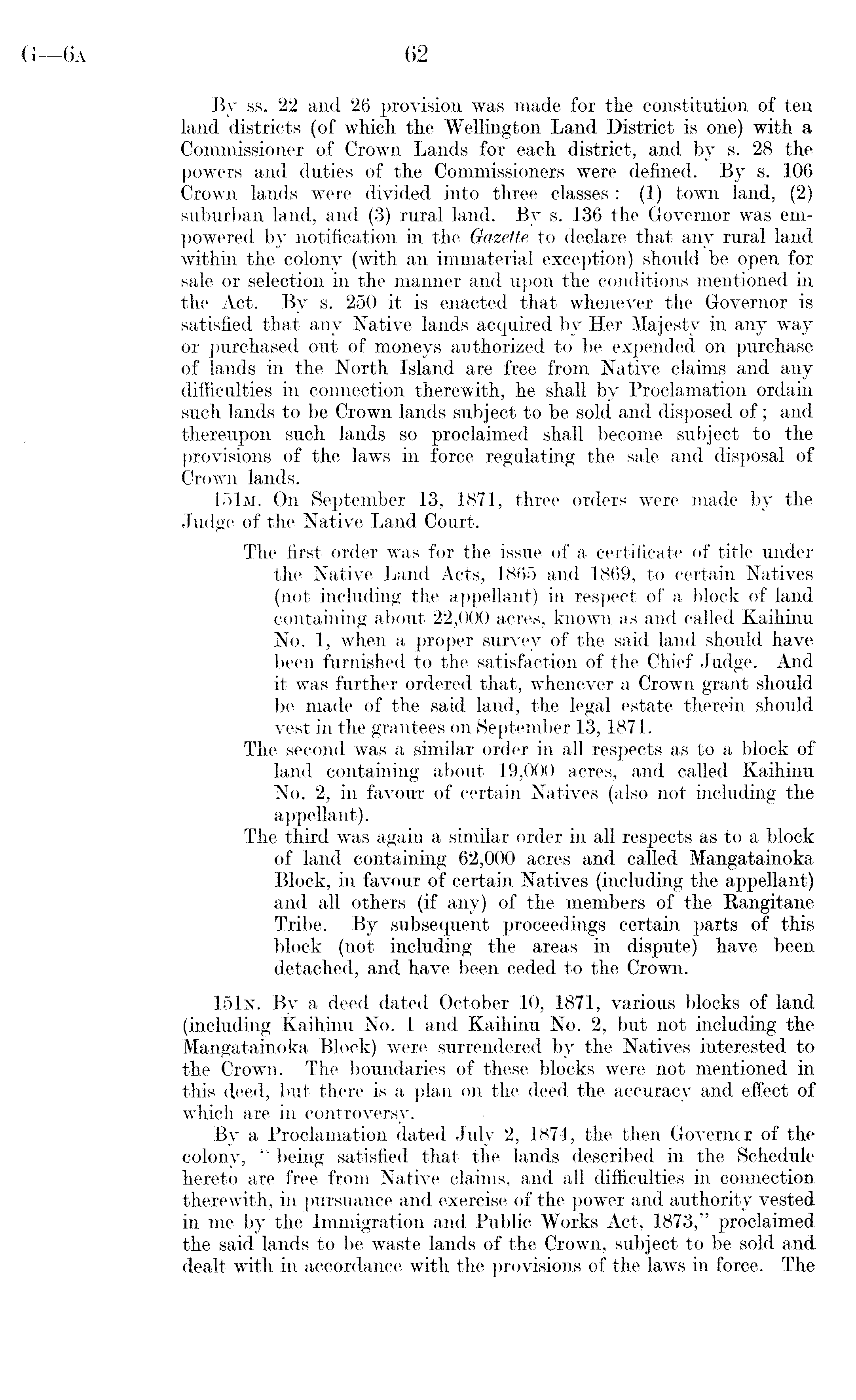 By ss. 22 and 26 provision was made for the constitution of ten land districts (of which the Wellington Land District is one) with a Commissioner of Crown Lands for each district, and by s. 28 the powers and duties of the Commissioners were defined. By s. 106 Crown lands were divided into three classes : (1) town land, (2) suburban land, and (3) rural land. By s. 136 the Governor was empowered by notification in the Gazette to declare that any rural land within the colony (with an immaterial exception) should be open for sale or selection in the manner and upon the conditions mentioned in the Act. By s. 250 it is enacted that whenever the Governor is satisfied that any Native lands acquired by Her Majesty in any way or purchased out of moneys authorized to be expended on purchase of lands in the North Island are free from Native claims and any difficulties in connection therewith, he shall by Proclamation ordain such lands to be Crown lands subject to be sold and disposed of; and thereupon such lands so proclaimed shall become subject to the provisions of the laws in force regulating the sale and disposal of Crown lands. 151 m. On September 13, 1871, three orders were made by the Judge of the Native Land Court. The first order was for the issue of a certificate of title under the Native Land Acts, 1865 and 1869, to certain Natives (not including the appellant) in respect of a block of land containing about 22,000 acres, known as and called Kaihinu No. 1, when a proper survey of the said land should have been furnished to the satisfaction of the Chief Judge. And it was further ordered that, whenever a Crown grant should be made of the said land, the legal estate therein should vest in the grantees on September 13,1871. The second was a similar order in all respects as to a block of land containing about 19,000 acres, and called Kaihinu No. 2, in favour of certain Natives (also not including the appellant). The third was again a similar order in all respects as to a block of land containing 62,000 acres and called Mangatainoka Block, in favour of certain Natives (including the appellant) and all others (if any) of the members of the Rangitane Tribe. By subsequent proceedings certain parts of this block (not including the areas in dispute) have been detached, and have been ceded to the Crown. 151n. By a deed dated October 10, 1871, various blocks of land (including Kaihinu No. 1 and Kaihinu No. 2, but not including the Mangatainoka Block) were surrendered by the Natives interested to the Crown. The boundaries of these blocks were not mentioned in this deed, but there is a plan on the deed the accuracy and effect of which are in controversy. By a Proclamation dated July 2, 1874, the then Governor of the colony, " being satisfied that the lands described in the Schedule hereto are free from Native claims, and all difficulties in connection therewith, in pursuance and exercise of the power and authority vested in me by the Immigration and Public Works Act, 1873," proclaimed the said lands to be waste lands of the Crown, subject to be sold and dealt with in accordance with the provisions of the laws in force. The