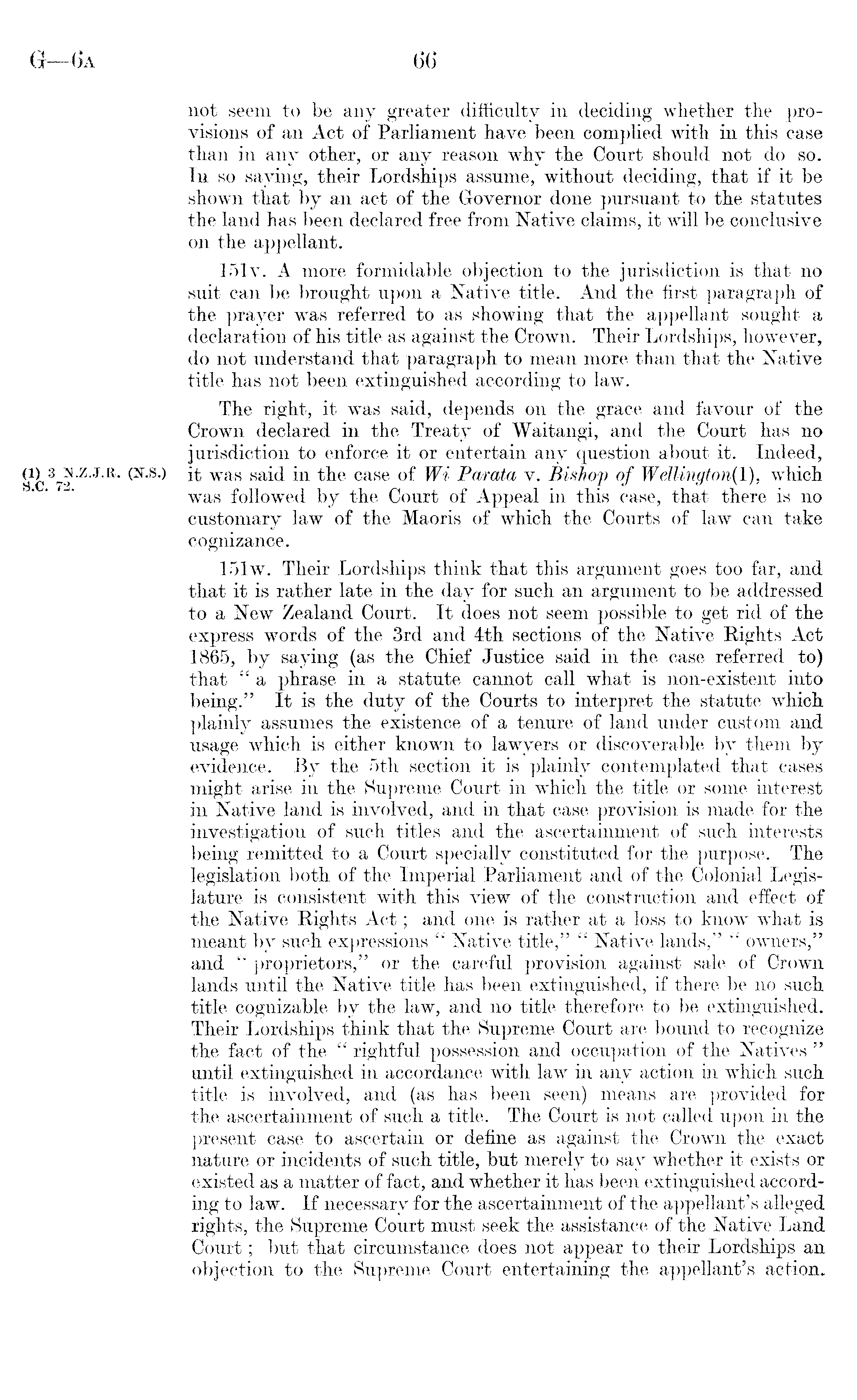 not seem to be any greater difficulty in deciding whether the provisions of an Act of Parliament have been complied with in this case than in any other, or any reason why the Court should not do so. la so saying, their Lordships assume, without deciding, that if it be shown that by an act of the Governor done pursuant to the statutes the land has been declared free from Native claims, it will be conclusive on the appellant. 151 v. A more formidable objection to the jurisdiction is that no suit can be brought upon a Native title. And the first paragraph of the prayer was referred to as showing that the appellant sought a declaration of his title as against the Crown. Their Lordships, however, do not understand that paragraph to mean more than that the Native title has not been extinguished according to law. The right, it was said, depends on the grace and favour of the Crown declared in the Treaty of Waitangi, and the Court has no jurisdiction to enforce it or entertain any question about it. Indeed, it was said in the case of Wi Parata v. Bishop of which was followed by the Court of Appeal in this case, that there is no customary law of the Maoris of which the Courts of law can take cognizance. 151w. Their Lordships think that this argument goes too far, and that it is rather late in the day for such an argument to be addressed to a New Zealand Court. It does not seem possible to get rid of the express words of the 3rd and 4th sections of the Native Rights Act 1865, by saying (as the Chief Justice said in the case referred to) that " a phrase in a statute cannot call what is non-existent into being." It is the duty of the Courts to interpret the statute which plainly assumes the existence of a tenure of land under custom and usage which is either known to lawyers or discoverable by them by evidence. By the sth section it is plainly contemplated that cases might arise in the Supreme Court in which the title or some interest in Native land is involved, and in that case provision is made for the investigation of such titles and the ascertainment of such interests being remitted to a Court specially constituted for the purpose. The legislation both of the Imperial Parliament and of the Colonial Legislature is consistent with this view of the construction and effect of the Native Rights Act; and one is rather at a loss to know what is meant by such expressions " Native, title," " Native lands," " owners," and " proprietors," or the careful provision against sale of Crown lands until the Native title has been extinguished, if there be no such title cognizable by the law, and no title therefore to be extinguished. Their Lordships think that the Supreme Court are bound to recognize the fact of the " rightful possession and occupation of the Natives " nntil extinguished in accordance with law in any action in which such title is involved, and (as has been seen) means are provided for the ascertainment of such a title. The Court is not called upon in the present case to ascertain or define as against the Crown the exact nature or incidents of such title, but merely to say whether it exists or existed as a matter of fact, and whether it has been extinguished according to law. If necessary for the ascertainment of the appellant's alleged rights, the Supreme Court must seek the assistance of the Native Land Court; but that circumstance does not appear to their Lordships an objection to the Supreme Court entertaining the appellant's action.