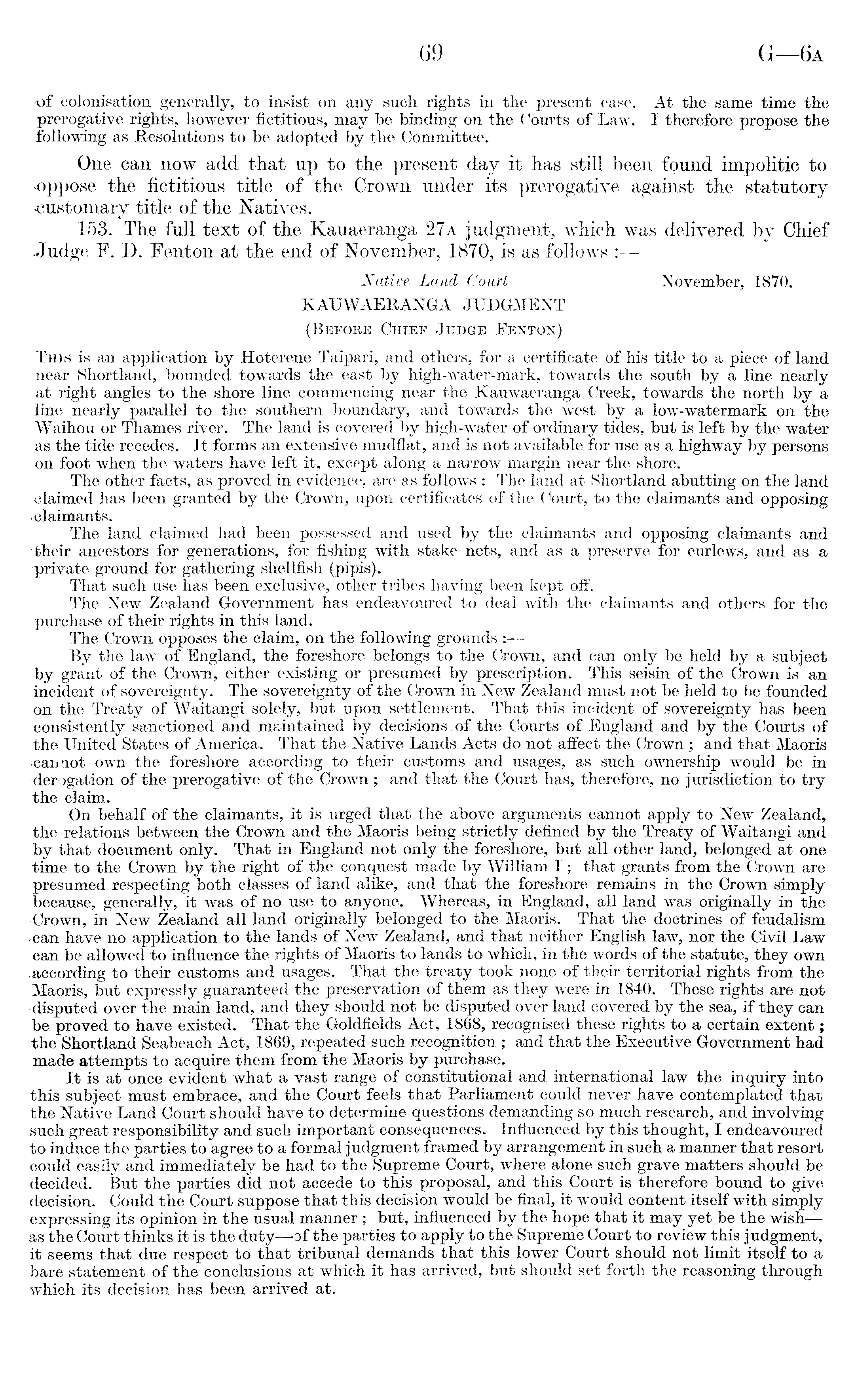 of colonisation generally, to insist on any such rights in the present case. At the same time the prerogative rights, however fictitious, may be binding on the Courts of Law. I therefore propose the following as Resolutions to be adopted by the Committee. One can now add that up to the present day it has still been found impolitic to •oppose the fictitious title of the Crown under its prerogative against the statutory ■customary title of the Natives. 153. The full text of the Kauaeranga 27a judgment, which was delivered by Chief .Judge F. D. Fenton at the end of November, 1870, is as follows : Native Land Court November, 1870. KAUWAERANGA JUDGMENT (Before Chief Judge Fenton) This is an application by Hoterene Taipari, and others, for a certificate of his title to a piece of land near Shortland, bounded towards the east by high-water-mark, towards the south by a line nearly at right angles to the shore line commencing near the Kauwaeranga Creek, towards the north by a line nearly parallel to the southern boundary, and towards the west by a low-watermark on the Waihou or Thames river. The land is covered by high-water of ordinary tides, but is left by the water as the tide recedes. It forms an extensive mudflat, and is not available for use as a highway by persons on foot when the waters have left it, except along a narrow margin near the shore. The other facts, as proved in evidence, are as follows : The land at Shortland abutting on the land claimed has been granted by the Crown, upon certificates of the Court, to the claimants and opposing claimants. The land claimed had been possessed and used by the claimants and opposing claimants and their ancestors for generations, for fishing with stake nets, and as a preserve for curlews, and as a private ground for gathering shellfish (pipis). That such use has been exclusive, other tribes having been kept off. The New Zealand Government has endeavoured to deal with the claimants and others for the purchase of their rights in this land. The Crown opposes the claim, on the following grounds : By the law of England, the foreshore belongs to the Crown, and can only be held by a subject by grant of the Crown, either existing or presumed by prescription. This seisin of the Crown is an incident of sovereignty. The sovereignty of the Crown in New Zealand must not be held to be founded on the Treaty of Waitangi solely, but upon settlement. That this incident of sovereignty has been consistently sanctioned and maintained by decisions of the Courts of England and by the Courts of the United States of America. That the Native Lands Acts do not affect the Crown ; and that Maoris ■can aot own the foreshore according to their customs and usages, as such ownership would be in derogation of the prerogative of the Crown ; and that the Court has, therefore, no jurisdiction to try the claim. On behalf of the claimants, it is urged that the above arguments cannot apply to New Zealand, the relations between the Crown and the Maoris being strictly defined by the Treaty of Waitangi and by that document only. That in England not only the foreshore, but all other land, belonged at one time to the Crown by the right of the conquest made by William I; that grants from the Crown are presumed respecting both classes of land alike, and that the foreshore remains in the Crown simply because, generally, it was of no use to anyone. Whereas, in England, all land was originally in the •Crown, in New Zealand all land originally belonged to the Maoris. That the doctrines of feudalism •can have no application to the lands of New Zealand, and that neither English law, nor the Civil Law can be allowed to influence the rights of Maoris to lands to which, in the words of the statute, they own according to their customs and usages. That the treaty took none of their territorial rights from the Maoris, but expressly guaranteed the preservation of them as they were in 1840. These rights are not •disputed over the main land, and they should not be disputed over land covered by the sea, if they can be proved to have existed. That the Goldfields Act, 1868, recognised these rights to a certain extent; the Shortland Seabeach Act, 1869, repeated such recognition ; and that the Executive Government had made attempts to acquire them from the Maoris by purchase. It is at once evident what a vast range of constitutional and international law the inquiry into this subject must embrace, and the Court feels that Parliament could never have contemplated that the Native Land Court should have to determine questions demanding so much research, and involving such great responsibility and such important consequences. Influenced by this thought, I endeavoured to induce the parties to agree to a formal judgment framed by arrangement in such a manner that resort could easily and immediately be had to the Supreme Court, where alone such grave matters should be decided. But the parties did not accede to this proposal, and this Court is therefore bound to give decision. Could the Court suppose that this decision would be final, it would content itself with simply expressing its opinion in the usual manner ; but, influenced by the hope that it may yet be the wish—as the Court thinks it is the duty—of the parties to apply to the Supreme Court to review this judgment, it seems that due respect to that tribunal demands that this lower Court should not limit itself to a bare statement of the conclusions at which it has arrived, but should set forth the reasoning through which its decision has been arrived at.