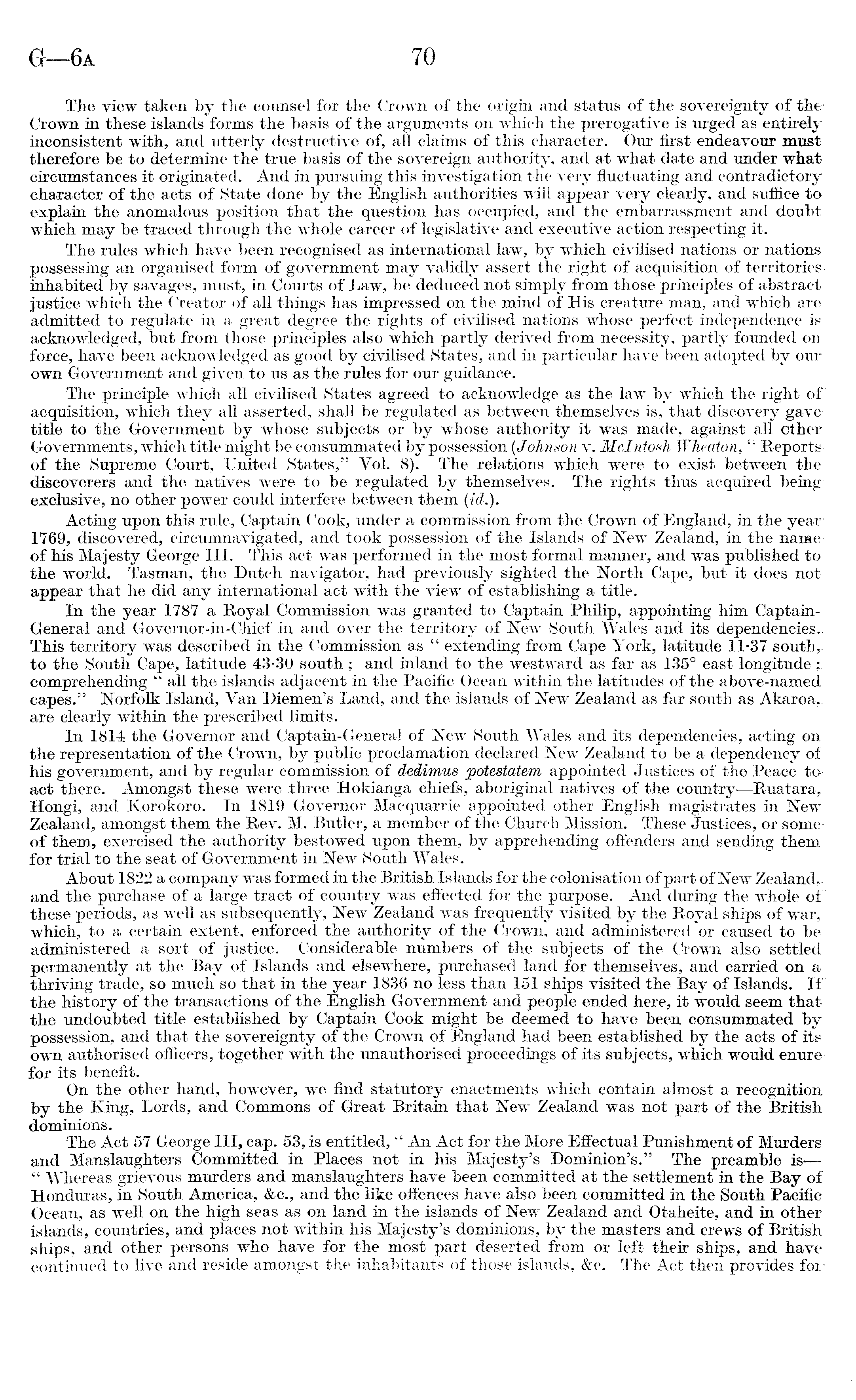 The view taken by the counsel for the Crown of the origin and status of the sovereignty of the* Crown in these islands forms the basis of the arguments on which the prerogative is urged as entirely inconsistent with, and utterly destructive of, all claims of this character. Our first endeavour must therefore be to determine the true basis of the sovereign authority, and at what date and under what circumstances it originated. And in pursuing this investigation the very fluctuating and contradictory character of the acts of State done by the English authorities will appear very clearly, and suffice to explain the anomalous position that the qiiestion has occupied, and. the embarrassment and doubt which may be traced through the whole career of legislative and executive action respecting it. The rules which have been recognised as international law, by which civilised nations or nations possessing an organised form of government may validly assert the right of acqiiisition of territoriesinhabited by savages, must, in Courts of Law, be deduced not simply from those principles of abstract justice which the Creator of all things has impressed on the mind of His creature man, and which are admitted to regulate in a great degree the rights of civilised nations whose perfect independence is acknowledged, but from those principles also which partly derived from necessity, partly founded on force, have been acknowledged as good by civilised States, and in particular have been adopted by our own Government and given to us as the rules for our guidance. The principle which all civilised States agreed to acknowledge as the law by which the right of acquisition, which they all asserted, shall be regulated as between themselves is, that discovery gave title to the Government by whose subjects or by whose authority it was made, against all ether Governments, which title might be consummated by possession (Johnson v. Mcintosh Wheatoji, " Reports of the Supreme Court, United States," Vol. 8). The relations which were to exist between the discoverers and the natives were to be regulated by themselves. The rights thus acquired being exclusive, no other power could interfere between them (id.). Acting upon this rule, Captain Cook, under a commission from the Crown of England, in the year 1769, discovered, circixmnavigated, and took possession of the Islands of New Zealand, in the name of his Majesty George 111. This act was performed in the most formal manner, and was published to the world. Tasman, the Dutch navigator, had previously sighted the North Cape, but it does not appear that he did any international act with the view of establishing a title. In the year 1787 a Royal Commission was granted to Captain Philip, appointing him CaptainGeneral and Governor-in-Chief in and over the territory of New South Wales and its dependencies.. This territory was described in the Commission as " extending from Cape York, latitude 11-37 south,. to the South Cape, latitude 43-30 south; and inland to the westward as far as 135° east longitude:. comprehending " all the islands adjacent in the Pacific Ocean within the latitudes of the above-named capes." Norfolk Island, Van Diemen's Land, and the islands of New Zealand as far south as Akaroa, are clearly within the prescribed limits. In 1814 the Governor and Captain-General of New South Wales and its dependencies, acting on the representation of the Crown, by public proclamation declared New Zealand to be a dependency of his government, and by regular commission of dedimus potestatem appointed Justices of the Peace to act there. Amongst these were three Hokianga chiefs, aboriginal natives of the country- —Ruatara, Hongi, and Korokoro. In 1819 Governor Macquarrie appointed other English magistrates in New Zealand, amongst them the Rev. M. Butler, a member of the Church Mission. These Justices, or some of them, exercised the authority bestowed upon them, by apprehending offenders and sending them for trial to the seat of Government in New South Wales. About 1822 a company was formed in the British Islands for the colonisation of part of New Zealand, and the purchase of a large tract of country was effected for the purpose. And during the whole of these periods, as well as siibsequently, New Zealand Avas frequently visited by the Royal ships of war, which, to a certain extent, enforced the authority of the Crown, and administered or caused to be administered a sort of justice. Considerable numbers of the subjects of the Crown also settled permanently at the Bay of Islands and elsewhere, purchased land for themselves, and carried on a thriving trade, so much so that in the year 1836 no less than 151 ships visited the Bay of Islands. If the history of the transactions of the English Government and people ended here, it would seem that the undoubted title established by Captain Cook might be deemed to have been consummated by possession, and that the sovereignty of the Crown of England had been established by the acts of its own authorised officers, together with the unauthorised proceedings of its subjects, which would enure for its benefit. On the other hand, however, we find statutory enactments which contain almost a recognition by the King, Lords, and Commons of Great Britain that New Zealand was not part of the British dominions. The Act 57 George 111, cap. 53, is entitled, " An Act for the More Effectual Punishment of Murders and Manslaughters Committed in Places not in his Majesty's Dominion's." The preamble is—- " Whereas grievous murders and manslaughters have been committed at the settlement in the Bay of Honduras, in South America, &c, and the like offences have also been committed in the South Pacific Ocean, as well on the high seas as on land in the islands of New Zealand and Otaheite, and in other islands, countries, and places not within his Majesty's dominions, by the masters and crews of British ships, and other persons who have for the most part deserted