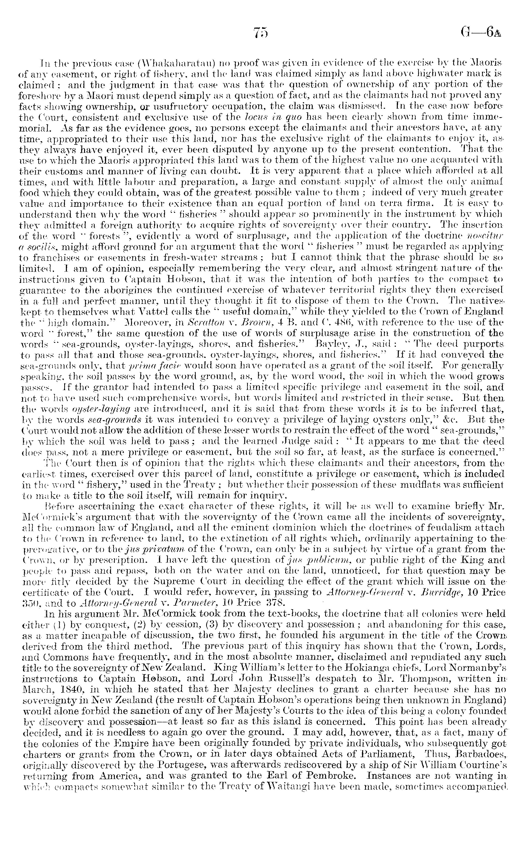 In the previous case (Whakaharatau) no proof was given in evidence of the exercise by the Maorisof any easement, or right of fishery, and the land was claimed simply as land above highwater mark is claimed ; and the judgment in that case was that the question of ownership of any portion of the* foreshore by a Maori must depend simply as a question of fact, and as the claimants had not proved any facts showing ownership, or usufructory occupation, the claim was dismissed. In the case now beforethe Court, consistent and exclusive use of the lomis in quo has been clearly shown from time immemorial. As far as the evidence goes, no persons except the claimants and their ancestors have, at any time, appropriated to their use this land, nor has the exclusive right of the claimants to enjoy it, as. they always have enjoyed it, ever been disputed by anyone up to the present contention. That the use to which the Maoris appropriated this land was to them of the highest value no one acquanted with their customs and manner of living can doubt. It is very apparent that a place which afforded at all times, and with little labour and preparation, a large and constant supply of almost the only animal food which they could obtain, was of the greatest possible value to them ; indeed of very much greater value and importance to their existence than an equal portion of land on terra firma. It is easy tounderstand then why the word " fisheries " should appear so prominently in the instrument by which they admitted a foreign authority to acquire rights of sovereignty over their country. The insertion of the word " forests ", evidently a word of surplusage, and the application of the doctrine noscitur a socilis, might afford groimd for an argument that the word " fisheries " must be regarded as applying to franchises or easements in fresh-water streams; but I cannot think that the phrase should be so limited. I am of opinion, especially remembering the very clear, and almost stringent nature of the instructions given to Captain Hobson, that it was the intention of both parties to the compact to guarantee to the aborigines the continued exercise of whatever territorial rights they then exercised in a full and perfect manner, until they thought it fit to dispose of them to the Crown. The native* kept to themselves what Vattel calls the " useful domain," while they yielded to the Crown of England the " high domain." Moreover, in Scratton v. Brown, 48. and C. 486, with reference to the use of the word '" forest," the same question of the use of words of surplusage arise in the construction of the words " sea-grounds, oyster-layings, shores, and fisheries." Bayle3% J., said : " The deed purports to pass all that and those sea-grounds, oyster-layings, shores, and fisheries." If it had conveyed the sea-grounds only, that prima facie would soon have operated as a grant of the soil itself. For generally speaking, the soil passes by the word ground, as, by the word wood, the soil in which the wood grows passes. If the grantor had intended to pass a limited specific privilege and easement in the soil, and not to have used such comprehensive words, but words limited and restricted in their sense. But then the words oyster-laying are introduced, and it is said that from these words it is to be inferred that, by the words sea-grounds it was intended to convey a privilege of laying oysters only," &c. But the Court would not allow the addition of these lesser words to restrain the effect of the word " sea-grounds,' 7 by which the soil was held to pass; and the learned Judge said : "It appears to me that the deed does pass, not a mere privilege or easement, but the soil so far, at least, as the surface is concerned." The Court then is of opinion that the rights which these claimants and their ancestors, from the earliest times, exercised over this parcel of land, constitute a privilege or easement, which is included in the word " fishery," used in the Treaty ,• but whether their possession of these mudflats was sufficient to make a title to the soil itself, will remain for inquiry. Before ascertaining the exact character of these rights, it will be as well to examine briefly Mr. McC< trmick's argument that with the sovereignty of the Crown came all the incidents of sovereignty,, all the common law of England, and all the eminent dominion which the doctrines of feudalism attach to the Crown in reference to land, to the extinction of all rights which, ordinarily appertaining to the prerogative, or to the jus privatum of the Crown, can only be in a subject by virtue of a grant from the Crown, or by prescription. I have left the question of jus publicum, or public right of the King and people to pass and repass, both on the water and on the land, unnoticed, for that question may be more fitly decided by the Supreme Court in deciding the effect of the grant which will issue on the certificate of the Court. I would refer, however, in passing to Attorney-General v. Burridge, 10 Price 350, and to Attorney-General v. Parmeter, 10 Price 378. In his argument Mr. McCormiek took from the text-books, the doctrine that all colonies were held either (1) by conquest, (2) by cession, (3) by discovery and possession ; and abandoning for this case, as a matter incapable of discussion, the two first, he founded his argument in the title of the Crown derived from the third method. The previous part of this inquiry has shown that the Crown, Lords, and Commons have frequently, and in the most absolute manner, disclaimed and repudiated any such title to the sovereignt3 r of New Zealand. King William's letter to the Hokianga chiefs, Lord Normanby's instructions to Captain Hebson, and Lord John Russell's despatch to Mr. Thompson, written in March, 1840, in which he stated that her Majesty declines to grant a charter because she has no sovereignty in New Zealand (the result of Captain Hobson's operations being then unknown in England) would alone forbid