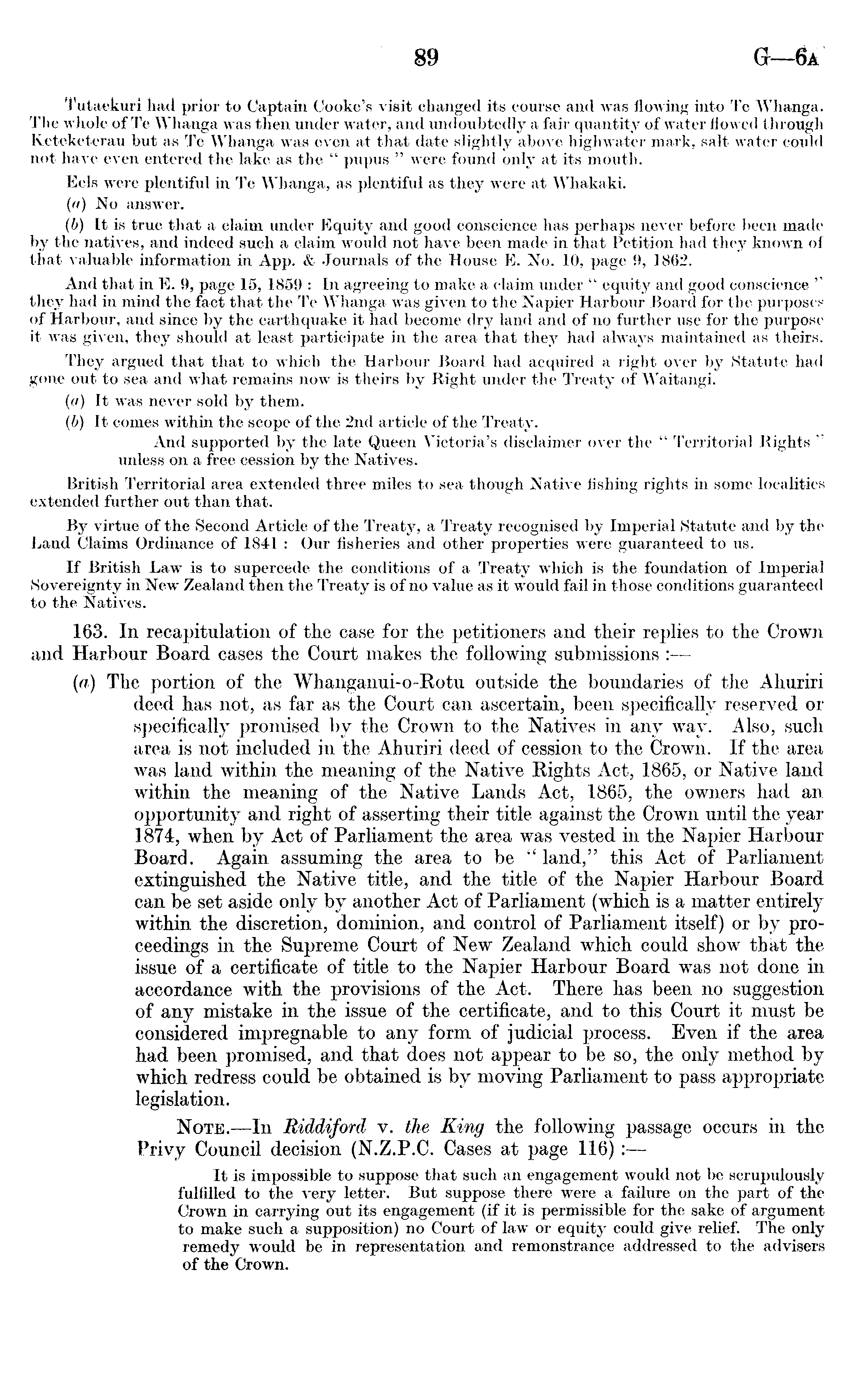 Tutaekuri had prior to Captain Cooke's visit changed its course and was flowiag into Tc Whanga. The whole of Te Wlianga was then under water, and undoubtedly a fair quantity of water flowed through Iveteketerau but as Te Whanga was even at that date slightly above highwater mark, salt water could not have even entered the lake as the " pupus " were found only at its mouth. Eels were plentiful in Te Whanga, as plentiful as they were at Whakaki. (a) No answer. (b) It is true that a claim under Equity and good conscience has perhaps never before been made by the natives, and indeed such a claim would not have been made in that Petition had they known of that valuable information in App. & Journals of the House E. No. 10, page 9, 1862. And that in E. 9, page 15, 1859 : In agreeing to make a claim under " equity and good conscience " they had in mind the fact that the Te Whanga was given to the Napier Harbour Board for the purposes of Harbour, ami since by the earthquake it had become dry land and of no further use for the purpose it was given, they should at least participate in the area that they had always maintained as theirs. They argued that that to which the Harbour Board had acquired a right over by Statute had gone out to sea and what remains now is theirs by Right under the Treaty of Waitangi. (a) It was never sold by them. (b) It comes within the scope of the 2nd article of the Treaty. And supported by the late Queen Victoria's disclaimer over the " Territorial Rights " unless on a free cession by the Natives. British Territorial area extended three miles to sea though Native fishing rights in some localities extended further out than that. By virtue of the Second Article of the Treaty, a Treaty recognised by Imperial Statute and by the Land Claims Ordinance of 1841 : Our fisheries and other properties were guaranteed to us. If British Law is to supercede the conditions of a Treaty which is the foundation of Imperial Sovereignty in New Zealand then the Treaty is of no value as it would fail in those conditions guaranteed to the Natives. 163. In recapitulation of the case for the petitioners and their replies to the Crown and Harbour Board cases the Court makes the following submissions :■ — (a) The portion of the Whanganui-o-Rotu outside the boundaries of the Ahuriri deed has not, as far as the Court can ascertain, been specifically reserved or specifically promised by the Crown to the Natives in any way. Also, such area is not included in the Ahuriri deed of cession to the Crown. If the area was land within the meaning of the Native Rights Act, 1865, or Native land within the meaning of the Native Lands Act, 1865, the owners had an opportunity and right of asserting their title against the Crown until the year 1874, when by Act of Parliament the area was vested in the Napier Harbour Board. Again assuming the area to be "land," this Act of Parliament extinguished the Native title, and the title of the Napier Harbour Board can be set aside only by another Act of Parliament (which is a matter entirely within the discretion, dominion, and control of Parliament itself) or by proceedings in the Supreme Court of New Zealand which could show that the issue of a certificate of title to the Napier Harbour Board was not done in accordance with the provisions of the Act. There has been no suggestion of any mistake in the issue of the certificate, and to this Court it must be considered impregnable to any form of judicial process. Even if the area had been promised, and that does not appear to be so, the only method by which redress could be obtained is by moving Parliament to pass appropriate legislation. Note. —In Riddiford v. the King the following passage occurs in the Privy Council decision (N.Z.P.C. Cases at page 116): — It is impossible to suppose that such an engagement would not be scrupulously fulfilled to the very letter. But suppose there were a failure on the part of the Crown in carrying out its engagement (if it is permissible for the sake of argument to make such a supposition) no Court of law or equity could give relief. The only remedy would be in representation and remonstrance addressed to the advisers of the Crown.