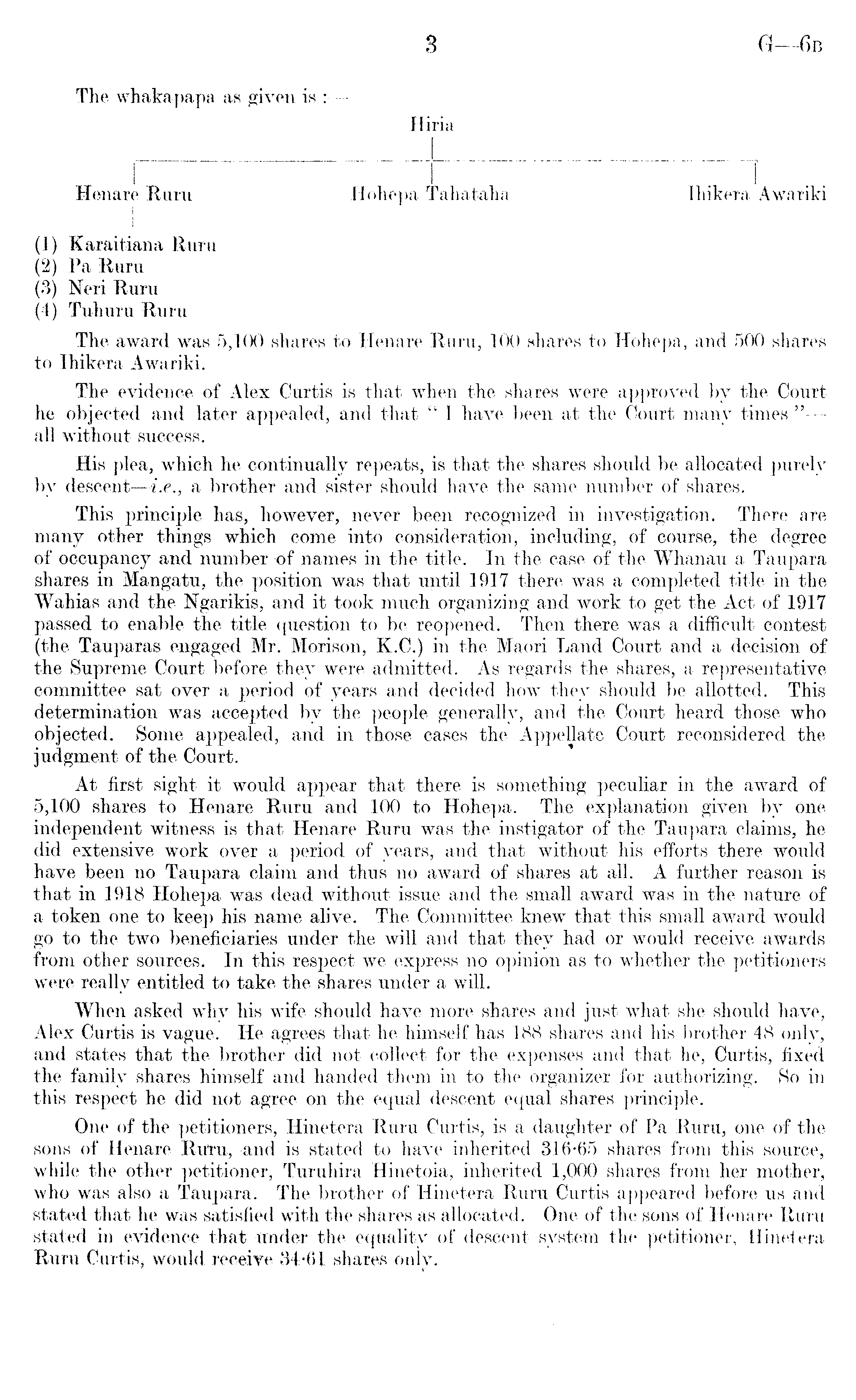 The whakapapa as given is : Hiria 1 . Henare Ruru Hohepa Tahataha Ihikera Awariki (1) Karadtiana Ruru (2) Pa Rutu (3) N'eri Ruru (4) Tuhuru Rutu The award was 5,100 shares to Henare Ruru, 100 shares to Hohepa, and 500 shares to Ihikera Awariki. The evidence of Alex Curtis is that when the shares were approved by the Court he objected and later appealed, and that " I have been at the Court many times " all without success. His plea, which he continually repeats, is that the shares should be allocated purely by descent —i.e., a brother and sister should have the same number of shares. This principle has, however, never been recognized in investigation. There are many other things which come into consideration, including, of course, the degree of occupancy and number of names in the title. In the case of the Whanau a Taupara shares in Mangatu, the position was that until 1917 there was a completed title in the Wahias and the Ngarikis, and it took much organizing and work to get the Act of 1917 passed to enable the title question to be reopened. Then there was a difficult contest (the Tauparas engaged Mr. Morison, K.C.) in the Maori Land Court and a decision of the Supreme Court before, they were admitted. As regards the shares, a representative committee sat over a period of years and decided how they should be allotted. This determination was accepted by the people generally, and the Court heard those who objected. Some appealed, and in those cases the Appellate Court reconsidered the judgment of the Court. At first sight it would appear that there is something peculiar in the award of 5,100 shares to Henare Ruru and 100 to Hohepa. The explanation given by one independent witness is that Henare Ruru was the instigator of the Taupara claims, he did extensive work over a period of years, and that without his efforts there would have been no Taupara claim and thus no award of shares at all. A further reason is that in 1918 Hohepa was dead without issue and the small award was in the nature of a token one to keep his name alive. The Committee knew that this small award would go to the two beneficiaries under the will and that they had or would receive awards from other sources. In this respect we express no opinion as to whether the petitioners were really entitled to take the shares under a will. When asked why his wife should have more shares and just what she should have, Alex Curtis is vague. He agrees that he himself has 188 shares and his brother 48 only, and states that the brother did not collect for the expenses and that he, Curtis, fixed the family shares himself and handed them in to the organizer for authorizing. So in this respect he did not agree on the equal descent equal shares principle. One of the petitioners, Hinetera Ruru Curtis, is a daughter of Pa Ruru, one of the sons of Henare Rttrti, and is stated to have inherited 316-65 shares from this source, while the other petitioner, Turuhira Hinetoia, inherited 1,000 shares from her mother, who was also a Taupara. The brother of Hinetera Ruru Curtis appeared before us and stated that he was satisfied with the shares as allocated. One of the sons of Henare Ruru stated in evidence that tmder the equality of descent system the petitioner, Hinetera Ruru Curtis, would receive 34*61 shares only.
