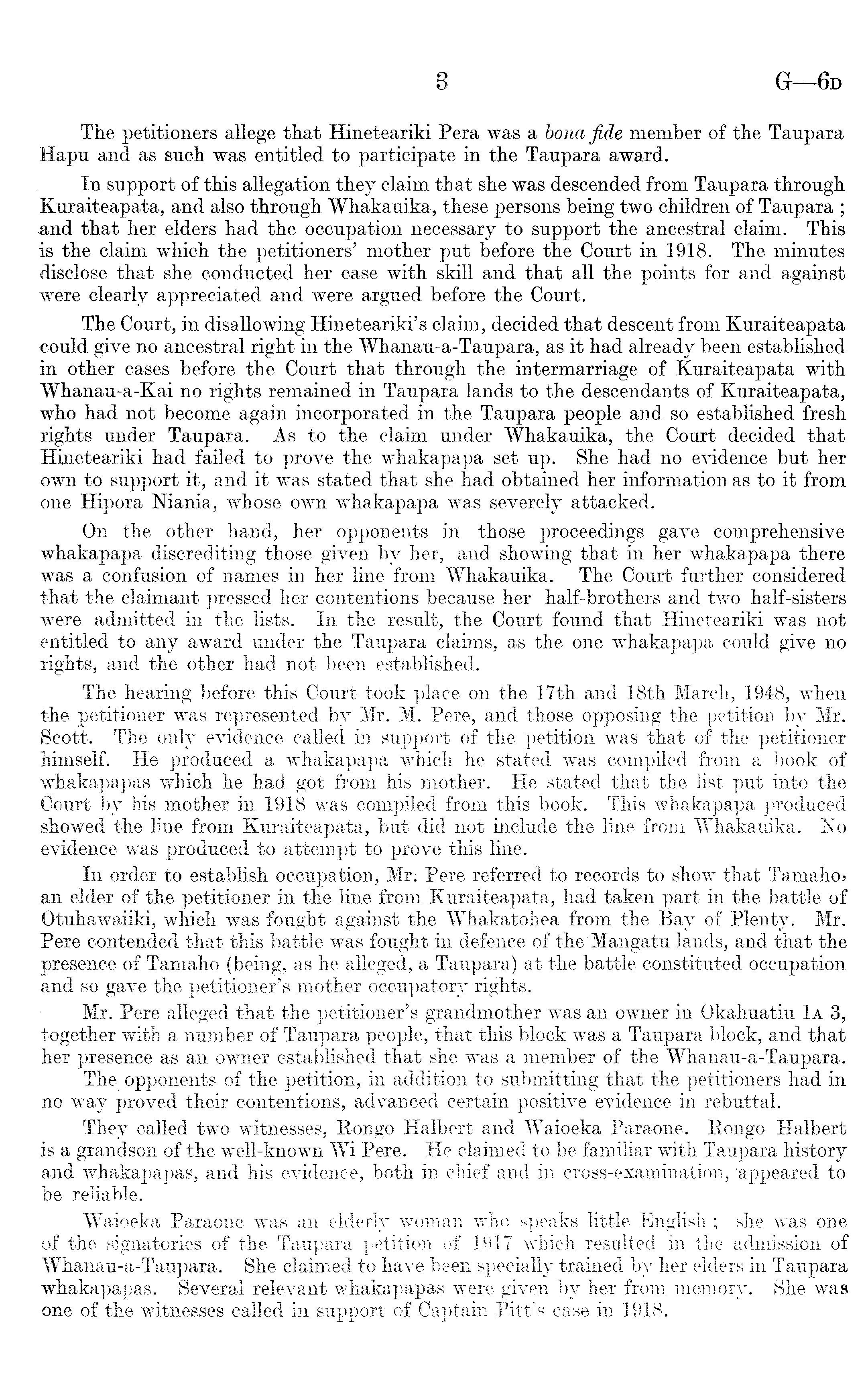 Tiie petitioners allege that Hineteariki Pera was a bona fide member of the Taupara Hapu and as such was entitled to participate in the Taupara award. In support of this allegation they claim that she was descended from Taupara through Kuraiteapata, and also through Whakauika, these persons being two children of Taupara ; and that her elders had the occupation necessary to support the ancestral claim. This is the claim which the petitioners' mother put before the Court in 1918. The minutes disclose that she conducted her case with skill and that all the points for and against were clearly appreciated and were argued before the Court. The Court, in disallowing Hineteariki's claim, decided that descent from Kuraiteapata could give no ancestral right in the Whanau-a-Taupara, as it had already been established in other cases before the Court that through the intermarriage of Kuraiteapata with Whanau-a-Kai no rights remained in Taupara lands to the descendants of Kuraiteapata, who had not become again incorporated in the Taupara people and so established fresh rights under Taupara. As to the claim under Whakauika, the Court decided that Hineteariki had failed to prove the whakapapa set up. She had no evidence but her own to support it, and it was stated that she had obtained her information as to it from one Hipora Niania, whose own whakapapa was severely attacked. On the other hand, her opponents in those proceedings gave comprehensive whakapapa discrediting those given by her, and showing that in her whakapapa there was a confusion of names in her line from Whakauika. The Court further considered that the claimant pressed her contentions because her half-brothers and two half-sisters were admitted in the lists. In the result, the Court found that Hineteariki was not entitled to any award under the Taupara claims, as the one whakapapa could give no rights, and the other had not been established. The hearing before this Court took place on the 17th and 18th March, 1948, when the petitioner was represented by Mr. M. Pere, and those opposing the petition by Mr. Scott. The only evidence called in support of the petition was that of the petitioner "himself. He produced a whakapapa which he stated was compiled from a book of whakapapas which he had got from his mother. He stated that the list put into the Court by his mother in 1918 was compiled from this book. This whakapapa produced showed the line from Kuraiteapata, but did not include the line from Whakauika. No -evidence was produced to attempt to prove this line. In order to establish occupation, Mr; Pere referred to records to show that Tamaho> an elder of the petitioner in the line from Kuraiteapata, had taken part in the battle of Otuhawaiiki, which was fought against the Whakatohea from the Bay of Plenty. Mr. Pere contended that this battle was fought in defence of the Mangatu lands, and that the presence of Tamaho (being, as he alleged, a Taupara) at the battle constituted occupation and so gave the petitioner's mother occupatory rights. Mr. Pere alleged that the petitioner's grandmother was an owner in Okahuatiu 1a 3, together with a number of Taupara people, that this block was a Taupara block, and that her presence as an owner established that she was a member of the Whanau-a-Taupara. The opponents of the petition, in addition to submitting that the petitioners had in no way proved their contentions, advanced certain positive evidence in rebuttal. They called two witnesses, Kongo Halbert and Waioeka Paraone. Kongo Halbert is a grandson of the well-known Wi Pere. He claimed to be familiar with Taupara history and whakapapas, and his evidence, both in chief and in cross-examination, appeared to be reliable. Waioeka Paraone was an elderly woman who speaks little English ; she was one of the signatories of the Taupara petition of 1917 which resulted in the admission of Whanau-a-Taupara. She claimed to have been specially trained by her elders in Taupara whakapapas. Several relevant whakapapas were given by her from memory. She was one of the witnesses called in support of Captain Pitt's case in 1918.