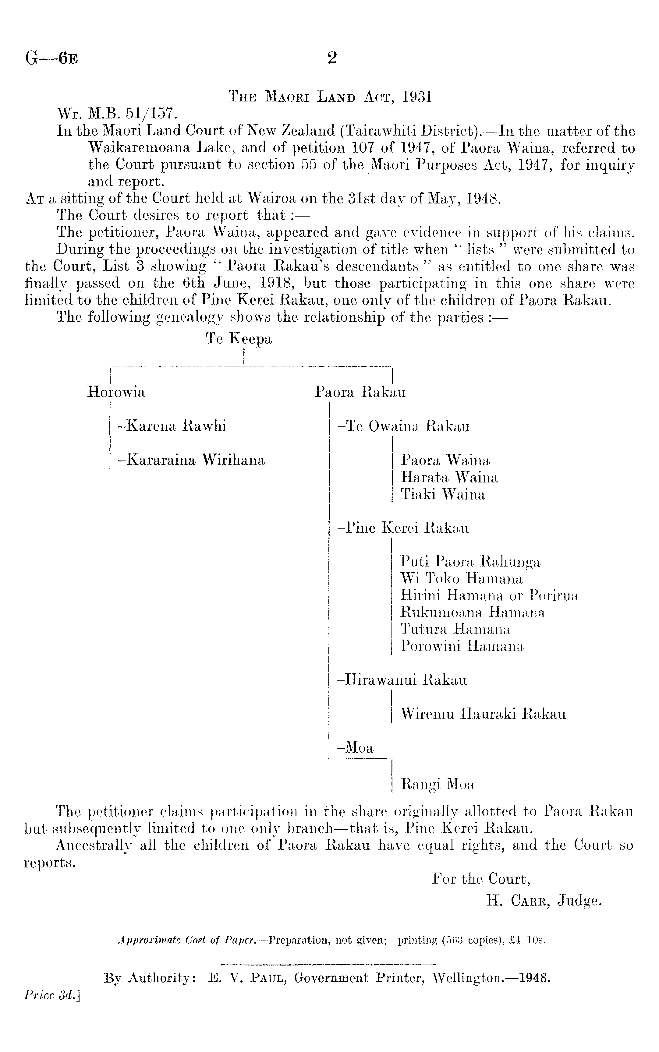 The Maori Land Act, 1931 Wr. M.B. 51/157. In the Maori Land Court of New Zealand (Tairawhiti District).—In the matter of the Waikaremoana Lake, and of petition 107 of 1947, of Paora Waina, referred to the Court pursuant to section 55 of the Maori Purposes Act, 1947, for inquiry and report. At a sitting of the Court held at Wairoa on the 31st day of May, 1948. The Court desires to report that: — The petitioner, Paora Waina, appeared and gave evidence in support of his claims. During the proceedings on the investigation of title when " lists " were submitted to the Court, List 3 showing " Paora Rakau's descendants " as entitled to one share was finally passed on the 6th June, 1918, but those participating in this one share were limited to the children of Pine Kerei Rakau, one only of the children of Paora Rakau. The following genealogy shows the relationship of the parties '