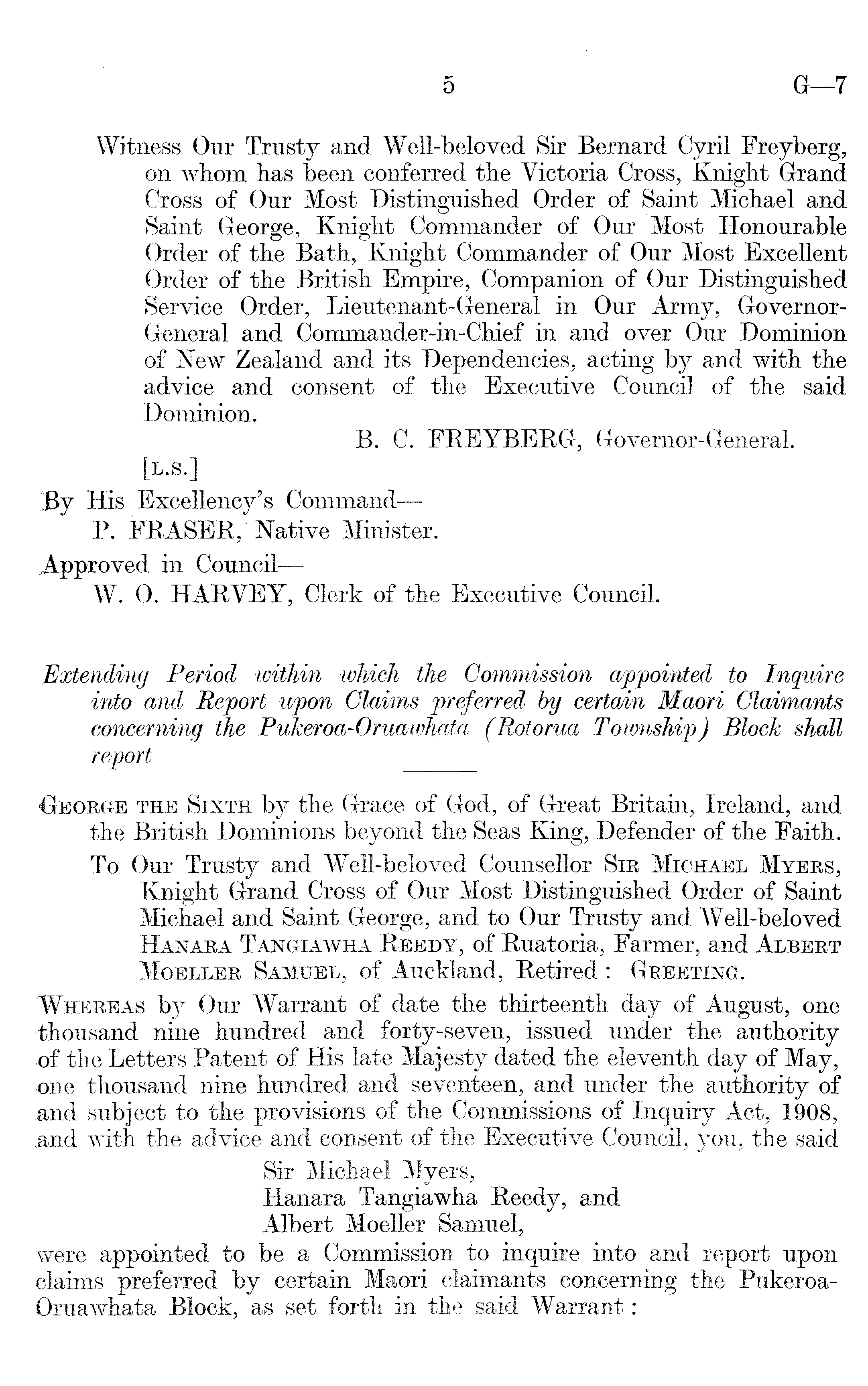 Witness Our Trusty and Well-beloved Sir Bernard Cyril Freyberg, on whom has been conferred the Victoria Cross, Knight Grand Cross of Our Most Distinguished Order of Saint Michael and Saint George, Knight Commander of Our Most Honourable Order of the Bath, Knight Commander of Our Most Excellent Order of the British Empire, Companion of Our Distinguished Service Order, Lieutenant-General in Our Army, GovernorGeneral and Commander-in-Chief in and over Our Dominion of New Zealand and its Dependencies, acting by and with the advice and consent of the Executive Council of the said Dominion. B. C. FREYBERG, Governor-General. [L.S.] By His Excellency's Command — P. ERASER, Native Minister. Approved in Council— W. 0. HARYEY, Clerk of the Executive Council. Extending Period within which the Commission appointed to Inquire into and Report upon Claims preferred by certain Maori Claimants concerning the Pukeroa-Oruawhata (Rotorua Township) Block shall report George the Sixth by the Grace of God, of Great Britain, Ireland, and the British Dominions beyond the Seas King, Defender of the Faith. To Our Trusty and Well-beloved Counsellor Sir Michael Myers, Knight Grand Cross of Our Most Distinguished Order of Saint Michael and Saint George, and to Our Trusty and Well-beloved Hanara Tangiawha Reedy, of Ruatoria, Farmer, and Albert Moeller Samuel, of Auckland, Retired : Greeting. Whereas by Our Warrant of date the thirteenth day of August, one thousand nine hundred and forty-seven, issued under the authority of the Letters Patent of His late Majesty dated the eleventh day of May, one thousand nine hundred and seventeen, and under the authority of and subject to the provisions of the Commissions of Inquiry Act, 1908, .and with the advice and consent of the Executive Council, you, the said Sir Michael Myers, Hanara Tangiawha Reedy, and Albert Moeller Samuel, were appointed to be a Commission to inquire into and report upon claims preferred by certain Maori claimants concerning the PukeroaOruawhata Block, as set forth in the said Warrant: