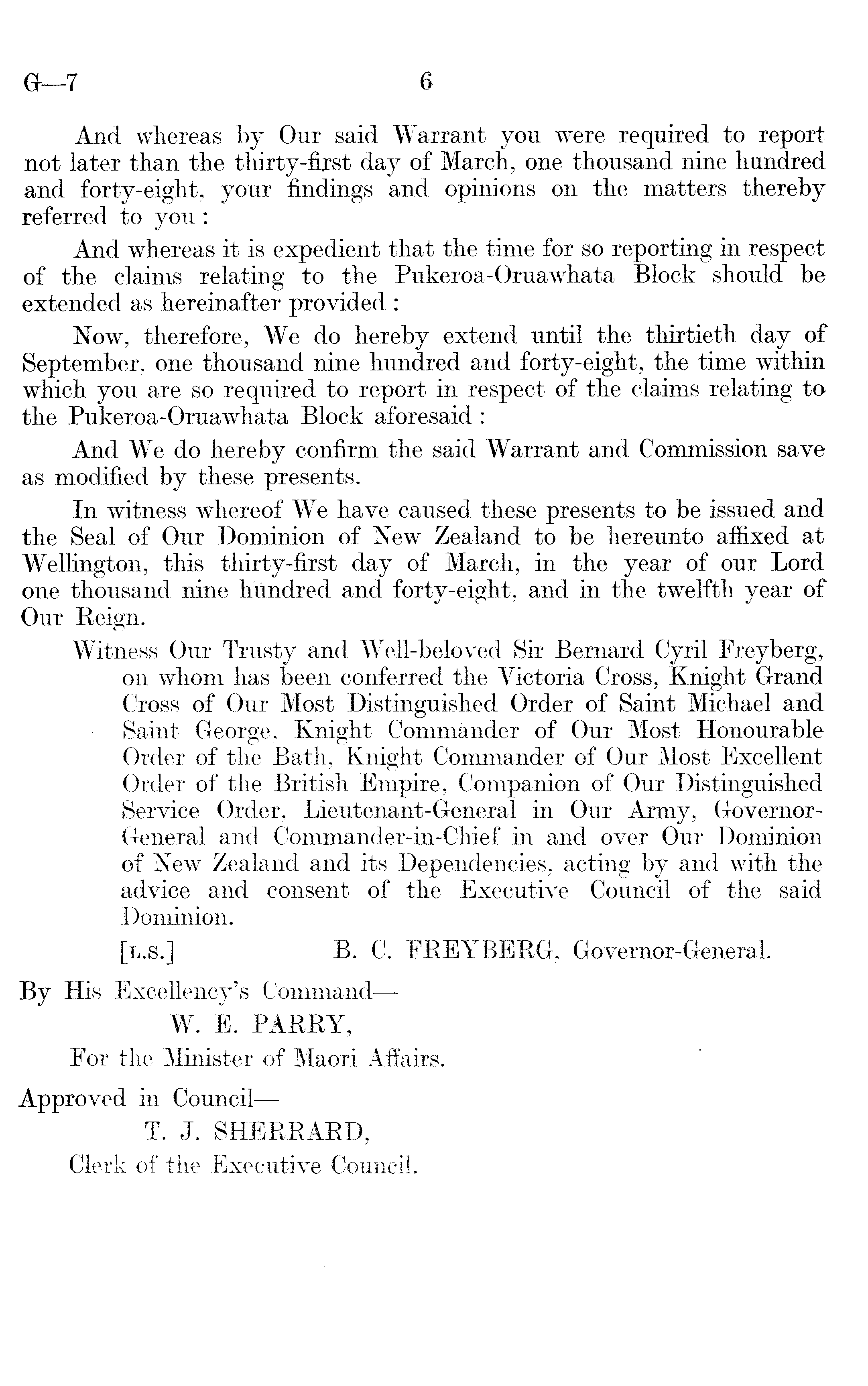 And whereas by Our said Warrant you were required to report not later than the thirty-first day of March, one thousand nine hundred and forty-eight, your findings and opinions on the matters thereby referred to you : And whereas it is expedient that the time for so reporting in respect of the claims relating to the Pukeroa-Oruawhata Block should be extended as hereinafter provided : Now, therefore, We do hereby extend until the thirtieth day of September, one thousand nine hundred and forty-eight, the time within which you are so required to report in respect of the claims relating to the Pukeroa-Oruawhata Block aforesaid : And We do hereby confirm the said Warrant and Commission save as modified by these presents. In witness whereof We have caused these presents to be issued and the Seal of Our Dominion of New Zealand to be hereunto affixed at Wellington, this thirty-first day of March, in the year of our Lord one thousand nine hundred and forty-eight, and in the twelfth year of Our Reign. Witness Our Trusty and Well-beloved Sir Bernard Cyril Freyberg, on whom has been conferred the Victoria Cross, Knight Grand Cross of Our Most Distinguished Order of Saint Michael and Saint George, Knight Commander of Our Most Honourable Order of the Bath, Knight Commander of Our Most Excellent Order of the British Empire, Companion of Our Distinguished Service Order, Lieutenant-General in Our Army, GovernorGeneral and Commander-in-Chief in and over Our Dominion of New Zealand and its Dependencies, acting by and with the advice and consent of the Executive Council of the said Dominion. [l.s.] B. C. FREYBERG, Governor-General. By His Excellency's Command— W. E. PARRY, For the Minister of Maori Affairs. Approved in Council— T. J. SHERRARD, Clerk of the Executive Council.