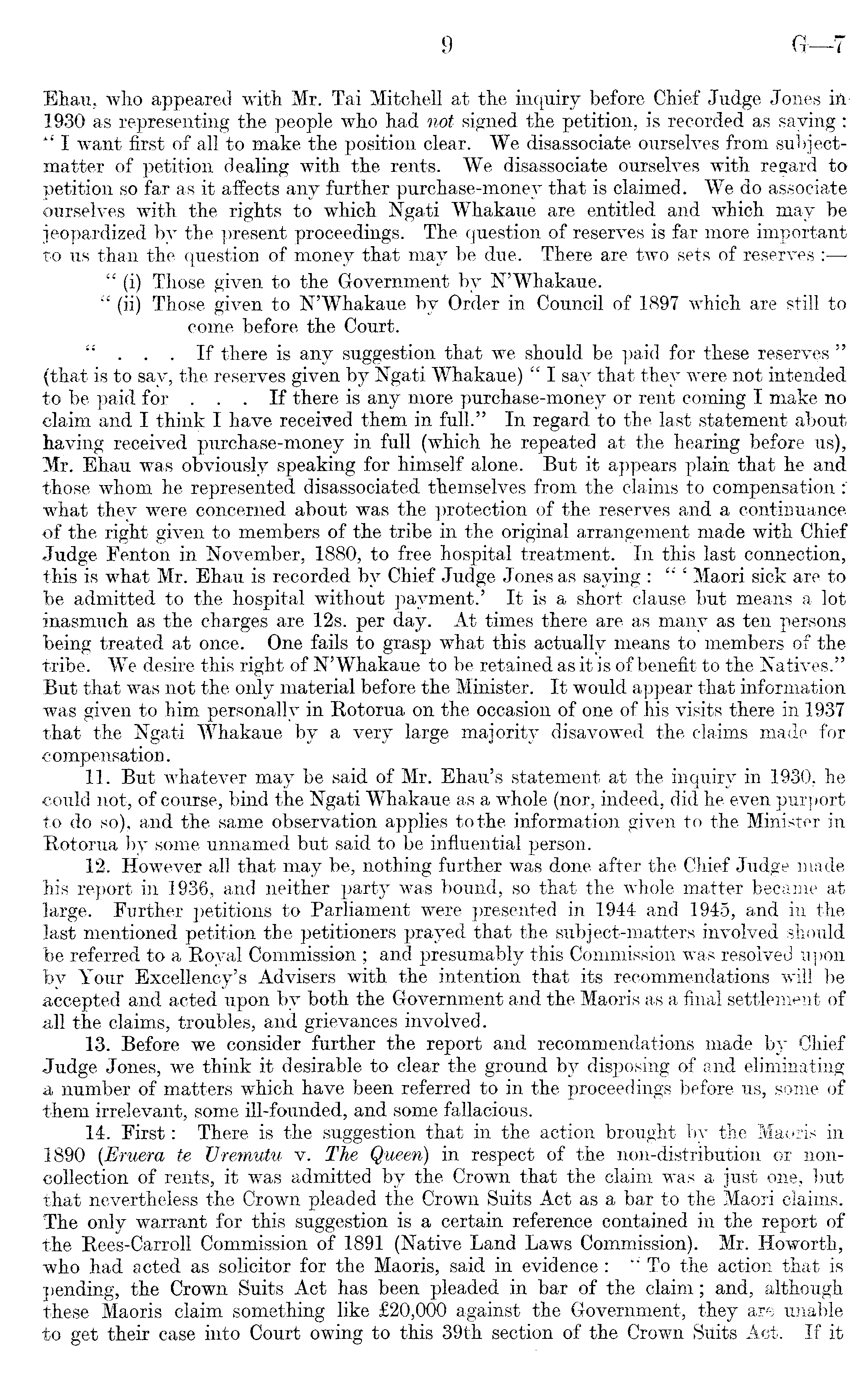 Ehau. who appeared with Mr. Tai Mitchell at the inquiry before Chief Judge Jones in 1930 as representing the people who had not signed the petition, is recorded as saving: " I want first of all to make the position clear. We disassociate ourselves from subjectmatter of petition dealing with the rents. We disassociate ourselves with regard to petition so far as it affects any further purchase-money that is claimed. We do associate ourselves with the rights to which Ngati Whakaue are entitled and which may be jeopardized by the present proceedings. The question of reserves is far more important to us than the question of money that may be due. There are two sets of reserves " (i) Those given to the Government by IST Whakaue. " (ii) Those given to N'Whakaue by Order in Council of 1897 which are still to come before the Court. "... If there is any suggestion that we should be paid for these reserves " (that is to say, the reserves given by Ngati Whakaue) " I say that they were not intended to be paid for ... If there is any more purchase-money or rent coming I make no claim and I think I have received them in full." In regard to the last statement about having received purchase-money in full (which he repeated at the hearing before us), Mr. Ehau was obviously speaking for himself alone. But it appears plain that he and those whom he represented disassociated themselves from the claims to compensation : what they were concerned about was the protection of the reserves and a continuance of the right given to members of the tribe in the original arrangement made with Chief Judge Fenton in November, 1880, to free hospital treatment. In this last connection, this is what Mr. Ehau is recorded by Chief Judge Jones as saying : " ' Maori sick are to be admitted to the hospital without payment.' It is a short clause but means a lot inasmuch as the charges are 12s. per day. At times there are as many as ten persons being treated at once. One fails to grasp what this actually means to members of the tribe. We desire this right of N'Whakaue to be retained as it is of benefit to the Natives." But that was not the only material before the Minister. It would appear that information was given to him personally in Rotorua on the occasion of one of his visits there in 1937 that the Ngati Whakaue by a very large majority disavowed the claims made for compensation. 11. But whatever may be said of Mr. Ehau's statement at the inquiry in 1930, he could not, of course, bind the Ngati Whakaue as a whole (nor, indeed, did he even purport to do so), and the same observation applies to the information given to the Minister in Rotorua by some unnamed but said to be influential person. 12. However all that may be, nothing further was done after the Chief Judge made his report in 1936, and neither party was bound, so that the whole matter became at large. Further petitions to Parliament were presented in 1944 and 1945, and in the last mentioned petition the petitioners prayed that the subject-matters involved should be referred to a Royal Commission ; and presumably this Commission was resolved upon by Your Excellency's Advisers with the intention that its recommendations will be accepted and acted upon by both the Governinent and the Maoris as a final settlement of all the claims, troubles, and grievances involved. 13. Before we consider further the report and recommendations made by Chief Judge Jones, we think it desirable to clear the ground by disposing of and eliminating a number of matters which have been referred to in the proceedings before us, some of them irrelevant, some ill-founded, and some fallacious. 14. First: There is the suggestion that in the action brought by the Maoris in 1890 (Eruera te TJremutu v. The Queen) in respect of the non-distribution or noncollection of rents, it was admitted by the Crown that the claim was a just one, but that nevertheless the Crown pleaded the Crown Suits Act as a bar to the Maori claims. The only warrant for this suggestion is a certain reference contained in the report of the Rees-Carroll Commission of 1891 (Native Land Laws Commission). Mr. Howorth, who had acted as solicitor for the Maoris, said in evidence : "To the action that is pending, the Crown Suits Act has been pleaded in bar of the claim; and, although these Maoris claim something like £20,000 against the Government, they are unable to get their case into Court owing to this 39th section of the Crown Suits Act. If it