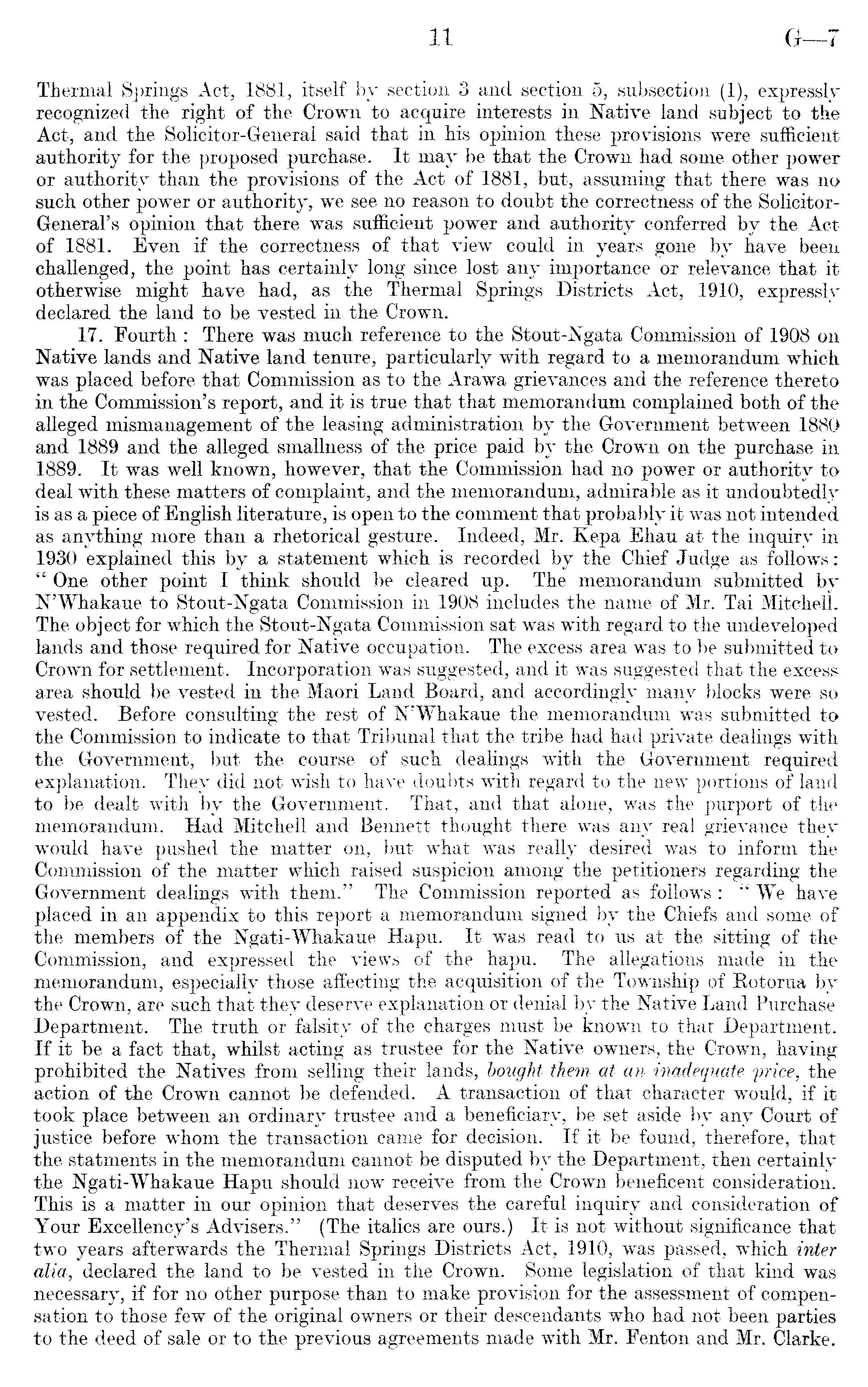 Thermal Springs Act, 1881, itself by section 3 and section 5, subsection (1), expresslyrecognized the right of the Crown to acquire interests in Native land subject to the Act, and the Solicitor-General said that in his opinion these provisions were sufficient authority for the proposed purchase. It may be that the Crown had some other power or authority than the provisions of the Act of 1881, but, assuming that there was no such other power or authority, we see no reason to doubt the correctness of the SolicitorGeneral's opinion that there was sufficient power and authority conferred by the Act of 1881, Even if the correctness of that view could in years gone by have been challenged, the point has certainly long since lost any importance or relevance that it otherwise might have had, as the Thermal Springs Districts Act, 1910, expressly declared the land to be vested in the Crown. 17. Fourth : There was much reference to the Stout-Ngata Commission of 1908 on Native lands and Native land tenure, particularly with regard to a memorandum which was placed before that Commission as to the Arawa grievances and the reference thereto in the Commission's report, and it is true that that memorandum complained both of the alleged mismanagement of the leasing administration by the Government between 1880 and 1889 and the alleged smallness of the price paid by the Crown on the purchase in 1889. It was well known, however, that the Commission had no power or authority to deal with these matters of complaint, and the memorandum, admirable as it undoubtedly is as a piece of English literature, is open to the comment that probably it was not intended as anything more than a rhetorical gesture. Indeed, Mr. Kepa Ehau at the inquiry in 1930 explained this by a statement which is recorded by the Chief Judge as follows: " One other point I think should be cleared up. The memorandum submitted by N'Whakaue to Stout-Ngata Commission in 1908 includes the name of Mr. Tai Mitchell. The object for which the Stout-Ngata Commission sat was with regard to the undeveloped lands and those required for Native occupation. The excess area was to be submitted to Crown for settlement. Incorporation was suggested, and it was suggested that the excess area should be vested in the Maori Land Board, and accordingly many blocks were so vested. Before consulting the rest of N'Whakaue the memorandum was submitted to the Commission to indicate to that Tribunal that the tribe had had private dealings with the Government, but the course of such dealings with the Government required explanation. They did not wish to have doubts with regard to the new portions of land to be dealt with by the Government. That, and that alone, was the purport of the memorandum. Had Mitchell and Bennett thought there was any real grievance they would have pushed the matter on, but what was really desired was to inform the Commission of the matter which raised suspicion among the petitioners regarding the Government dealings with them." The Commission reported as follows : "We have placed in an appendix to this report a memorandum signed by the Chiefs and some of the members of the Ngati-Whakaue Hapu. It was read to us at the sitting of the Commission, and expressed the views of the hapu. The allegations made in the memorandum, especially those affecting the acquisition of the Township of Rotorua by the Crown, are such that they deserve explanation or denial by the Native Land Purchase Department. The truth or falsity of the charges must be known to that Department. If it be a fact that, whilst acting as trustee for the Native owners, the Crown, having prohibited the Natives from selling their lands, bought them at an inadequate -price, the action of the Crown cannot be defended. A transaction of that character would, if it took place between an ordinary trustee and a beneficiary, be set aside bv any Court of justice before whom the transaction came for decision. If it be found, therefore, that the statments in the memorandum cannot be disputed by the Department, then certainly the Ngati-Whakaue Hapu should now receive from the Crown beneficent consideration. This is a matter in our opinion that deserves the careful inquiry and consideration of Your Excellency's Advisers." (The italics are ours.) It is not without significance that two years afterwards the Thermal Springs Districts Act, 1910, was passed, which inter alia, declared the land to be vested in the Crown. Some legislation of that kind was necessary, if for no other purpose than to make provision for the assessment of compensation to those few of the original owners or their descendants who had not been parties to the deed of sale or to the previous agreements made with Mr. Fenton and Mr. Clarke.