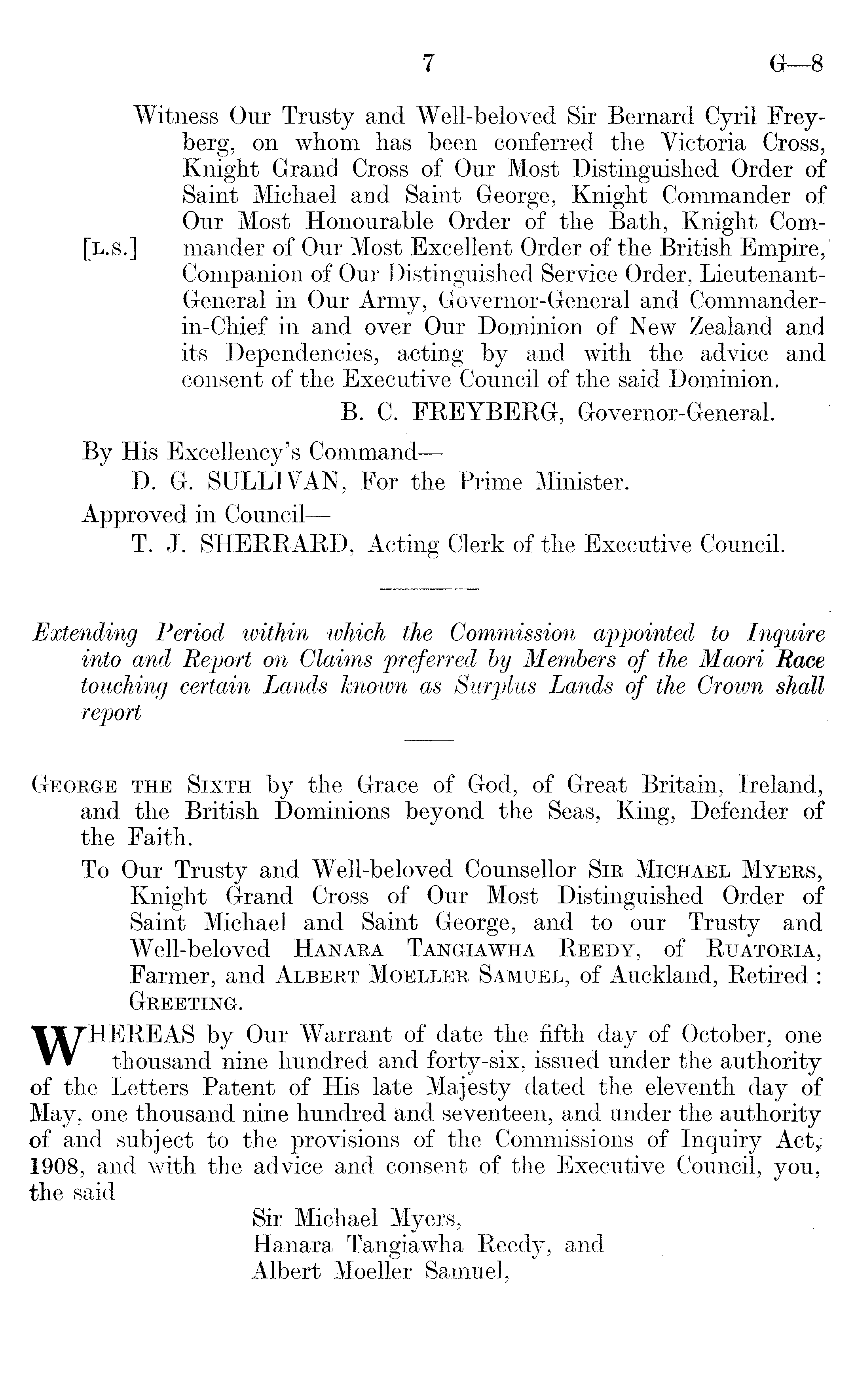 George the Sixth by the Grace of God, of Great Britain, Ireland, and the British Dominions beyond the Seas, King, Defender of the Faith. To Our Trusty and Well-beloved Counsellor Sir Michael Myers, Knight Grand Cross of Our Most Distinguished Order of Saint Michael and Saint George, and to our Trusty and Well-beloved Hanara Tangiawha Reedy, of Ruatoria, Farmer, and Albert Moeller Samuel, of Auckland, Retired : Greeting. WHEREAS by Our Warrant of date the fifth day of October, one thousand nine hundred and forty-six, issued under the authority of the Letters Patent of His late Majesty dated the eleventh day of May, one thousand nine hundred and seventeen, and under the authority of and subject to the provisions of the Commissions of Inquiry Act, 1908, and with the advice and consent of the Executive Council, you, the said Sir Michael Myers, Hanara Tangiawha Reedy, and Albert Moeller Samuel,