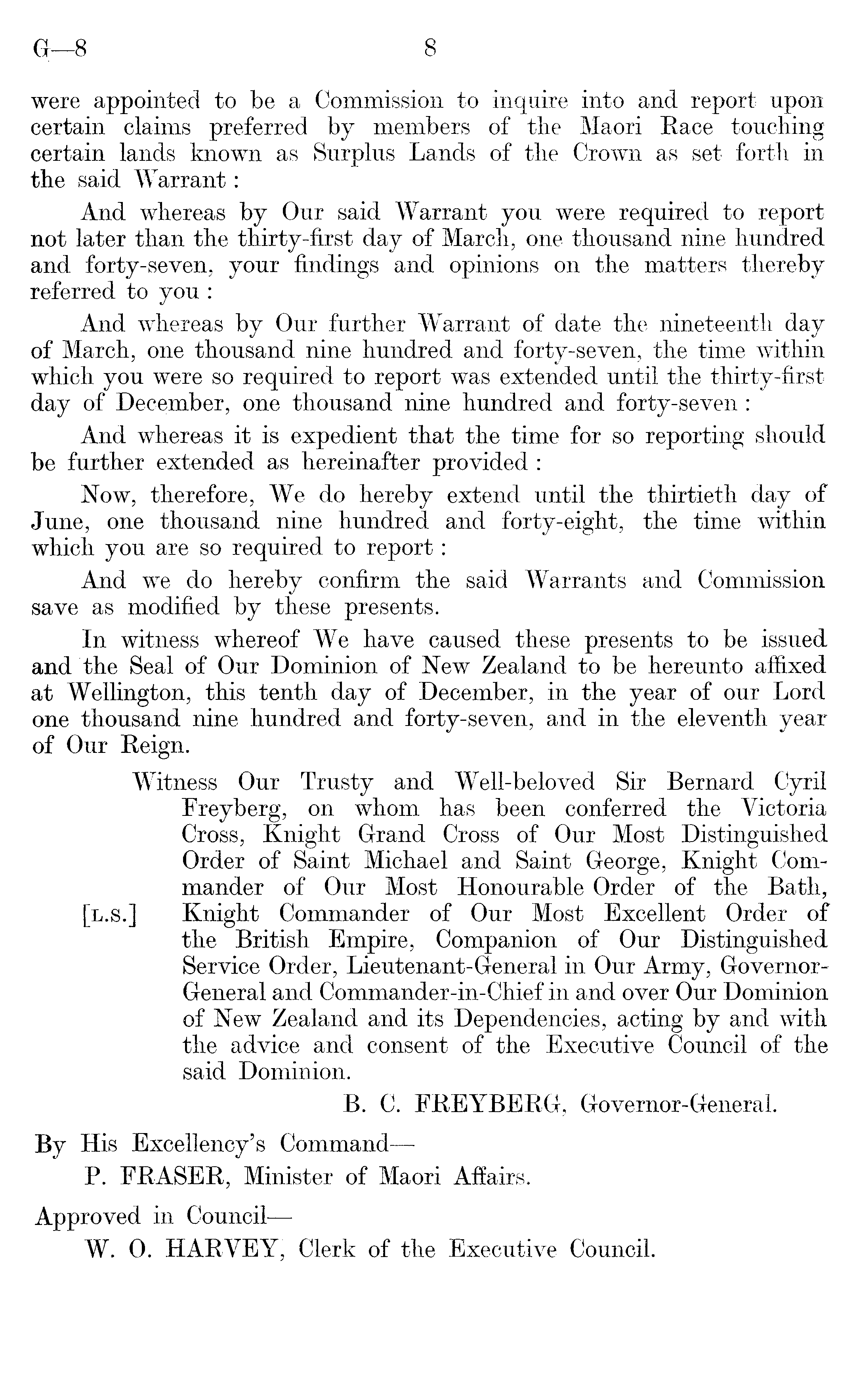 were appointed to be a Commission to inquire into and report upon certain claims preferred by members of the Maori Race touching certain lands known as Surplus Lands of the Crown as set forth in the said Warrant: And whereas by Our said Warrant you were required to report not later than the thirty-first day of March, one thousand nine hundred and forty-seven, your findings and opinions on the matters thereby referred to you : And whereas by Our further Warrant of date the nineteenth day of March, one thousand nine hundred and forty-seven, the time within which you were so required to report was extended until the thirty-first day of December, one thousand nine hundred and forty-seven : And whereas it is expedient that the time for so reporting should be further extended as hereinafter provided : Now, therefore, We do hereby extend until the thirtieth day of June, one thousand nine hundred and forty-eight, the time within which you are so required to report: And we do hereby confirm the said Warrants and Commission save as modified by these presents. In witness whereof We have caused these presents to be issued and the Seal of Our Dominion of New Zealand to be hereunto affixed at Wellington, this tenth day of December, in the year of our Lord one thousand nine hundred and forty-seven, and in the eleventh year of Our Reign. Witness Our Trusty and Well-beloved Sir Bernard Cyril Freyberg, on whom has been conferred the Victoria Cross, Knight Grand Cross of Our Most Distinguished Order of Saint Michael and Saint George, Knight Commander of Our Most Honourable Order of the Bath, [L.S.] Knight Commander of Our Most Excellent Order of the British Empire, Companion of Our Distinguished Service Order, Lieutenant-General in Our Army, GovernorGeneral and Commander-in-Chief in and over Our Dominion of New Zealand and its Dependencies, acting by and with the advice and consent of the Executive Council of the said Dominion. B. C. FREYBERG, Governor-General. By His Excellency's Command — P. FRASER, Minister of Maori Affairs. Approved in Council— W. 0. HARVEY, Clerk of the Executive Council.