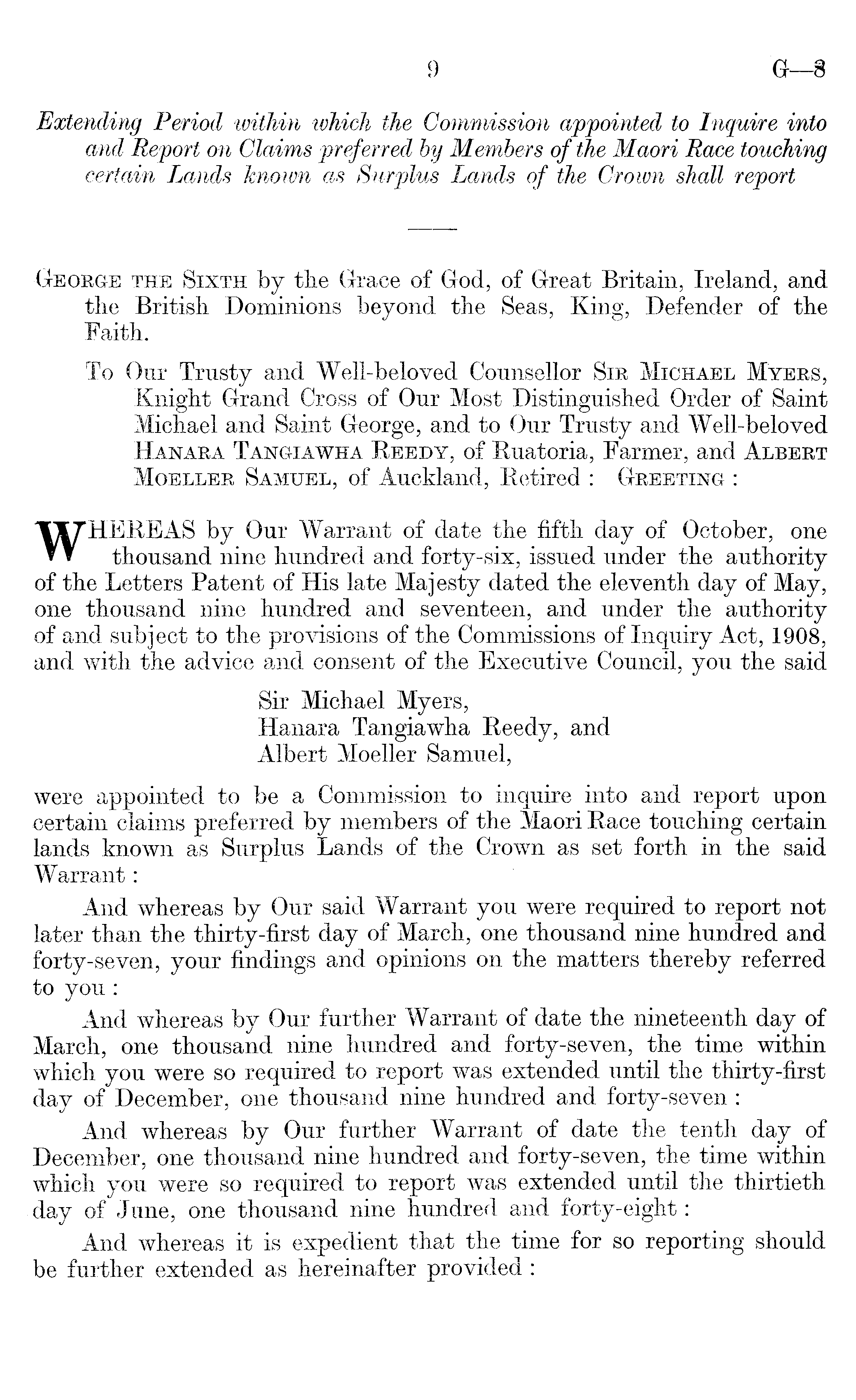 «George the Sixth by the Grace of God, of Great Britain, Ireland, and the British Dominions beyond the Seas, King, Defender of the Faith. To Our Trusty and Well-beloved Counsellor Sir Michael Myers, Knight Grand Cross of Our Most Distinguished Order of Saint Michael and Saint George, and to Our Trusty and Well-beloved Hanara Tangiawha Reedy, of Ruatoria, Farmer, and Albert Moeller Samuel, of Auckland, Retired : Greeting : WHEREAS by Our Warrant of date the fifth day of October, one thousand nine hundred and forty-six, issued under the authority of the Letters Patent of His late Majesty dated the eleventh day of May, one thousand nine hundred and seventeen, and under the authority of and subject to the provisions of the Commissions of Inquiry Act, 1908, and with the advice and consent of the Executive Council, you the said Sir Michael Myers, Hanara Tangiawha Reedy, and Albert Moeller Samuel, were appointed to be a Commission to inquire into and report upon certain claims preferred by members of the Maori Race touching certain lands known as Surplus Lands of the Crown as set forth in the said Warrant: And whereas by Our said Warrant you were required to report not later than the thirty-first day of March, one thousand nine hundred and forty-seven, your findings and opinions on the matters thereby referred to you: And whereas by Our further Warrant of date the nineteenth day of March, one thousand nine hundred and forty-seven, the time within which you were so required to report was extended until the thirty-first day of December, one thousand nine hundred and forty-seven: And whereas by Our further Warrant of date the tenth day of December, one thousand nine hundred and forty-seven, the time within which you were so required to report was extended until the thirtieth day of June, one thousand nine hundred and forty-eight: And whereas it is expedient that the time for so reporting should be further extended as hereinafter provided :