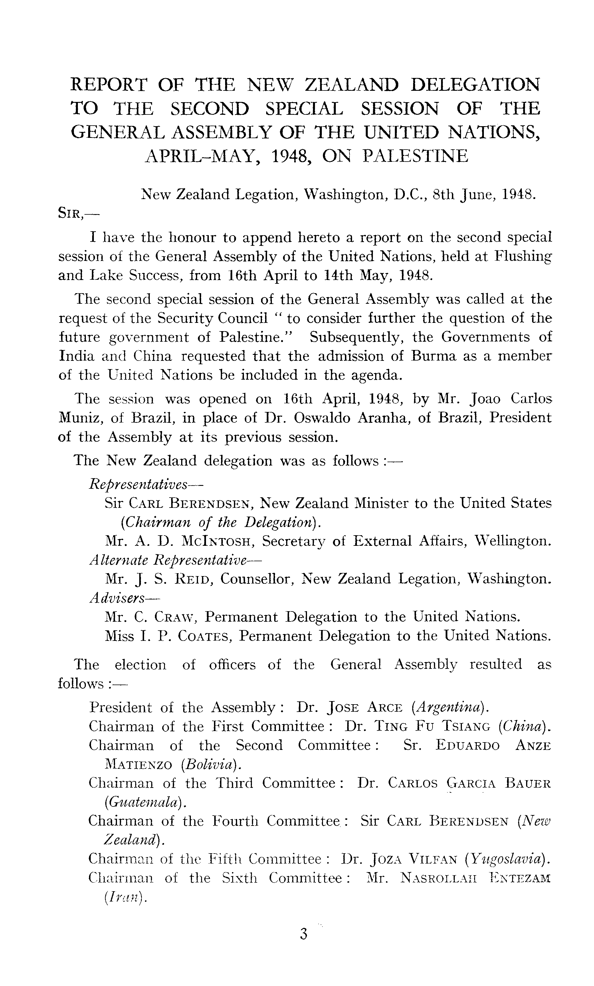 REPORT OF THE NEW ZEALAND DELEGATION TO THE SECOND SPECIAL SESSION OF THE GENERAL ASSEMBLY OF THE UNITED NATIONS, APRIL-MAY, 1948, ON PALESTINE New Zealand Legation, Washington, D.C., Bth June, 1948. Sir, — I have the honour to append hereto a report on the second special session of the General Assembly of the United Nations, held at Flushing and Lake Success, from 16th April to 14th May, 1948. The second special session of the General Assembly was called at the request of the Security Council " to consider further the question of the future government of Palestine." Subsequently, the Governments of India and China requested that the admission of Burma as a member of the United Nations be included in the agenda. The session was opened on 16th April, 1948, by Mr. Joao Carlos Muniz, of Brazil, in place of Dr. Oswaldo Aranha, of Brazil, President of the Assembly at its previous session. The New Zealand delegation was as follows : Representatives — Sir Carl Berendsen, New Zealand Minister to the United States {Chairman of the Delegation). Mr. A. D. Mclntosh, Secretary of External Affairs, Wellington. Alternate Representative — Mr. J. S. Reid, Counsellor, New Zealand Legation, Washington. Advisers— Mr. C. Craw, Permanent Delegation to the United Nations. Miss I. P. Coates, Permanent Delegation to the United Nations. The election of officers of the General Assembly resulted as follows : President of the Assembly : Dr. Jose Arce {Argentina). Chairman of the First Committee : Dr. Ting Fu Tsiang {China). Chairman of the Second Committee: Sr. Eduardo Anze Matienzo {Bolivia). Chairman of the Third Committee: Dr. Carlos Garcia Bauer {Guatemala). Chairman of the Fourth Committee : Sir Carl Berendsen {New Zealand). Chairman of the Fifth Committee : Dr. Joza Vilfan {Yugoslavia). Chairman of the Sixth Committee: Mr. Nasrollah Entezam {lran).