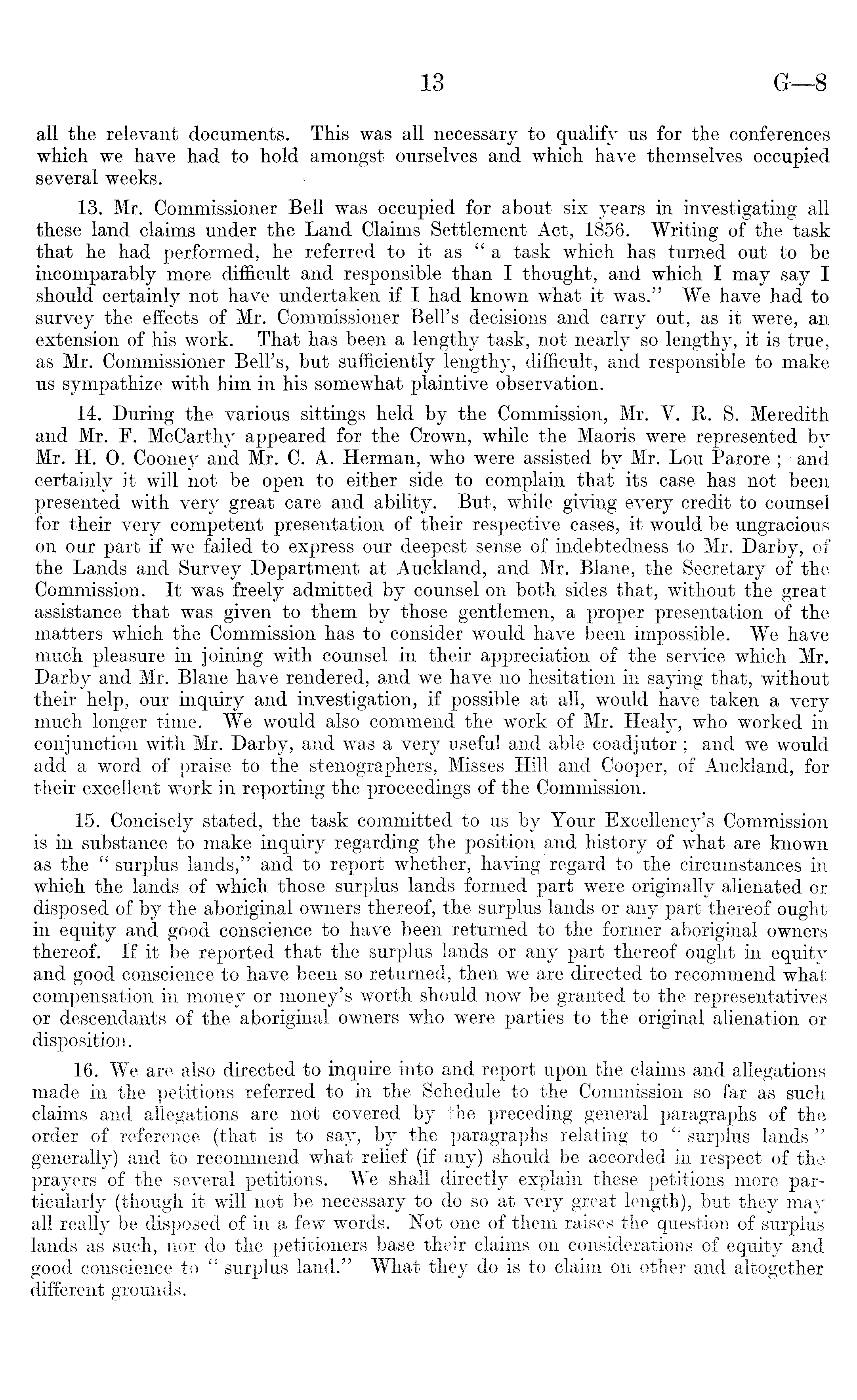 all the relevant documents. This was all necessary to qualify us for the conferences which we have had to hold amongst ourselves and which have themselves occupied several weeks. • 13. Mr. Commissioner Bell was occupied for about six years in investigating all these land claims under the Land Claims Settlement Act, 1856. Writing of the task that he had performed, he referred to it as "a task which has turned out to be incomparably more difficult and responsible than I thought, and which I may say I should certainly not have undertaken if I had known what it was." We have had to survey the effects of Mr. Commissioner Bell's decisions and carry out, as it were, an extension of his work. That has been a lengthy task, not nearly so lengthy, it is true, as Mr. Commissioner Bell's, but sufficiently lengthy, difficult, and responsible to make us sympathize with him in his somewhat plaintive observation. 14. During the various sittings held by the Commission, Mr. V. R. S. Meredith and Mr. F. McCarthy appeared for the Crown, while the Maoris were represented by Mr. H. 0. Cooney and Mr. C. A. Herman, who were assisted by Mr. Lou Parore ; and certainly it will not be open to either side to complain that its case has not been presented with very great care and ability. But, while giving every credit to counsel for their very competent presentation of their respective cases, it would be ungracious on our part if we failed to express our deepest sense of indebtedness to Mr. Darby, of the Lands and Survey Department at Auckland, and Mr. Blane, the Secretary of the Commission. It was freely admitted by counsel on both sides that, without the great assistance that was given to them by those gentlemen, a proper presentation of the matters which the Commission has to consider would have been impossible. We have much pleasure in joining with counsel in their appreciation of the service which Mr. Darby and Mr. Blane have rendered, and we have no hesitation in saying that, without their help, our inquiry and investigation, if possible at all, would have taken a very much longer time. We would also commend the work of Mr. Healy, who worked in conjunction with Mr. Darby, and was a very useful and able coadjutor ; and we would add a word of praise to the stenographers, Misses Hill and Cooper, of Auckland, for their excellent work in reporting the proceedings of the Commission. 15. Concisely stated, the task committed to us by Your Excellency's Commission is in substance to make inquiry regarding the position and history of what are known as the " surplus lands," and to report whether, having regard to the circumstances in which the lands of which those surplus lands formed part were originally alienated or disposed of by the aboriginal owners thereof, the surplus lands or any part thereof ought in equity and good conscience to have been returned to the former aboriginal owners thereof. If it be reported that the surplus lands or any part thereof ought in equity and good conscience to have been so returned, then we are directed to recommend what compensation in money or money's worth should now be granted to the representatives or descendants of the aboriginal owners who were parties to the original alienation or disposition. 16. We are also directed to inquire into and report upon the claims and allegations made in the petitions referred to in the Schedule to the Commission so far as such claims and allegations are not covered by the preceding general paragraphs of the order of reference (that is to say, by the paragraphs relating to " surplus lands " generally) and to recommend what relief (if any) should be accorded in respect of the prayers of the several petitions. We shall directly explain these petitions more particularly (though it will not be necessary to do so at very great length), but they may all really be disposed of in a few words. Not one of them raises the question of surplus lands as such, nor do the petitioners base their claims on considerations of equity and good conscience to " surplus land." What they do is to claim on other and altogether different grounds.