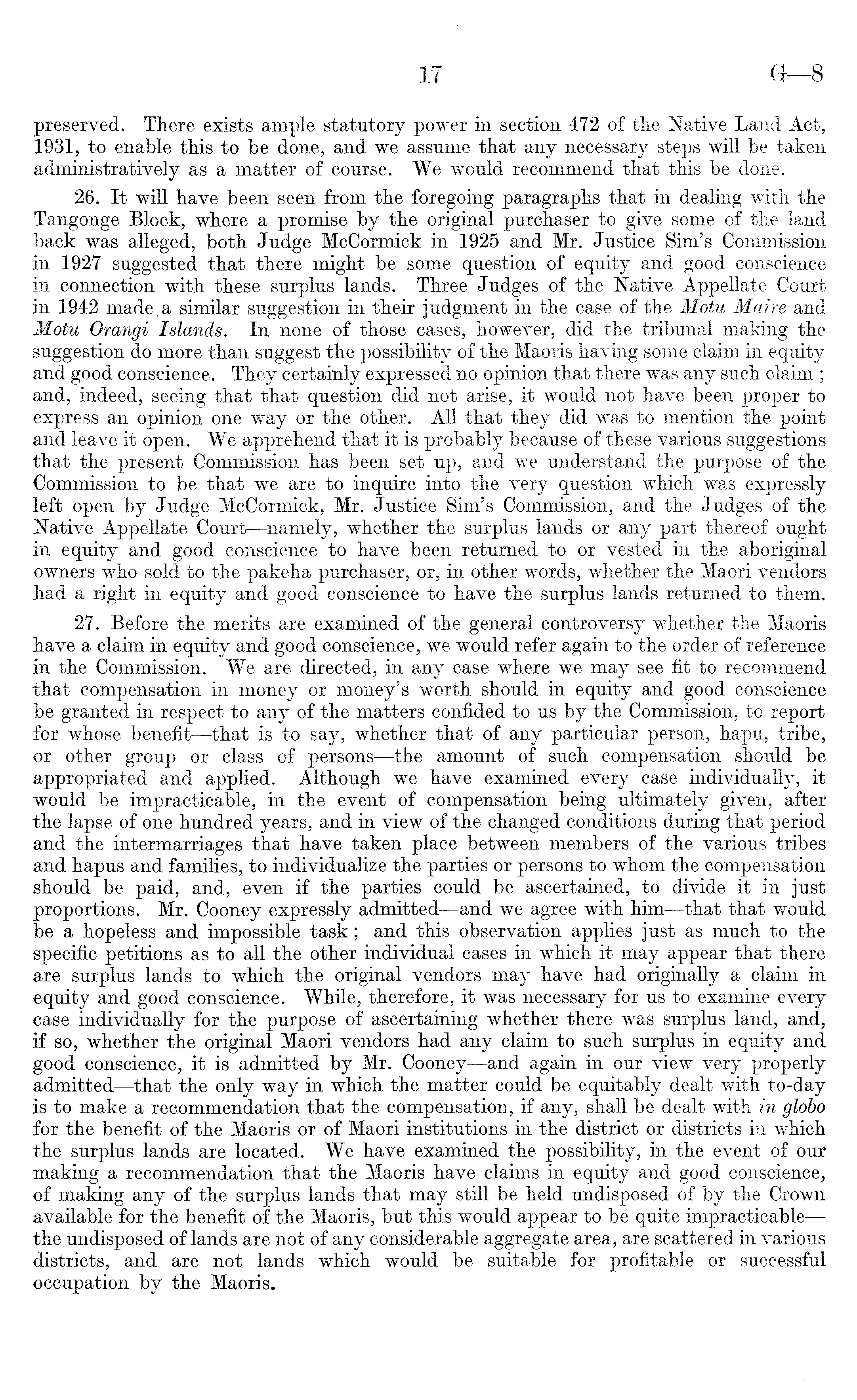 preserved. There exists ample statutory power in section 472 of the Native Land Act, 1931, to enable this to be done, and we assume that any necessary steps will be taken administratively as a matter of course. We would recommend that this be done. 26. It will have been seen from the foregoing paragraphs that in dealing with the Tangonge Block, where a promise by the original purchaser to give some of the land back was alleged, both Judge McCormick in 1925 and Mr. Justice Sim's Commission in 1927 suggested that there might be some question of equity and good conscience in connection with these surplus lands. Three Judges of the Native Appellate Court in 1942 made.a similar suggestion in their judgment in the case of the Motu Maire and Motu Orangi Islands. In none of those cases, however, did the tribunal making the suggestion do more than suggest the possibility of the Maoris having some claim in equity and good conscience. They certainly expressed no opinion that there was any such claim ; and, indeed, seeing that that question did not arise, it would not have been proper to express an opinion one way or the other. All that they did was to mention the point and leave it open. We apprehend that it is probably because of these various suggestions that the present Commission has been set up, and we understand the purpose of the Commission to be that we are to inquire into the very question which was expressly left open by Judge McCormick, Mr. Justice Sim's Commission, and the Judges of the Native Appellate Court —namely, whether the surplus lands or any part thereof ought in equity and good conscience to have been returned to or vested in the aboriginal owners who sold to the pakeha purchaser, or, in other words, whether the Maori vendors had a right in equity and good conscience to have the surplus lands returned to them. 27. Before the merits are examined of the general controversy whether the Maoris have a claim in equity and good conscience, we would refer again to the order of reference in the Commission. We are directed, in any case where we may see fit to recommend that compensation in money or money's worth should in equity and good conscience be granted in respect to any of the matters confided to us by the Commission, to report for whose benefit—that is to say, whether that of any particular person, hapu, tribe, or other group or class of persons —the amount of such compensation should be appropriated and applied. Although we have examined every case individually, it would be impracticable, in the event of compensation being ultimately given, after the lapse of one hundred years, and in view of the changed conditions during that period and the intermarriages that have taken place between members of the various tribes and hapus and families, to individualize the parties or persons to whom the compensation should be paid, and, even if the parties could be ascertained, to divide it in just proportions. Mr. Cooney expressly admitted —and we agree with him —that that would be a hopeless and impossible task; and this observation applies just as much to the specific petitions as to all the other individual cases in which it may appear that there are surplus lands to which the original vendors may have had originally a claim in equity and good conscience. While, therefore, it was necessary for us to examine every case individually for the purpose of ascertaining whether there was surplus land, and, if so, whether the original Maori vendors had any claim to such surplus in equity and good conscience, it is admitted by Mr. Cooney —and again in our view very properly admitted—that the only way in which the matter could be equitably dealt with to-day is to make a recommendation that the compensation, if any, shall be dealt with in globo for the benefit of the Maoris or of Maori institutions in the district or districts in which the surplus lands are located. We have examined the possibility, in the event of our making a recommendation that the Maoris have claims in equity and good conscience, of making any of the surplus lands that may still be held undisposed of by the Crown available for the benefit of the Maoris, but this would appear to be quite impracticable — the undisposed of lands are not of any considerable aggregate area, are scattered in various districts, and are not lands which would be suitable for profitable or successful occupation by the Maoris.