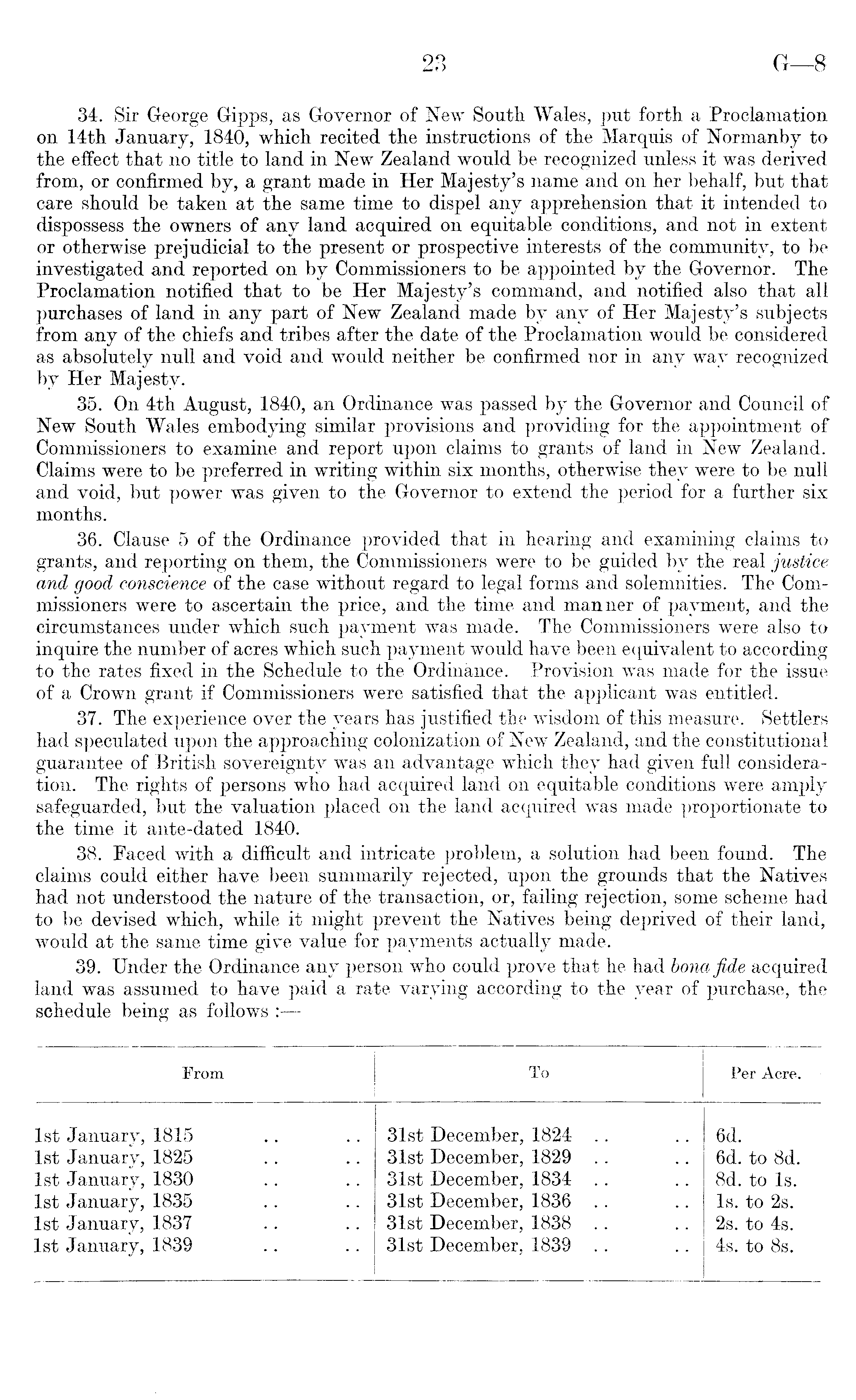 34. Sir George Gipps, as Governor of New South Wales, put forth a Proclamation on 14th January, 1840, which recited the instructions of the Marquis of Normanby to the effect that no title to land in New Zealand would be recognized unless it was derived from, or confirmed by, a grant made in Her Majesty's name and on her behalf, but that care should be taken at the same time to dispel any apprehension that it intended to dispossess the owners of any land acquired on equitable conditions, and not in extent or otherwise prejudicial to the present or prospective interests of the community, to be investigated and reported on by Commissioners to be appointed by the Governor. The Proclamation notified that to be Her Majesty's command, and notified also that all purchases of land in any part of New Zealand made by any of Her Majesty's subjects from any of the chiefs and tribes after the date of the Proclamation would be considered as absolutely null and void and would neither be confirmed nor in any way recognized by Her Majesty. 35. On 4th August, 1840, an Ordinance was passed by the Governor and Council of New South Wales embodying similar provisions and providing for the appointment of Commissioners to examine and report upon claims to grants of land in New Zealand. Claims were to be preferred in writing within six months, otherwise they were to be null and void, but power was given to the Governor to extend the period for a further six months. 36. Clause 5 of the Ordinance provided that in hearing and examining claims to grants, and reporting on them, the Commissioners were to be guided by the real justice and good conscience of the case without regard to legal forms and solemnities. The Commissioners were to ascertain the price, and the time and manner of payment, and the circumstances under which such payment was made. The Commissioners were also to inquire the number of acres which such payment would have been equivalent to according to the rates fixed in the Schedule to the Ordinance. Provision was made for the issue of a Crown grant if Commissioners were satisfied that the applicant was entitled. 37. The experience over the years has justified the wisdom of this measure. Settlers had speculated upon the approaching colonization of New Zealand, and the constitutional guarantee of British sovereignty was an advantage which they had given full consideration. The rights of persons who had acquired land on equitable conditions were amply safeguarded, but the valuation placed on the land acquired was made proportionate to the time it ante-dated 1840. 38. Faced with a difficult and intricate problem, a solution had been found. The claims could either have been summarily rejected, upon the grounds that the Natives had not understood the nature of the transaction, or, failing rejection, some scheme had to be devised which, while it might prevent the Natives being deprived of their land, would at the same time give value for payments actually made. 39. Under the Ordinance any person who could prove that he had bona fide acquired land was assumed to have paid a rate varying according to the year of purchase, the schedule being as follows :
