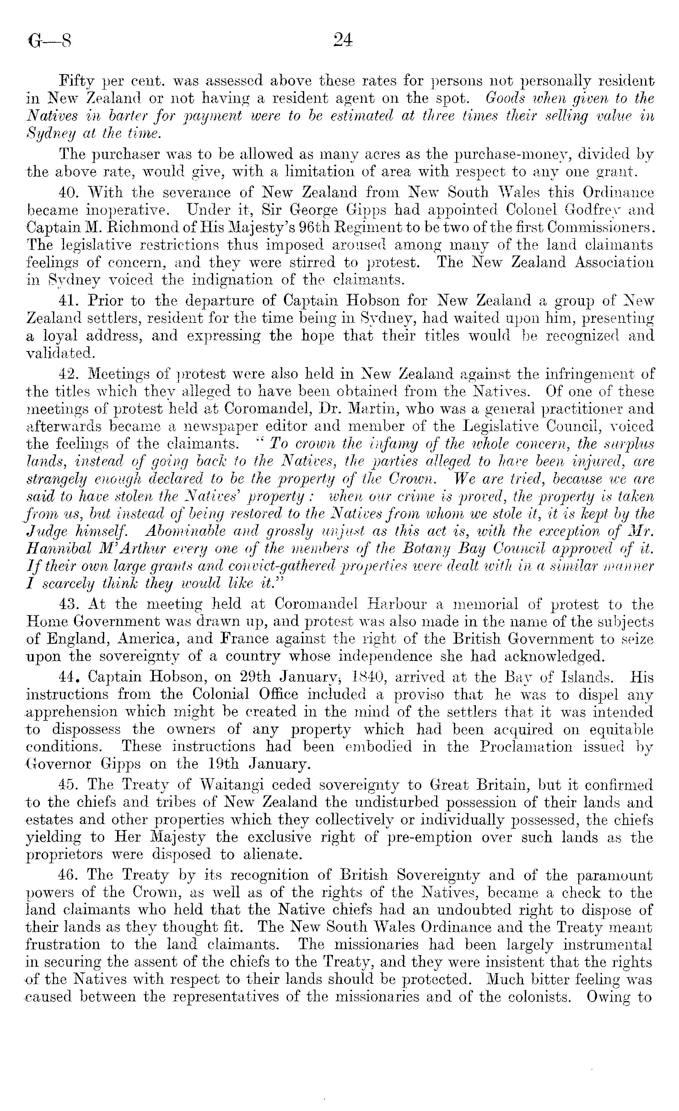 Fifty per cent, was assessed above these rates for persons not personally resident in New Zealand or not having a resident agent on the spot. Goods when given to the Natives in barter for 'payment were to be estimated at three times their selling value in Sydney at the time. The purchaser was to be allowed as many acres as the purchase-money, divided by the above rate, would give, with a limitation of area with respect to any one grant. 40. With the severance of New Zealand from New South Wales this Ordinance became inoperative. Under it, Sir George Gipps had appointed Colonel Godfrey and ■Captain M. Richmond of His Majesty's 96th Regiment to be two of the first Commissioners. The legislative restrictions thus imposed aroused among many of the land claimants feelings of concern, and they were stirred to protest. The New Zealand Association in Sydney voiced the indignation of the claimants. 41. Prior to the departure of Captain Hobson for New Zealand a group of New Zealand settlers, resident for the time being in Sydney, had waited upon him, presenting a loyal address, and expressing the hope that their titles would be recognized and validated. 42. Meetings of protest were also held in New Zealand against the infringement of the titles which they alleged to have been obtained from the Natives. Of one of these meetings of protest held at Coromandel, Dr. Martin, who was a general practitioner and afterwards became a newspaper editor and member of the Legislative Council, voiced the feelings of the claimants. "To crown the infamy of the whole concern, the surplus lands, instead of going back to the Natives, the parties alleged to have been injured, are strangely enough declared to be the property of the Crown. We are tried, because we are said to have stolen the Natives' property : when our crime is proved, the property is taken from us, but instead of being restored to the Natives from whom we stole it, it is kept by the Judge himself. Abominable and grossly unjust as this act is, with the exception of Mr. Hannibal M'Arthur every one of the members of the Botany Bay Council approved of it. If their own large grants and convict-gathered properties were dealt with in a similar manner I scarcely think they would like it." 43. At the meeting held at Coromandel Harbour a memorial of protest to the Home G-overnment was drawn up, and protest was also made in the name of the subjects ■of England, America, and France against the right of the British Government to seize upon the sovereignty of a country whose independence she had acknowledged. 44. Captain Hobson, on 29th lB4O, arrived at the Bay of Islands. His instructions from the Colonial Office included a proviso that he was to dispel any apprehension which might be created in the mind of the settlers that it was intended to dispossess the owners of any property which had been acquired on equitable •conditions. These instructions had been embodied in the Proclamation issued by •Governor Gipps on the 19th January. 45. The Treaty of Waitangi ceded sovereignty to Great Britain, but it confirmed to the chiefs and tribes of New Zealand the undisturbed possession of their lands and estates and other properties which they collectively or individually possessed, the chiefs yielding to Her Majesty the exclusive right of pre-emption over such lands as the proprietors were disposed to alienate. 46. The Treaty by its recognition of British Sovereignty and of the paramount powers of the Crown, as well as of the rights of the Natives, became a check to the land claimants who held that the Native chiefs had an undoubted right to dispose of their lands as they thought fit. The New South Wales Ordinance and the Treaty meant frustration to the land claimants. The missionaries had been largely instrumental in securing the assent of the chiefs to the Treaty, and they were insistent that the rights ■of the Natives with respect to their lands should be protected. Much bitter feeling was -caused between the representatives of the missionaries and of the colonists. Owing to