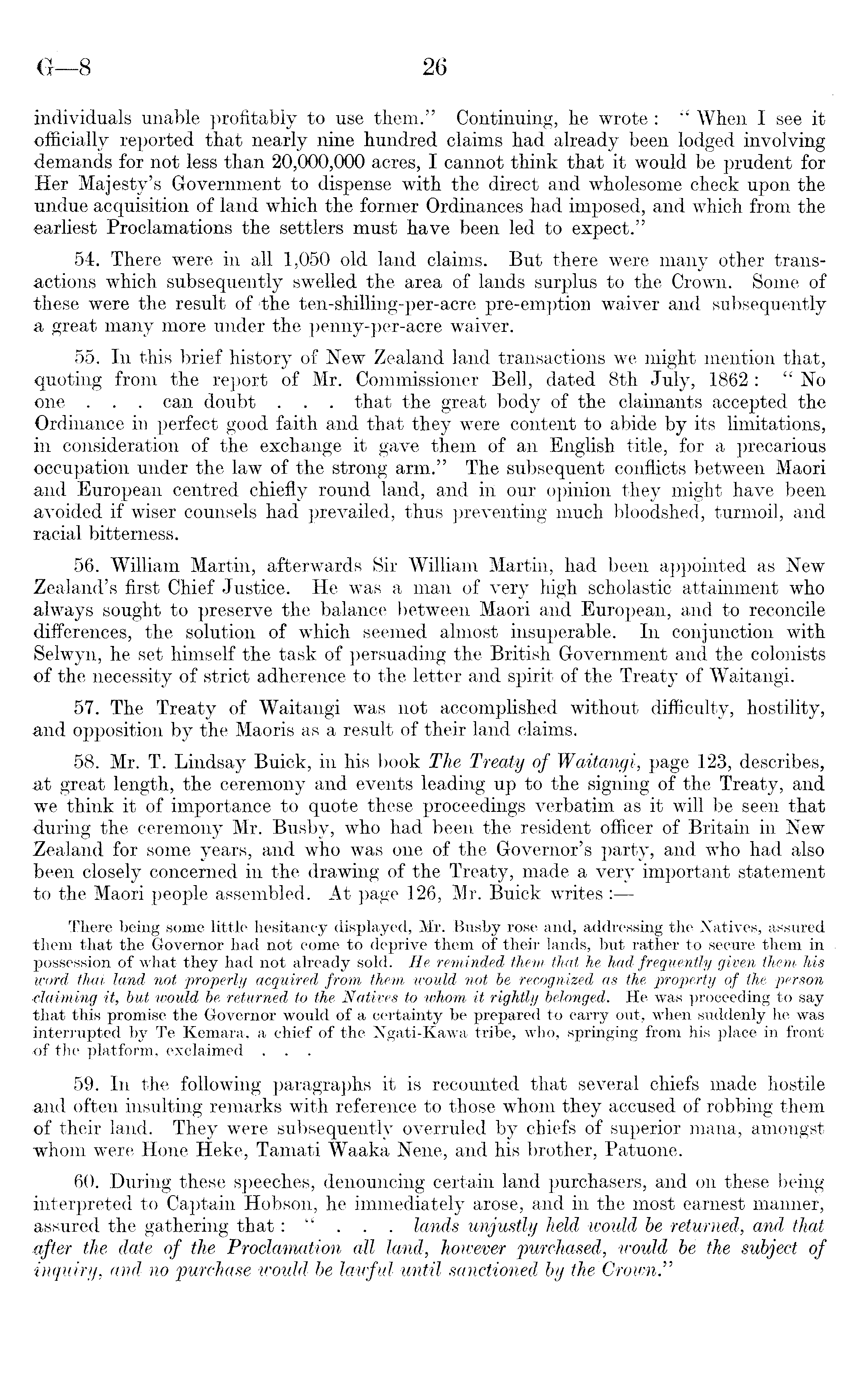 individuals unable profitably to use them." Continuing, lie wrote : " When I see it officially reported that nearly nine hundred claims had already been lodged involving demands for not less than 20,000,000 acres, I cannot think that it would be prudent for Her Majesty's Government to dispense with the direct and wholesome check upon the undue acquisition of land which the former Ordinances had imposed, and which from the earliest Proclamations the settlers must have been led to expect." 54. There were in all 1,050 old land claims. But there were many other transactions which subsequently swelled the area of lands surplus to the Crown. Some of these were the result of the ten-shilling-per-acre pre-emption waiver and subsequently a great many more under the penny-per-acre waiver. 55. In this brief history of New Zealand land transactions we might mention that, quoting from the report of Mr. Commissioner Bell, dated Bth July, 1862 : "No one . . . can doubt . . . that the great body of the claimants accepted the Ordinance in perfect good faith and that they were content to abide by its limitations, in consideration of the exchange it gave them of an English title, for a precarious occupation under the law of the strong arm." The subsequent conflicts between Maori and European centred chiefly round land, and in our opinion they might have been avoided if wiser counsels had prevailed, thus preventing much bloodshed, turmoil, and racial bitterness. 56. William Martin, afterwards Sir William Martin, had been appointed as New Zealand's first Chief Justice. He was a man of very high scholastic attainment who always sought to preserve the balance between Maori and European, and to reconcile differences, the solution of which seemed almost insuperable. In conjunction with Selwyn, he set himself the task of persuading the British Government and the colonists of the necessity of strict adherence to the letter and spirit of the Treaty of Waitangi. 57. The Treaty of Waitangi was not accomplished without difficulty, hostility, and opposition by the Maoris as a result of their land claims. 58. Mr. T. Lindsay Buick, in his book The Treaty of Waitangi, page 123, describes, at great length, the ceremony and events leading up to the signing of the Treaty, and we think it of importance to quote these proceedings verbatim as it will be seen that during the ceremony Mr. Busby, who had been the resident officer of Britain in New Zealand for some years, and who was one of the Governor's party, and who had also been closely concerned in the drawing of the Treaty, made a very important statement to the Maori people assembled. At page 126, Mr. Buick writes : There being some little hesitancy displayed, Mr. Busby rose and, addressing the Natives, assured them that the Governor had not come to deprive them of their lands, but rather to secure them in possession of what they had not already sold. He reminded them that he had frequently given them his word thai land not properly acquired from them would not be recognized as the property of the person claiming it, but would be returned to the Natives to whom it rightly belonged. He was proceeding to say that this promise the Governor would of a certainty be prepared to carry out, when suddenly he was interrupted by Te Kemara, a chief of the Ngati-Kawa tribe, who, springing from his place in front of the platform, exclaimed . . . 59. In the following paragraphs it is recounted that several chiefs made hostile and often insulting remarks with reference to those whom they accused of robbing them of their land. They were subsequently overruled by chiefs of superior mana, amongst whom were Hone Heke, Tamati Waaka Nene, and his brother, Patuone. 60. During these speeches, denouncing certain land purchasers, and on these being interpreted to Captain Hobson, he immediately arose, and in the most earnest manner, assured the gathering that: " . . . lands unjustly held would be returned, and that -after the date of the Proclamation all land, however purchased, would be the subject of inquiry, and no purchase would be laivful until sanctioned by the Crown."