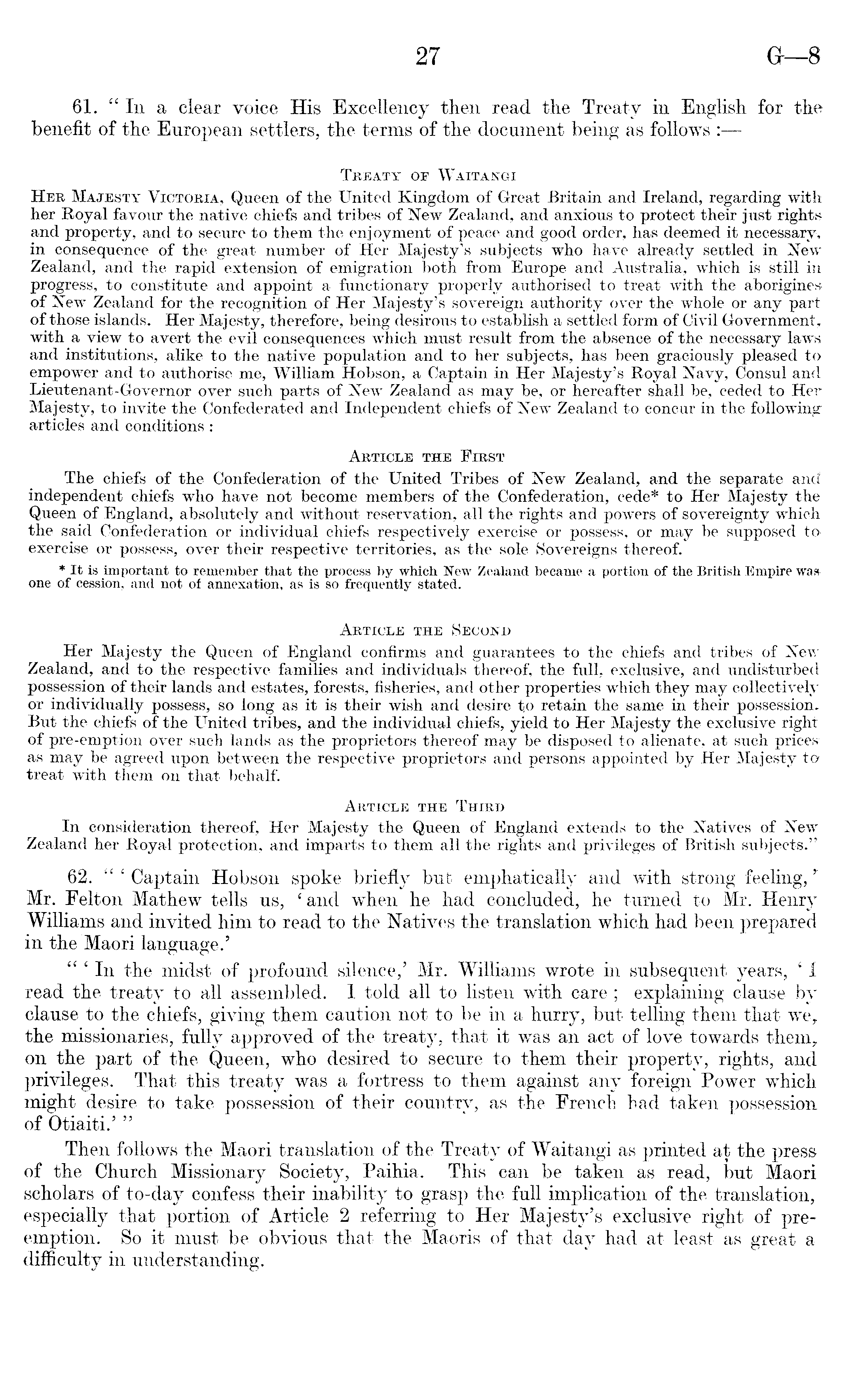 61. "In a clear voice His Excellency then read the Treaty in English for the benefit of the European settlers, the terms of the document being as follows : —• Treaty of Waitangi Her Majesty Victoria, Queen of the United Kingdom of Great Britain and Ireland, regarding with her Royal favour the native chiefs and tribes of New Zealand, and anxious to protect their just rights and property, and to secure to them the enjoyment of peace and good order, has deemed it necessary, in consequence of the great number of Her Majesty's subjects who have already settled in New Zealand, and the rapid extension of emigration both from Europe and Australia, which is still in progress, to constitute and appoint a functionary properly authorised to treat with the aborigines of New Zealand for the recognition of Her Majesty's sovereign authority over the whole or any part of those islands. Her Majesty, therefore, being desirous to establish a settled form of Civil Government, with a view to avert the evil consequences which must result from the absence of the necessary laws and institutions, alike to the native population and to her subjects, has been graciously pleased to empower and to authorise me, William Hobson, a Captain in Her Majesty's Royal Navy, Consul and Lieutenant-Governor over such parts of New Zealand as may be, or hereafter shall be, ceded to Her Majesty, to invite the Confederated and Independent chiefs of New Zealand to concur in the following articles and conditions : Article the First The chiefs of the Confederation of the United Tribes of New Zealand, and the separate and independent chiefs who have not become members of the Confederation, cede* to Her Majesty the Queen of England, absolutely and without reservation, all the rights and powers of sovereignty which the said Confederation or individual chiefs respectively exercise or possess, or may be supposed to exercise or possess, over their respective territories, as the sole Sovereigns thereof. * It is important to remember that the process by which New Zealand became a portion of the British Empire wasone of cession, and not of annexation, as is so frequently stated. Article the Second Her Majesty the Queen of England confirms and guarantees to the chiefs and tribes of New Zealand, and to the respective families and individuals thereof, the full, exclusive, and undisturbed possession of their lands and estates, forests, fisheries, and other properties which they may collectively or individually possess, so long as it is their wish and desire t,o retain the same in their possession. But the chiefs of the United tribes, and the individual chiefs, yield to Her Majesty the exclusive right of pre-emption over such lands as the proprietors thereof may be disposed to alienate, at such prices as may be agreed upon between the respective proprietors and persons appointed by Her Majesty to treat with them on that behalf. Article the Third In consideration thereof, Her Majesty the Queen of England extends to the Natives of New Zealand her Royal protection, and imparts to them all the rights and privileges of British subjects." 62. " ' Captain Hobson spoke briefly but emphatically and with strong feeling, * Mr. Felton Mathew tells us, ' and when he had concluded, he turned to Mr. Henry Williams and invited him to read to the Natives the translation which had been prepared in the Maori language.' " ' In the midst of profound silence,' Mr. Williams wrote in subsequent years, ' I read the treaty to all assembled. I told all to listen with care ; explaining clause by clause to the chiefs, giving them caution not to be in a hurry, but telling them that we, the missionaries, fully approved of the treaty, that it was an act of love towards them, on the part of the Queen, who desired to secure to them their property, rights, and privileges. That this treaty was a fortress to them against any foreign Power which might desire to take possession of their country, as the French had taken possession of Otiaiti.' " Then follows the Maori translation of the Treaty of Waitangi as printed at the press of the Church Missionary Society, Paihia. This can be taken as read, but Maori scholars of to-day confess their inability to grasp the full implication of the translation, especially that portion of Article 2 referring to Her Majesty's exclusive right of preemption. So it must be obvious that the Maoris of that day had at least as great a difficulty in understanding.