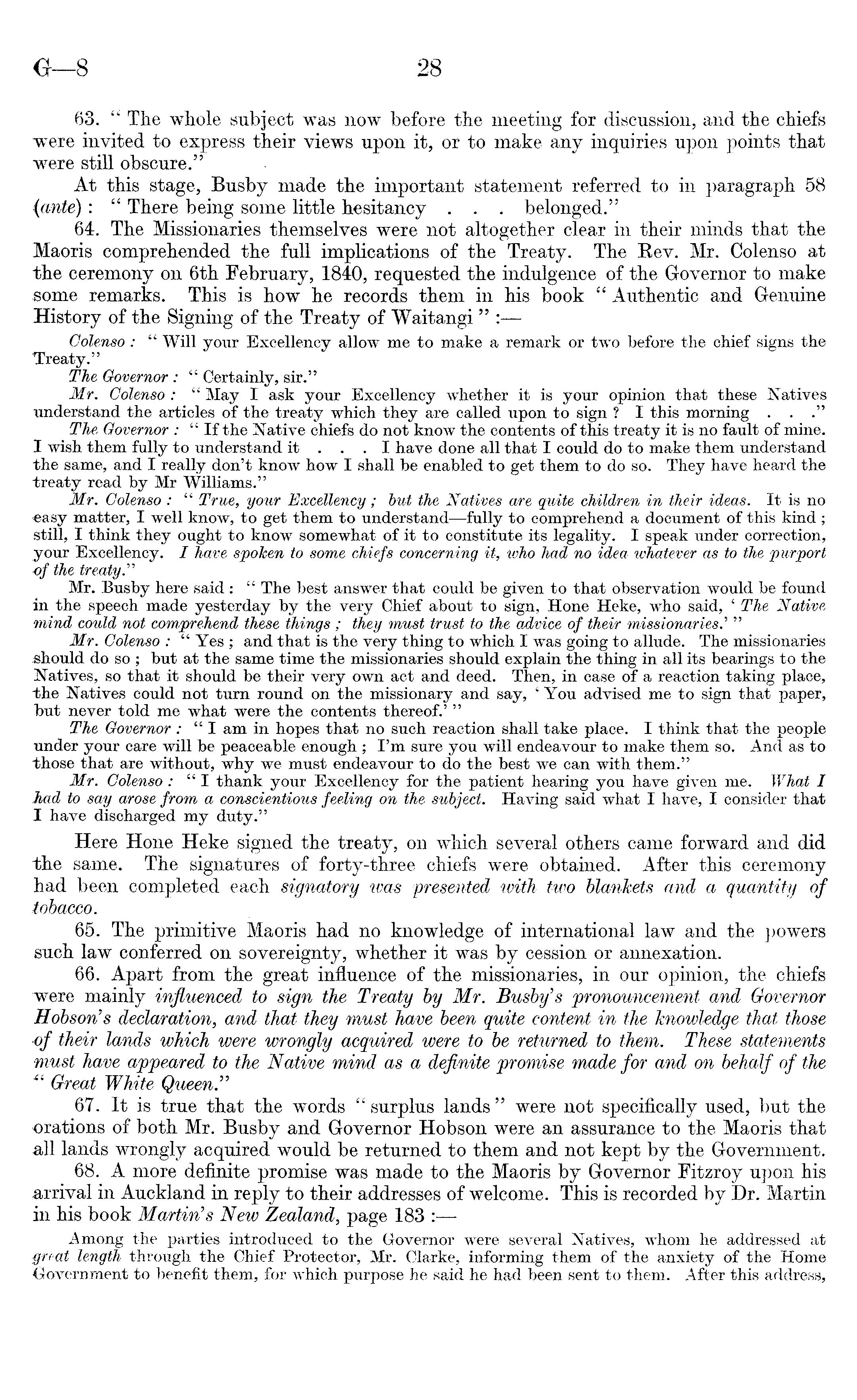 63. " The whole subject was now before the meeting for discussion, and the chiefs were invited to express their views upon it, or to make any inquiries upon points that were still obscure." At this stage, Busby made the important statement referred to in paragraph 58 {ante): " There being some little hesitancy . . . belonged." 64. The Missionaries themselves were not altogether clear in their minds that the Maoris comprehended the full implications of the Treaty. The Rev. Mr. Colenso at the ceremony on 6th February, 1840, requested the indulgence of the Governor to make some remarks. This is how he records them in his book " Authentic and Genuine History of the Signing of the Treaty of Waitangi " : Colenso : " Will your Excellency allow me to make a remark or two before the chief signs the Treaty." The Governor : " Certainly, sir." Mr. Colenso : " May I ask your Excellency whether it is your opinion that these Natives understand the articles of the treaty which they are called upon to sign ? I this morning . . ." The Governor : "If the Native chiefs do not know the contents of this treaty it is no fault of mine. I wish them fully to understand it ... I have done all that I could do to make them understand the same, and I really don't know how I shall be enabled to get them to do so. They have heard the treaty read by Mr Williams." Mr. Colensp : " True, your Excellency ; but the Natives are quite children in their ideas. It is no easy matter, I well know, to get them to understand—fully to comprehend a document of this kind ; still, I think they ought to know somewhat of it to constitute its legality. I speak under correction, your Excellency. I have spoken to some chiefs concerning it, who had no idea whatever as to the purport of the treaty." Mr. Busby here said : " The best answer that could be given to that observation would be found in the speech made yesterday by the very Chief about to sign, Hone Heke, who said, ' The Native mind could not comprehend these things ; they must trust to the advice of their missionaries.' " Mr. Colenso : " Yes ; and that is the very thing to which I was going to allude. The missionaries should do so ; but at the same time the missionaries should explain the thing in all its bearings to the Natives, so that it should be their very own act and deed. Then, in case of a reaction taking place, the Natives could not turn round on the missionary and say, ' You advised me to sign that paper, but never told me what were the contents thereof.' " The Governor : "I am in hopes that no such reaction shall take place. I think that the people under your care will be peaceable enough ; I'm sure you will endeavour to make them so. And as to those that are without, why we must endeavour to do the best we can with them." Mr. Colenso : "I thank your Excellency for the patient hearing you have given me. What I had to say arose from a conscientious feeling on the subject. Having said what I have, I consider that I have discharged my duty." Here Hone Heke signed the treaty, on which several others came forward and did the same. The signatures of forty-three chiefs were obtained. After this ceremony had been completed each signatory was -presented with two blankets and a quantity of tobacco. 65. The primitive Maoris had no knowledge of international law and the powers such law conferred on sovereignty, whether it was by cession or annexation. 66. Apart from the great influence of the missionaries, in our opinion, the chiefs were mainly influenced to sign the Treaty by Mr. Busby's pronouncement and Governor Hobson's declaration, and that they must have been quite content in the knowledge that those of their lands which were wrongly acquired were to be returned to them. These statements must have appeared to the Native mind as a definite promise made for and on behalf of the " Great White Queen." 67. It is true that the words "surplus lands" were not specifically used, but the orations of both Mr. Busby and Governor Hobson were an assurance to the Maoris that all lands wrongly acquired would be returned to them and not kept by the Government. 68. A more definite promise was made to the Maoris by Governor Fitzroy upon his arrival in Auckland in reply to their addresses of welcome. This is recorded by Dr. Martin in his book Martin's New Zealand, page 183 : Among the parties introduced to the Governor were several Natives, whom he addressed at great length through the Chief Protector, Mr. Clarke, informing them of the anxiety of the Home Government to benefit them, for which purpose he said he had been sent to them. After this address,