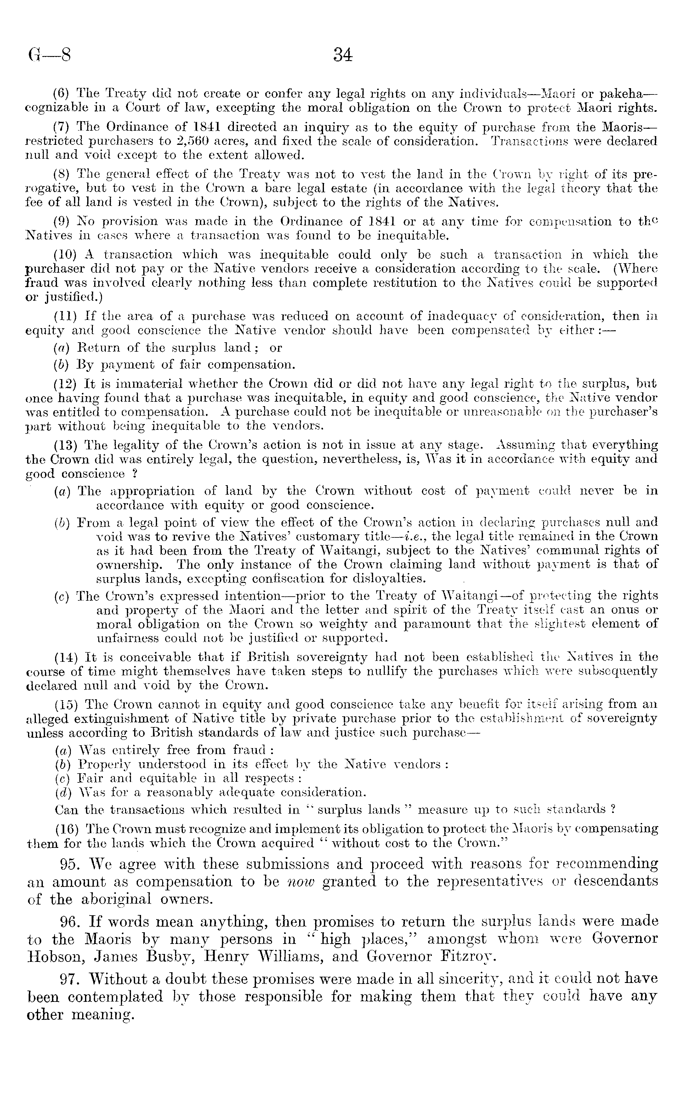 (6) The Treaty did not create or confer any legal rights on any individuals—Maori or pakeha—cognizable in a Court of law, excepting the moral obligation on the Crown to protect Maori rights. (7) The Ordinance of 1841 directed an inquiry as to the equity of purchase from the Maoris—restricted purchasers to 2,560 acres, and fixed the scale of consideration. Transactions were declared null and void except to the extent allowed. (8) The general effect of the Treaty was not to vest the land in the Crown by right of its prerogative, but to vest in the Crown a bare legal estate (in accordance with the legal theory that the fee of all land is vested in the Crown), subject to the rights of the Natives. (9) No provision was made in the Ordinance of 1841 or at any time for compensation to the Natives in cases where a transaction was found to be inequitable. (10) A transaction which was inequitable could only be such a transaction in which the purchaser did not pay or the Native vendors receive a consideration according to the scale. (Where fraud was involved clearly nothing less than complete restitution to the Natives could be supported or justified.) (11) If the area of a purchase was reduced on account of inadequacy of consideration, then in equity and good conscience the Native vendor should have been compensated by either: — (а) Return of the surplus land : or (б) By payment of fair compensation. (12) It is immaterial whether the Crown did or did not have any legal right to the surplus, but once having found that a purchase was inequitable, in equity and good conscience, the Native vendor was entitled to compensation. A purchase could not be inequitable or unreasonable on the purchaser's part without being inequitable to the vendors. (13) The legality of the Crown's action is not in issue at any stage. Assuming that everything the Crown did was entirely legal, the question, nevertheless, is, Was it in accordance with equity and good conscience ? (a) The appropriation of land by the Crown without cost of payment could never be in accordance with equity or good conscience. (b) From a legal point of view the effect of the Crown's action in declaring purchases null and void was to revive the Natives' customary title—i.e., the legal title remained in the Crown as it had been from the Treaty of Waitangi, subject to the Natives' communal rights of ownership. The only instance of the Crown claiming land without payment is that of surplus lands, excepting confiscation for disloyalties. (c) The Crown's expressed intention—prior to the Treaty of Waitangi—of protecting the rights and property of the Maori and the letter and spirit of the Treaty itself cast an onus or moral obligation on the Crown so weighty and paramount that the slightest element of unfairness could not be justified or supported. (14) It is conceivable that if British sovereignty had not been established the Natives in the course of time might themselves have taken steps to nullify the purchases which were subsequently declared null and void by the Crown. (15) The Crown cannot in equity and good conscience take any benefit for itself arising from an alleged extinguishment of Native title by private purchase prior to the establishment of sovereignty unless according to British standards of law and justice such purchase — (a) Was entirely free from fraud : (b) Properly understood in its effect by the Native vendors : (c) Fair and equitable in all respects : (d) Was for a reasonably adequate consideration. Can the transactions which resulted in " surplus lands " measure up to such standards ? (16) The Crown must recognize and implement its obligation to protect the Maoris by compensating them for the lands which the Crown acquired " without cost to the Crown." 95. We agree with these submissions and proceed with reasons for recommending an amount as compensation to be now granted to the representatives or descendants of the aboriginal owners. 96. If words mean anything, then promises to return the surplus lands were made to the Maoris by many persons in " high places," amongst whom were Governor Hobson, James Busby, Henry Williams, and Governor Fitzroy. 97. Without a doubt these promises were made in all sincerity, and it could not have been contemplated by those responsible for making them that they could have any other meaning.