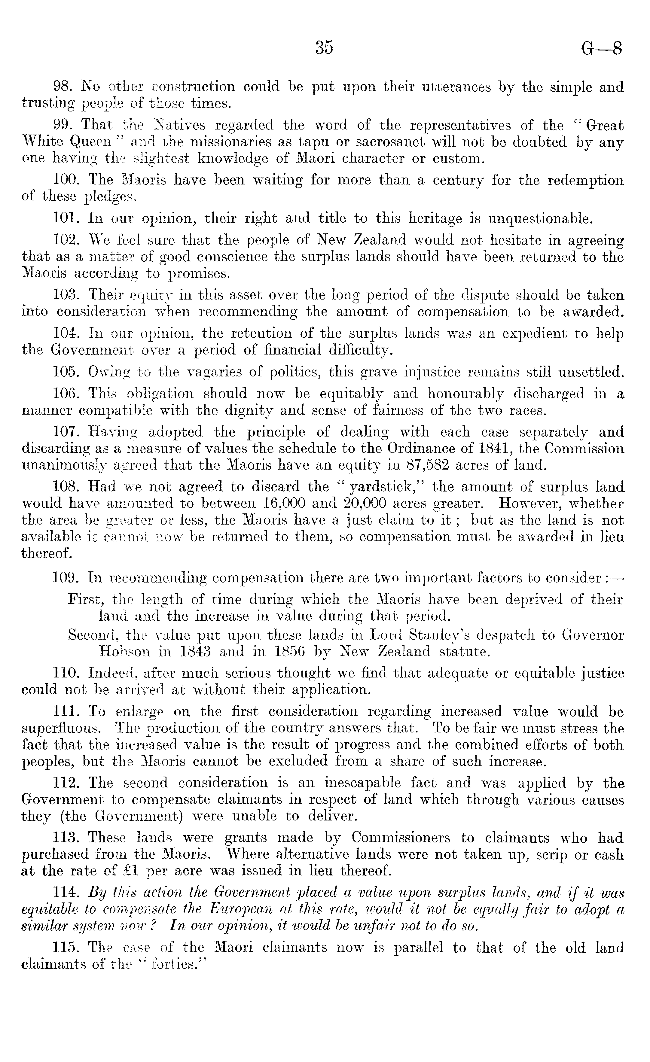 98. No other construction could be put upon their utterances by the simple and trusting people of those times. 99. That the Natives regarded the word of the representatives of the " Great White Queen " and the missionaries as tapu or sacrosanct will not be doubted by any one having the slightest knowledge of Maori character or custom. 100. The Maoris have been waiting for more than a century for the redemption of these pledges. 101. In our opinion, their right and title to this heritage is unquestionable. 102. We feel sure that the people of New Zealand would not hesitate in agreeing that as a matter of good conscience the surplus lands should have been returned to the Maoris according to promises. 103. Their equity in this asset over the long period of the dispute should be taken into consideration when recommending the amount of compensation to be awarded. 104. In our opinion, the retention of the surplus lands was an expedient to help the Government over a period of financial difficulty. 105. Owing to the vagaries of politics, this grave injustice remains still unsettled. 106. This obligation should now be equitably and honourably discharged in a manner compatible with the dignity and sense of fairness of the two races. 107. Having adopted the principle of dealing with each case separately and discarding as a measure of values the schedule to the Ordinance of 1841, the Com mission unanimously agreed that the Maoris have an equity in 87,582 acres of land. 108. Had we not agreed to discard the "yardstick," the amount of surplus land would have amounted to between 16,000 and 20,000 acres greater. However, whether the area be greater or less, the Maoris have a just claim to it; but as the land is not available it cannot now be returned to them, so compensation must be awarded in lieu thereof. 109. In recommending compensation there are two important factors to consider:— First, the length of time during which the Maoris have been deprived of their land and the increase in value during that period. Second, the value put upon these lands in Lord Stanley's despatch to Governor Hobson in 1843 and in 1856 by New Zealand statute. 110. Indeed, after much serious thought we find that adequate or equitable justice could not be arrived at without their application. 111. To enlarge on the first consideration regarding increased value would be superfluous. The production of the country answers that. To be fair we must stress the fact that the increased value is the result of progress and the combined efforts of both peoples, but the Maoris cannot be excluded from a share of such increase. 112. The second consideration is an inescapable fact and was applied by the Government to compensate claimants in respect of land which through various causes they (the Government) were unable to deliver. 113. These lands were grants made by Commissioners to claimants who had purchased from the Maoris. Where alternative lands were not taken up, scrip or cash at the rate of £1 per acre was issue'd in lieu thereof. 114. By this action the Government placed a value wpon surplus lands, and if it was equitable to compensate the European at this rate, ivould it not be equally fair to adopt a similar system now ? In our opinion, it would be unfair not to do so. 115. The case of the Maori claimants now is parallel to that of the old land claimants of the " forties."