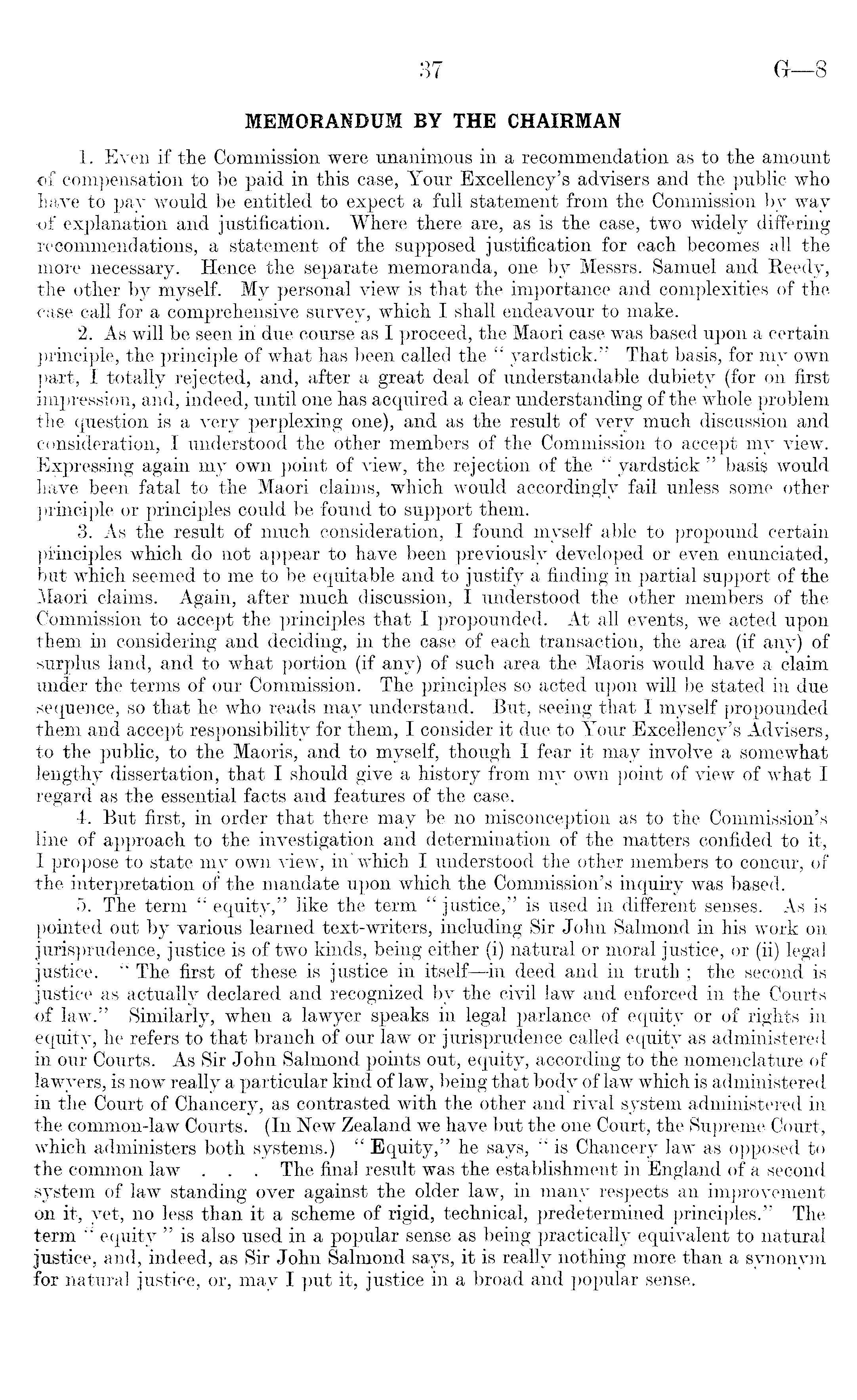 MEMORANDUM BY THE CHAIRMAN 1. Even if the Commission were unanimous in a recommendation as to the amount of compensation to be paid in this case, Your Excellency's advisers and the public who have to pay would be entitled to expect a full statement from the Commission by way •of explanation and justification. Where there are, as is the case, two widely differing recommendations, a statement of the supposed justification for each becomes all the more necessary. Hence the separate memoranda, one by Messrs. Samuel and Keedy, the other by myself. My personal view is that the importance and complexities of the case call for a comprehensive survey, which I shall endeavour to make. 2. As will be seen in due course as I proceed, the Maori case was based upon a certain principle, the principle of what has been called the " yardstick." That basis, for my own part, I totally rejected, and, after a great deal of understandable dubiety (for oil first impression, and, indeed, until one has acquired a clear understanding of the whole problem the question is a very perplexing one), and as the result of very much discussion and consideration, I understood the other members of the Commission to accept my view. Expressing again my own point of view, the rejection of the " yardstick " basis would have been fatal to the Maori claims, which would accordingly fail unless some other principle or principles could be found to support them. 3. As the result of much consideration, I found myself able to propound certain principles which do not appear to have been previously developed or even enunciated, but which seemed to me to be equitable and to justify a finding in partial support of the Maori claims. Again, after much discussion, I understood the other members of the Commission to accept the principles that I propounded. At all events, we acted upon them in considering and deciding, in the case of each transaction, the area (if any) of surplus land, and to what portion (if any) of such area the Maoris would have a claim under the terms of our Commission. The principles so acted upon will be stated in due sequence, so that he who reads may understand. But, seeing that I myself propounded them and accept responsibility for them, I consider it due to Your Excellency's Advisers, to the public, to the Maoris, and to myself, though I fear it may involve a somewhat lengthy dissertation, that I should give a history from my own point of view of what I regard as the essential facts and features of the case. 4. But first, in order that there may be no misconception as to the Commission's line of approach to the investigation and determination of the matters confided to it, I propose to state my own view, in'which I understood the other members to concur, of the interpretation of the mandate upon which the Commission's inquiry was based. 5. The term " equity," like the term " justice," is used in different senses. As is pointed out by various learned text-writers, including Sir John Salmond in his work on jurisprudence, justice is of two kinds, being either (i) natural or moral justice, or (ii) legal justice. " The first of these is justice in itself —in deed and in truth; the second is justice as actually declared and recognized by the civil law and enforced in the Courts of law." Similarly, when a lawyer speaks in legal parlance of equity or of rights in equity, he refers to that branch of our law or jurisprudence called equity as administered in our Courts. As Sir John Salmond points out, equity, according to the nomenclature of lawyers, is now really a particular kind of law, being that body of law which is administered in the Court of Chancery, as contrasted with the other and rival system administered in the common-law Courts. (In New Zealand we have but the one Court, the Supreme Court, which administers both systems.) " Equity," he says, "is Chancery law as opposed to the common law . . . The final result was the establishment in England of a second system of law standing over against the older law, in many respects an improvement on it, vet, no less than it a scheme of rigid, technical, predetermined principles." The term " equity " is also used in a popular sense as being practically equivalent to natural justice, and, indeed, as Sir John Salmond says, it is really nothing more than a synonym for natural justice, or, may I put it, justice in a broad and popular sense.