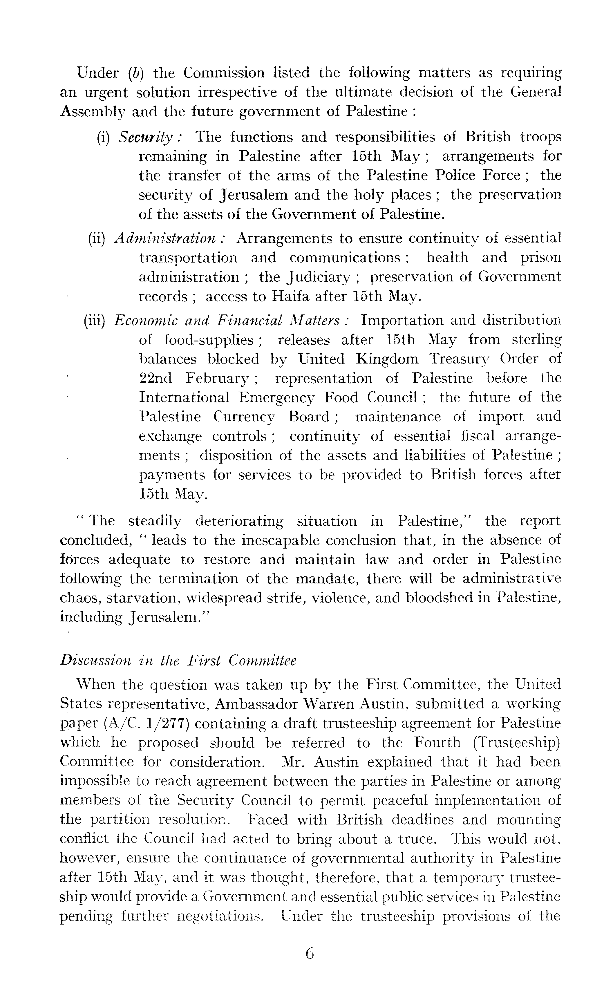 Under (b) the Commission listed the following matters as requiring an urgent solution irrespective of the ultimate decision of the General Assembly and the future government of Palestine : (i) Security: The functions and responsibilities of British troops remaining in Palestine after 15th May ; arrangements for the transfer of the arms of the Palestine Police Force ; the security of Jerusalem and the holy places; the preservation of the assets of the Government of Palestine. (ii) Administration : Arrangements to ensure continuity of essential transportation and communications; health and prison administration ; the Judiciary ; preservation of Government records ; access to Haifa after 15th May. (iii) Economic and Financial Matters : Importation and distribution of food-supplies; releases after 15th May from sterling balances blocked by United Kingdom Treasury Order of 22nd February; representation of Palestine before the International Emergency Food Council; the future of the Palestine Currency Board; maintenance of import and exchange controls ; continuity of essential fiscal arrangements ; disposition of the assets and liabilities of Palestine ; payments for services to be provided to British forces after 15th May. " The steadily deteriorating situation in Palestine," the report concluded, " leads to the inescapable conclusion that, in the absence of forces adequate to restore and maintain law and order in Palestine following the termination of the mandate, there will be administrative chaos, starvation, widespread strife, violence, and bloodshed in Palestine, including Jerusalem." Discussion in the First Committee When the question was taken up by the First Committee, the United States representative, Ambassador Warren Austin, submitted a working paper (A/C. 1/277) containing a draft trusteeship agreement for Palestine which he proposed should be referred to the Fourth (Trusteeship) Committee for consideration. Mr. Austin explained that it had been impossible to reach agreement between the parties in Palestine or among members of the Security Council to permit peaceful implementation of the partition resolution. Faced with British deadlines and mounting conflict the Council had acted to bring about a truce. This would not, however, ensure the continuance of governmental authority in Palestine after 15th May, and it was thought, therefore, that a temporary trusteeship would provide a Government and essential public services in Palestine pending further negotiations. Under the trusteeship provisions of the