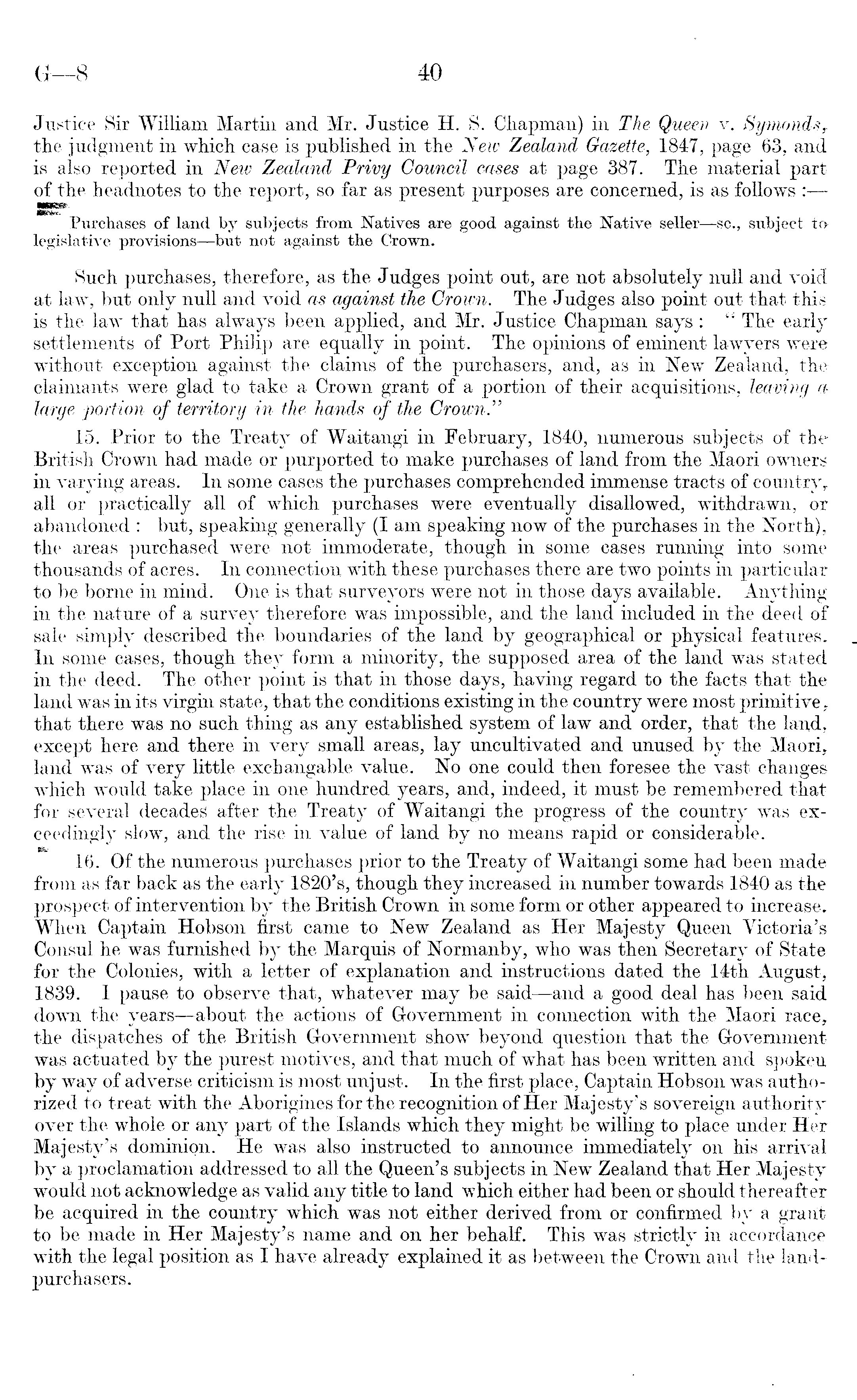 Justice Sir William Martin and Mr. Justice H. S. Chapman) in The Queen v. Symonds T the judgment in which case is published in the New Zealand Gazette, 1847, page 63, and is also reported in New Zealand Privy Council cases at page 387. The material part of the headnotes to the report, so far as present purposes are concerned, is as follows : Purchases of land by subjects from Natives are good against the Native seller—sc., subject to legislative provisions—but not against the Crown. Such purchases, therefore, as the Judges point out, are not absolutely null and void at law, but only null and void as against the Grown. The Judges also point out that this is the law that has always been applied, and Mr. Justice Chapman says: " The early settlements of Port Philip are equally in point. The opinions of eminent lawyers were without exception against the claims of the purchasers, and, as in New Zealand, the claimants were glad to take a Crown grant of a portion of their acquisitions, leaving a large portion of territory in the hands of the Crown." 15. Prior to the Treaty of Waitangi in February, 1840, numerous subjects of the British Crown had made or purported to make purchases of land from the Maori owners in varying areas. In some cases the purchases comprehended immense tracts of country, all or practically all of which purchases were eventually disallowed, withdrawn, or abandoned : but, speaking generally (I am speaking now of the purchases in the North), the areas purchased were not immoderate, though in some cases running into some thousands of acres. In connection with these purchases there are two points in particular to be borne in mind. One is that surveyors were not in those days available. Anything in the nature of a survey therefore was impossible, and the land included in the deed of sale simply described the boundaries of the land by geographical or physical features. In some cases, though they form a minority, the supposed area of the land was stated in the deed. The other point is that in those days, having regard to the facts that the land was in its virgin state, that the conditions existing in the country were most primitive, that there was no such thing as any established system of law and order, that the land, except here and there in very small areas, lay uncultivated and unused by the Maori, land was of very little exchangable value. No one could then foresee the vast changes which would take place in one hundred years, and, indeed, it must be remembered that for several decades after the Treaty of Waitangi the progress of the country was exceedingly slow, and the rise in value of land by no means rapid or considerable. 16. Of the numerous purchases prior to the Treaty of Waitangi some had been made from as far back as the early 1820's, though they increased in number towards 1840 as the prospect of intervention by the British Crown in some form or other appeared to increase* When Captain Hobson first came to New Zealand as Her Majesty Queen Yictoria's Consul he was furnished by the Marquis of Normanby, who was then Secretary of State for the Colonies, with a letter of explanation and instructions dated the 14th August, 1839. I pause to observe that, whatever may be said —and a good deal has been said down the years —about the actions of Government in connection with the Maori race, the dispatches of the British Government show beyond question that the Government was actuated by the purest motives, and that much of what has been written and spoken by way of adverse criticism is most unjust. In the first place, Captain Hobson was authorized to treat with the Aborigines for the recognition of Her Majesty's sovereign authority over the whole or any part of the Islands which they might be willing to place under Her Majesty's dominion. He was also instructed to announce immediately on his arrival by a proclamation addressed to all the Queen's subjects in New Zealand that Her Majesty would not acknowledge as valid any title to land which either had been or should thereafter be acquired in the country which was not either derived from or confirmed by a grant to be made in Her Majesty's name and on her behalf. This was strictly in accordance with the legal position as I have already explained it as between the Crown and the landpurchasers.