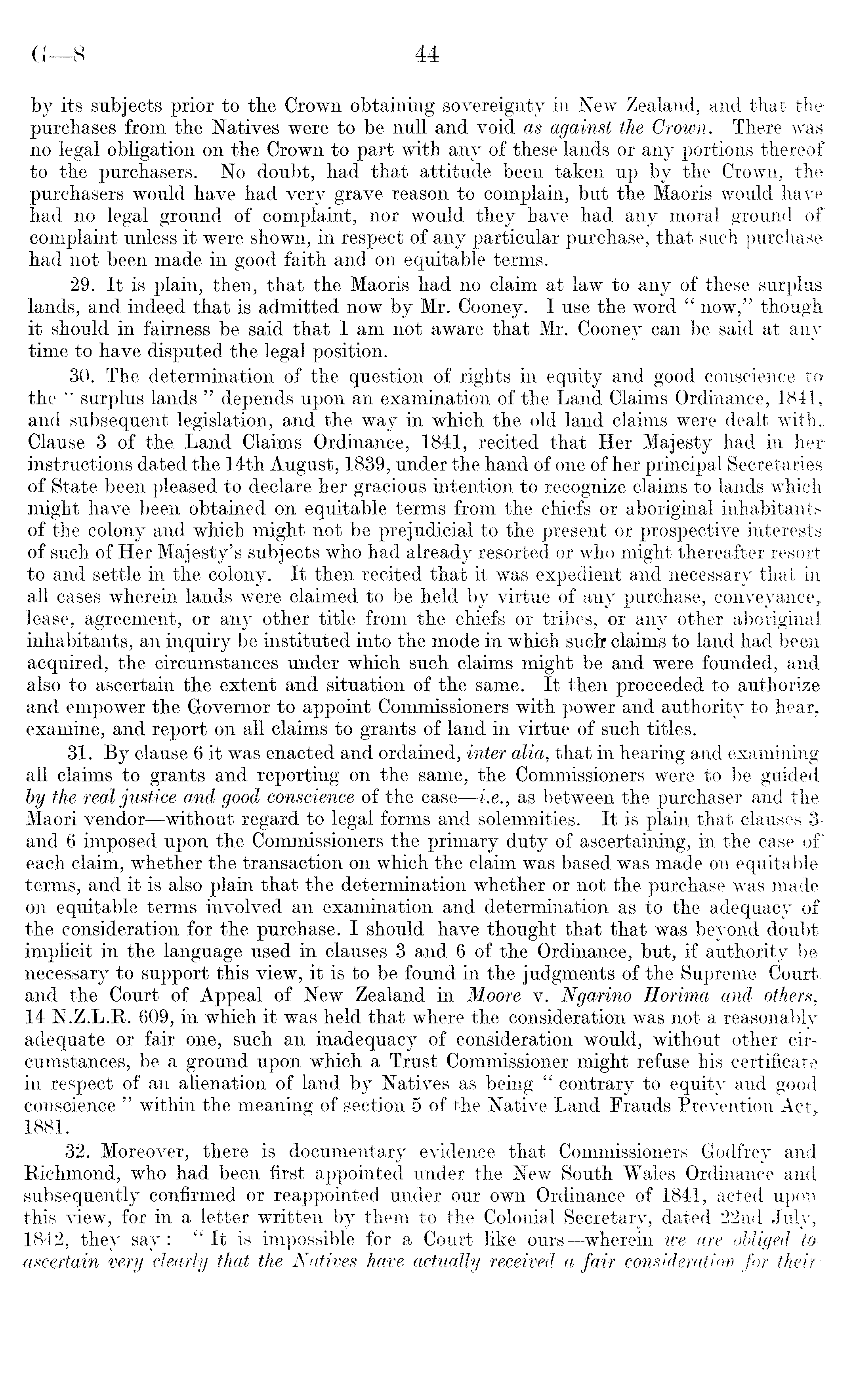 by its subjects prior to the Crown obtaining sovereignty in New Zealand, and that the purchases from the Natives were to be null and void as against the Crown. There was. no legal obligation on the Crown to part with any of these lands or any portions thereof to the purchasers. No doubt, had that attitude been taken up by the Crown, the purchasers would have had very grave reason to complain, but the Maoris would have had no legal ground of complaint, nor would they have had any moral ground of complaint unless it were shown, in respect of any particular purchase, that such purchase had not been made in good faith and on equitable terms. 29. It is plain, then, that the Maoris had no claim at law to any of these surplus lands, and indeed that is admitted now by Mr. Cooney. I use the word " now," though it should in fairness be said that I am not aware that Mr. Cooney can be said at any time to have disputed the legal position. 30. The determination of the question of rights in equity and good conscience to the " surplus lands " depends upon an examination of the Land Claims Ordinance, 1841, and subsequent legislation, and the way in which the old land claims were dealt with. Clause 3 of the Land Claims Ordinance, 1841, recited that Her Majesty had in her instructions dated the 14th August, 1839, under the hand of one of her principal Secretaries of State been pleased to declare her gracious intention to recognize claims to lands which might have been obtained on equitable terms from the chiefs or aboriginal inhabitants of the colony and which might not be prejudicial to the present or prospective interests of such of Her Majesty's subjects who had already resorted or who might thereafter resort to and settle in the colony. It then recited that it was expedient and necessary that in all cases wherein lands were claimed to be held by virtue of any purchase, conveyance,, lease, agreement, or any other title from the chiefs or tribes, or any other aboriginal inhabitants, an inquiry be instituted into the mode in which such claims to land had been acquired, the circumstances under which such claims might be and were founded, and also to ascertain the extent and situation of the same. It then proceeded to authorize and empower the Governor to appoint Commissioners with power and authority to hear, examine, and report on all claims to grants of land in virtue of such titles. 31. By clause 6it was enacted and ordained, inter alia, that in hearing and examining all claims to grants and reporting on the same, the Commissioners were to be guided by the real justice and good conscience of the case —i.e., as between the purchaser and the Maori vendor —without regard to legal forms and solemnities. It is plain that clauses 3and 6 imposed upon the Commissioners the primary duty of ascertaining, in the case of each claim, whether the transaction on which the claim was based was made on equitable terms, and it is also plain that the determination whether or not the purchase was made on equitable terms involved an examination and determination as to the adequacy of the consideration for the purchase. I should have thought that that was beyond doubt implicit in the language used in clauses 3 and 6 of the Ordinance, but, if authority be necessary to support this view, it is to be found in the judgments of the Supreme Court, and the Court of Appeal of New Zealand in Moore v. Ngarino Horima and others, 14 N.Z.L.R. 609, in which it was held that where the consideration was not a reasonably adequate or fair one, such an inadequacy of consideration would, without other circumstances, be a ground upon which a Trust Commissioner might refuse his certificate in respect of an alienation of land by Natives as being " contrary to equity and good conscience " within the meaning of section 5 of the Native Land Frauds Prevention Act, 1881. 32. Moreover, there is documentary evidence that Commissioners Godfrey and Richmond, who had been first appointed under the New South Wales Ordinance and subsequently confirmed or reappointed under our own Ordinance of 1841, acted upon this view, for in a letter written by them to the Colonial Secretary, dated 22nd July, 1842, they say : "It is impossible for a Court like ours —wherein we are obliged toascertain very clearly that the Natives have actually received a fair consideration for their-