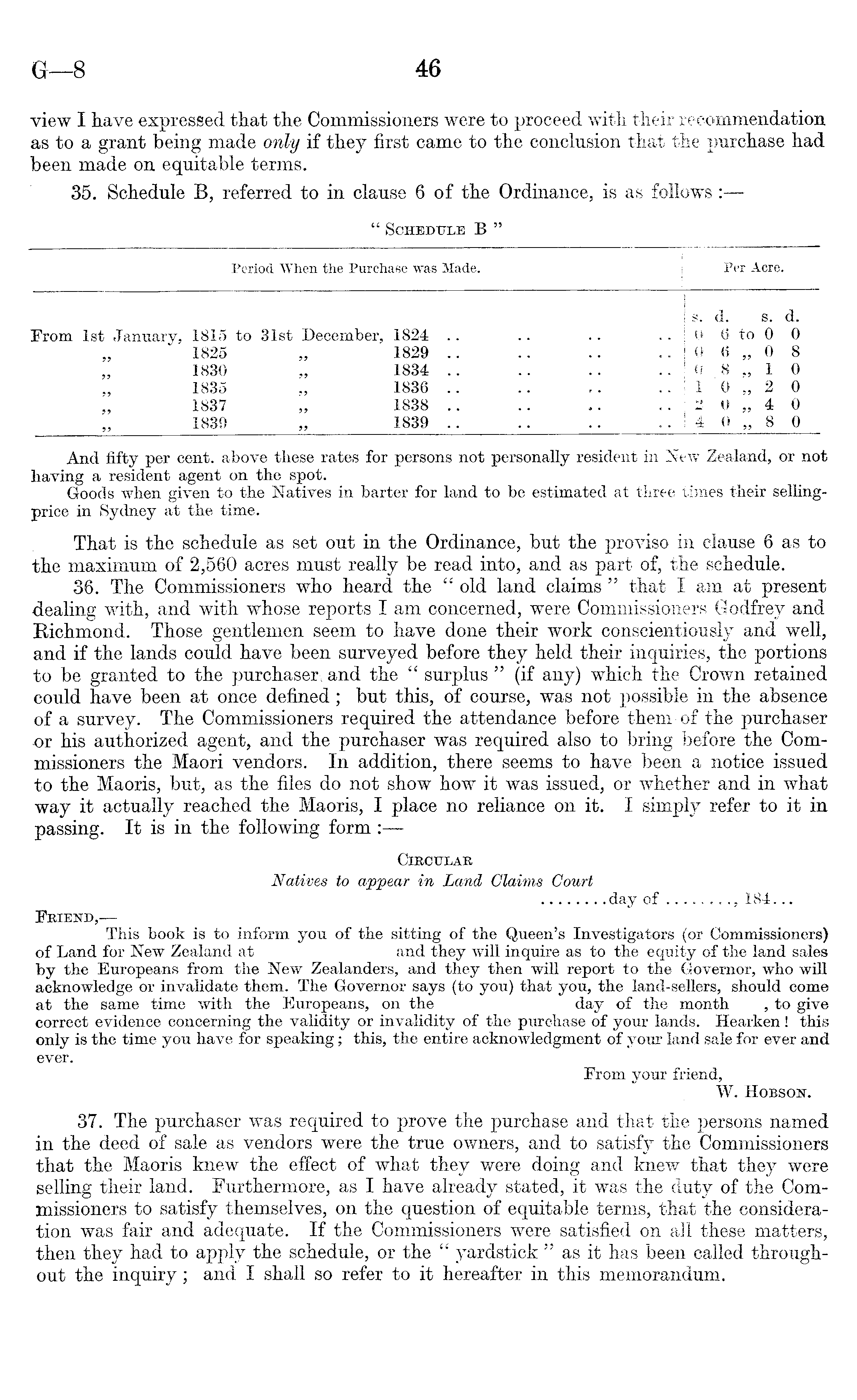 And fifty per cent, above these rates for persons not personally resident in New Zealand, or not having a resident agent on the spot. Goods when given to the Natives in barter for land to be estimated at three times their sellingprice in Sydney at the time. That is the schedule as set out in the Ordinance, but the proviso in clause 6 as to the maximum of 2,560 acres must really be read into, and as part of, the schedule. 36. The Commissioners who heard the " old land claims " that I am at present dealing with, and with whose reports I am concerned, were Commissioners Godfrey and Richmond. Those gentlemen seem to have done their work conscientiously and well, and if the lands could have been surveyed before they held their inquiries, the portions to be granted to the purchaser > and the " surplus " (if any) which the Crown retained could have been at once defined; but this, of course, was not possible in the absence of a survey. The Commissioners required the attendance before them of the purchaser •or his authorized agent, and the purchaser was required also to bring before the Commissioners the Maori vendors. In addition, there seems to have been a notice issued to the Maoris, but, as the files do not show how it was issued, or whether and in what way it actually reached the Maoris, I place no reliance on it. I simply refer to it in passing. It is in the following form : Circular Natives to appear in Land Claims Court day of , 184... Friend, — This book is to inform you of the sitting of the Queen's Investigators (or Commissioners) of Land for New Zealand at and they will inquire as to the equity of the land sales by the Europeans from the New Zealanders, and they then will report to the Governor, who will acknowledge or invalidate them. The Governor says (to you) that you, the land-sellers, should come at the same time with the Europeans, on the day of the month , to give correct evidence concerning the validity or invalidity of the purchase of your lands. Hearken! this only is the time you have for speaking; this, the entire acknowledgment of your land sale for ever and ever. From your friend, W. Hobson. 37. The purchaser was required to prove the purchase and that the persons named in the deed of sale as vendors were the true owners, and to satisfy the Commissioners that the Maoris knew the effect of what they were doing and knew that they were selling their land. Furthermore, as I have already stated, it was the duty of the Commissioners to satisfy themselves, on the question of equitable terms, that the consideration was fair and adequate. If the Commissioners were satisfied on all these matters, then they had to apply the schedule, or the " yardstick " as it has been called throughout the inquiry; and I shall so refer to it hereafter in this memorandum'.