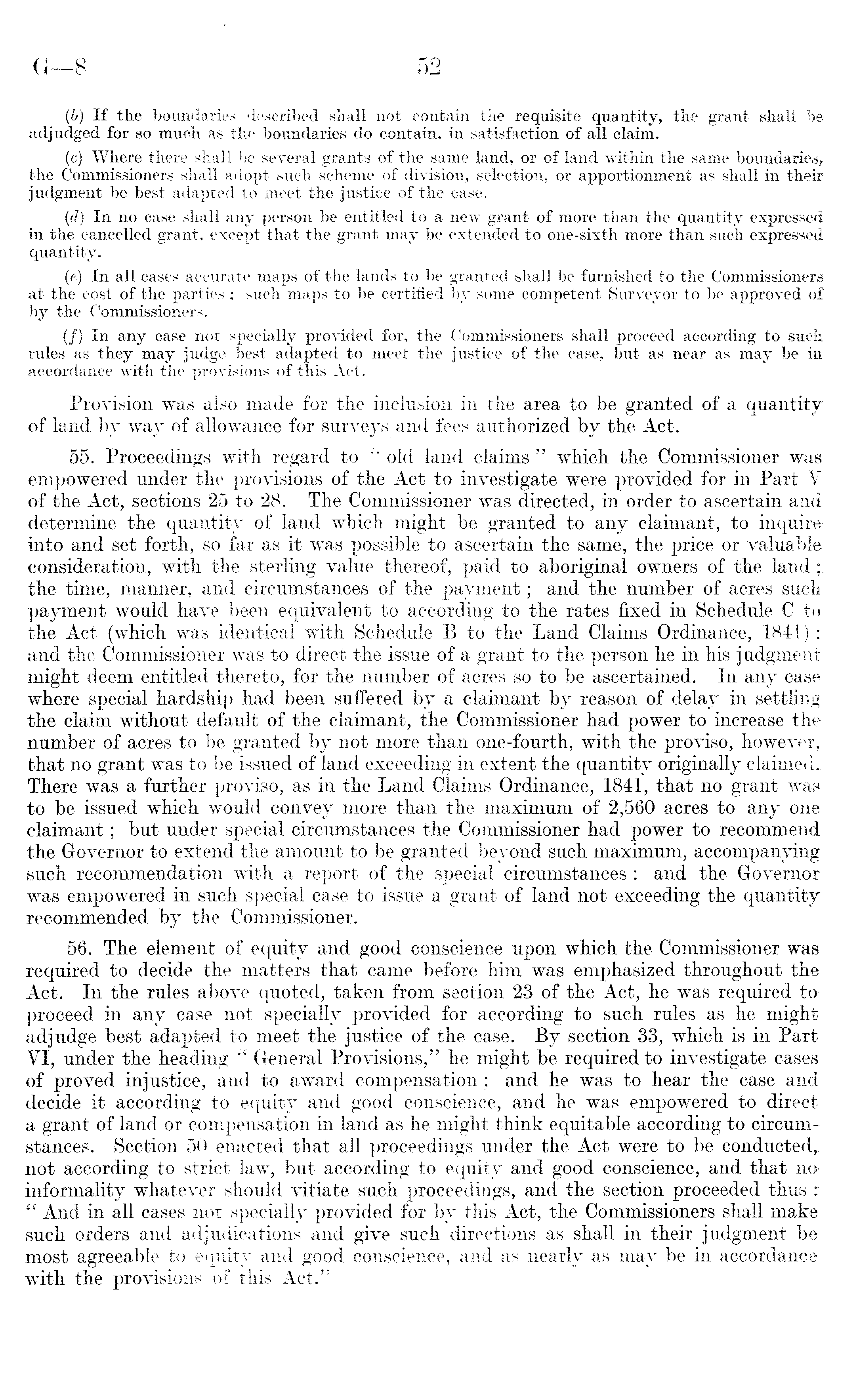 (b) If the boundaries described shall not contain the requisite quantity, the grant shall be adjudged for so much as the boundaries do contain, in satisfaction of all claim. (c) Where there shall be several grants of the same land, or of land within the same the Commissioners shall adopt such scheme of division, selection, or apportionment as shall in their judgment be best adapted to meet the justice of the case. (d) In no case shall any person be entitled to a new grant of more than the quantity expressed in the cancelled grant, except that the grant may be extended to one-sixth more than such expressed quantity. (e) In all cases accurate maps of the lands to be granted shall be furnished to the Commissioners at the cost of the parties ; such maps to bp certified by some competent Surveyor to be approved of by the Commissioners. (/} In any case not specially provided for, the Commissioners shall proceed according to such rules as they may judge best adapted to meet the justice of the case, but as near as may be in. accordance with the provisions of this Act. Provision was also made for the inclusion in the area to be granted of a quantity of land by wav of allowance for surveys and fees authorized by the Act. 55. Proceedings with regard to " old land claims " which the Commissioner was empowered under the provisions of the Act to investigate were provided for in Part V of the Act, sections 25 to 28. The Commissioner was directed, in order to ascertain and determine the quantity of land which might be granted to any claimant, to inquire into and set forth, so far as it was possible to ascertain the same, the price or valuable consideration, with the sterling value thereof, paid to aboriginal owners of the land the time, manner, and circumstances of the payment; and the number of acres such payment would have been equivalent to according to the rates fixed in Schedule C tothe Act (which was identical with Schedule B to the Land Claims Ordinance, 1841) and the Commissioner was to direct the issue of a grant to the person he in his judgment might deem entitled thereto, for the number of acres so to be ascertained. In any case where special hardship had been suffered by a claimant by reason of delay in settling the claim without default of the claimant, the Commissioner had power to increase the number of acres to be granted by not more than one-fourth, with the proviso, however, that no grant was to be issued of land exceeding in extent the quantity originally claimed.. There was a further proviso, as in the Land Claims Ordinance, 1841, that no grant was to be issued which would convey more than the maximum of 2,560 acres to any one claimant; but under special circumstances the Commissioner had power to recommend the Governor to extend the amount to be granted beyond such maximum, accompanying such recommendation with a report of the special circumstances : and the Governor was empowered in such special case to issue a grant of land not exceeding the quantity recommended by the Commissioner. 56. The element of equity and good conscience upon which the Commissioner was required to decide the matters that came before him was emphasized throughout the Act. In the rules above quoted, taken from section 23 of the Act, he was required to proceed in any case not specially provided for according to such rules as he might adjudge best adapted to meet the justice of the case. By section 33, which is in Part VI, under the heading " General Provisions," he might be required to investigate cases of proved injustice, and to award compensation; and he was to hear the case and decide it according to equity and good conscience, and he was empowered to direct a grant of land or compensation in land as he might think equitable according to circumstances. Section 50 enacted that all proceedings under the Act were to be conducted, not according to strict law, but according to equity and good conscience, and that no informality whatever should vitiate such proceedings, and the section proceeded thus : " And in all cases not specially provided for by this Act, the Commissioners shall make such orders and adjudications and give such directions as shall in their judgment be most agreeable to equity and good conscience, and as nearly as may be in accordance with the provisions of this Act."
