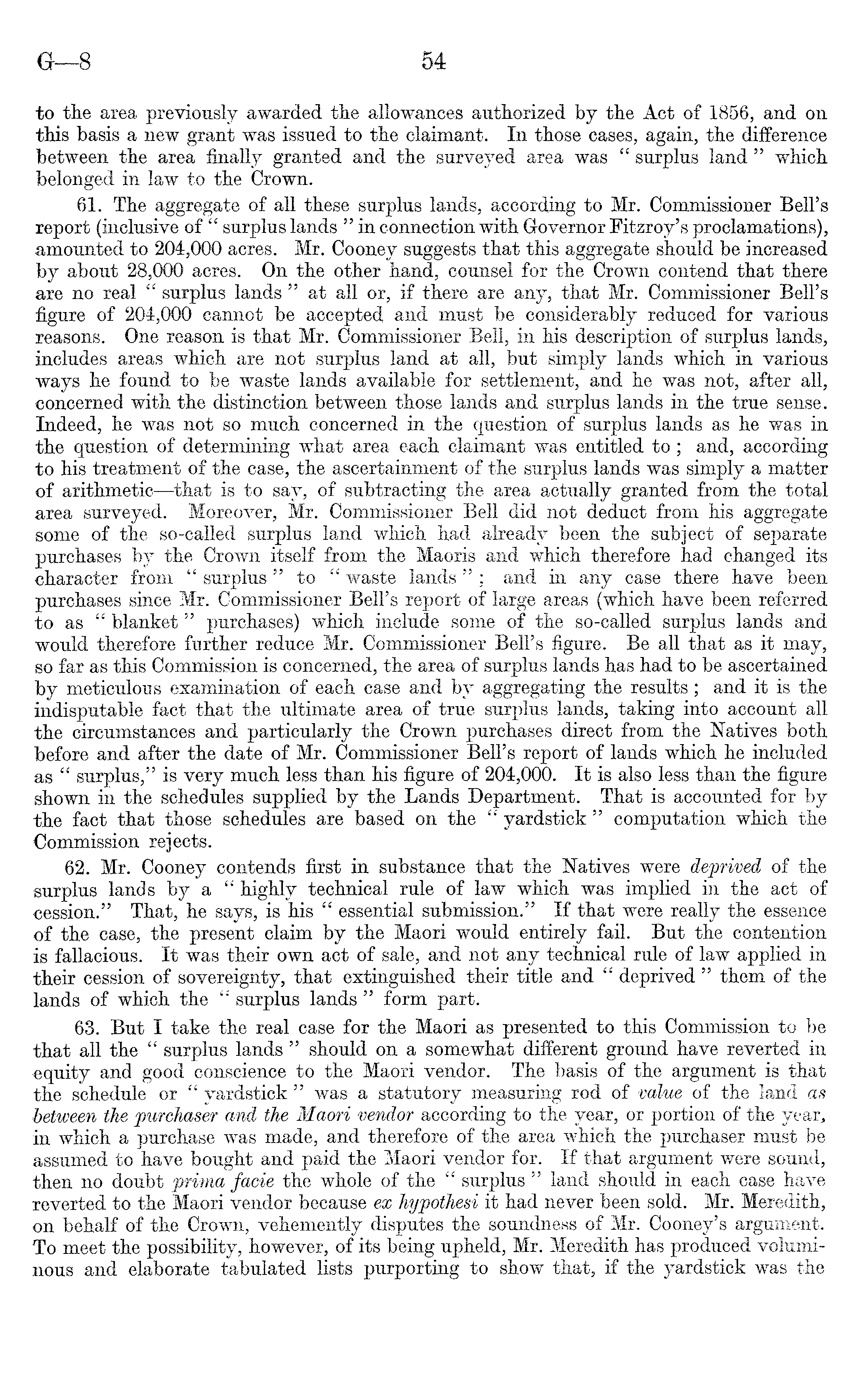to the area previously awarded the allowances authorized by the Act of 1856, and on this basis a new grant was issued to the claimant. In those cases, again, the difference between the area finally granted and the surveyed area was " surplus land " which belonged in law to the Crown. 61. The aggregate of all these surplus lands, according to Mr. Commissioner Bell's report (inclusive of " surplus lands " in connection with Governor Fitzroy's proclamations), amounted to 204,000 acres. Mr. Cooney suggests that this aggregate should be increased by about 28,000 acres. On the other hand, counsel for the Crown contend that there are no real " surplus lands " at all or, if there are any, that Mr. Commissioner Bell's figure of 204,000 cannot be accepted and must be considerably reduced for various reasons. One reason is that Mr. Commissioner Bell, in his description of surplus lands, includes areas which are not surplus land at all, but simply lands which in various ways he found to be waste lands available for settlement, and he was not, after all, concerned with the distinction between those lands and surplus lands in the true sense. Indeed, he was not so much concerned in the question of surplus lands as he was in the question of determining what area each claimant was entitled to ; and, according to his treatment of the case, the ascertainment of the surplus lands was simply a matter of arithmetic—that is to say, of subtracting the area actually granted from the total area surveyed. Moreover, Mr. Commissioner Bell did not deduct from his aggregate some of the so-called surplus land which had already been the subject of separate purchases by the Crown itself from the Maoris and which therefore had changed its character from " surplus " to " waste lands" ; and in any case there have been purchases since Mr. Commissioner Bell's report of large areas (which have been referred to as " blanket" purchases) which include some of the so-called surplus lands and would therefore further reduce Mr. Commissioner Bell's figure. Be all that as it may, so far as this Commission is concerned, the area of surplus lands has had to be ascertained by meticulous examination of each case and by aggregating the results; and it is the indisputable fact that the ultimate area of true surplus lands, taking into account all the circumstances and particularly the Crown purchases direct from the Natives both before and after the date of Mr. Commissioner Bell's report of lands which he included as " surplus," is very much less than his figure of 204,000. It is also less than the figure shown in the schedules supplied by the Lands Department. That is accounted for by the fact that those schedules are based on the " yardstick " computation which the Commission rejects. 62. Mr. Cooney contends first in substance that the Natives were deprived of the surplus lands by a " highly technical rule of law which was implied in the act of cession." That, he says, is his " essential submission." If that were really the essence of the case, the present claim by the Maori would entirely fail. But the contention is fallacious. It was their own act of sale, and not any technical rule of law applied in their cession of sovereignty, that extinguished their title and " deprived " them of the lands of which the " surplus lands " form part. 63. But I take the real case for the Maori as presented to this Commission to be that all the " surplus lands " should on a somewhat different ground have reverted in equity and good conscience to the Maori vendor. The basis of the argument is that the schedule or " yardstick " was a statutory measuring rod of value of the land as between the purchaser and the Maori vendor according to the year, or portion of the year,, in which a purchase was made, and therefore of the area which the purchaser must be assumed to have bought and paid the Maori vendor for. If that argument were sound, then no doubt prima facie the whole of the " surplus " land should in each case have reverted to the Maori vendor because ex hypothesi it had never been sold. Mr. Meredith, on behalf of the Crown, vehemently disputes the soundness of Mr. Cooney's argument. To meet the possibility, however, of its being upheld, Mr. Meredith has produced voluminous and elaborate tabulated lists purporting to show that, if the yardstick was the