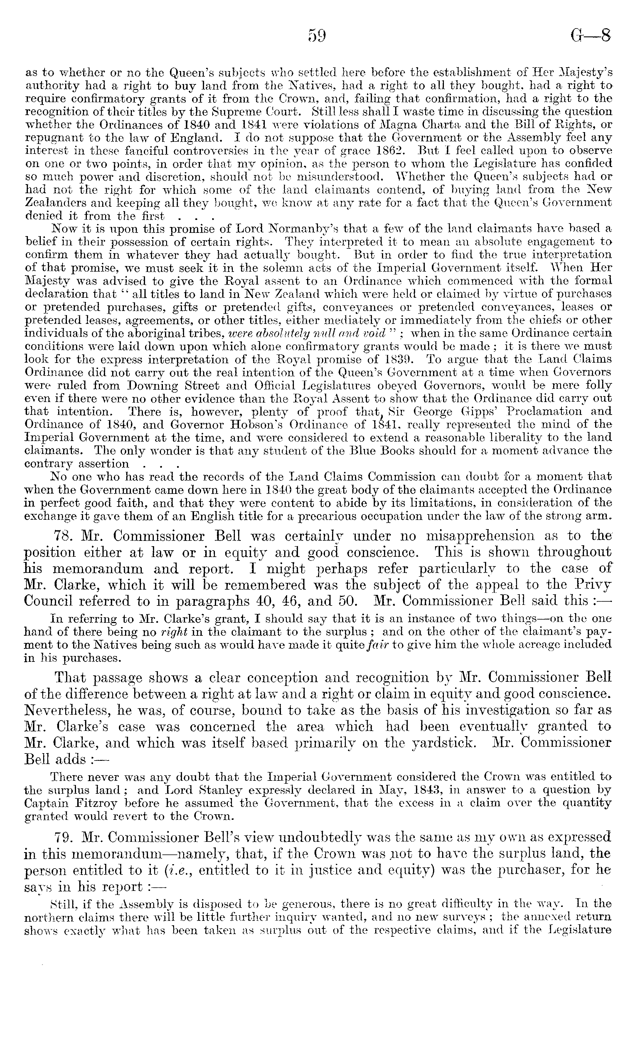 as to whether or no the Queen's subjects who settled here before the establishment of Her Majesty's authority had a right to buy land from the Natives, had a right to all they bought, had a right to require confirmatory grants of it from the Crown, and, failing that confirmation, had a right to the recognition of their titles by the Supreme Court. Still less shall I waste time in discussing the question whether the Ordinances of 1840 and 1841 were violations of Magna Charta and the Bill of Rights, or repugnant to the law of England. Ido not suppose that the Government or the Assembly feel any interest in these fanciful controversies in the year of grace 1862. But I feel called upon to observe on one or two points, in order that my opinion, as the person to whom the Legislature has confided so much power and discretion, should not be misunderstood. Whether the Queen's subjects had or had not t£e right for which some of the land claimants contend, of buying land from the New Zealanders and keeping all they bought, we know at any rate for a fact that the Queen's Government denied it from the first . . . Now it is upon this promise of Lord Normanby's that a few of the land claimants have based a belief in their possession of certain rights. They interpreted it to mean an absolute engagement toconfirm them in whatever they had actually bought. But in order to find the true interpretation of that promise, we must seek it in the solemn acts of the Imperial Government itself. When Her Majesty was advised to give the Royal assent to an Ordinance which commenced with the formal declaration that '' all titles to land in New Zealand which were held or claimed by virtue of purchases or pretended purchases, gifts or pretended gifts, conveyances or pretended conveyances, leases or pretended leases, agreements, or other titles, either mediately or immediately from the chiefs or other individuals of the aboriginal tribes, were absolutely null and void " ; when in the same Ordinance certain conditions were laid down upon which alone confirmatory grants would be made ; it is there we must look for the express interpretation of the Royal promise of 1839. To argue that the Land Claims Ordinance did not. carry out the real intention of the Queen's Government at a time when Governors were ruled from Downing Street and Official Legislatures obeyed Governors, would be mere folly even if there were no other evidence than the Royal Assent to show that the Ordinance did carry out that intention. There is, however, plenty of proof that. Sir George Gipps' Proclamation and Ordinance of 1840, and Governor Hobson's Ordinance of 1841, really represented the mind of the Imperial Government at the time, and were considered to extend a reasonable liberality to the land claimants. The only wonder is that any student of the Blue Books should for a moment advance tho contrary assertion . . . No one who has read the records of the Land Claims Commission can doubt for a moment that when the Government came down here in 1840 the great body of the claimants accepted the Ordinance in perfect good faith, and that they were content to abide by its limitations, in consideration of the exchange it gave them of an English title for a precarious occupation under the law of the strong arm. 78. Mr. Commissioner Bell was certainly under no misapprehension as to the position either at law or in equity and good conscience. This is shown throughout his memorandum and report. I might perhaps refer particularly to the case of Mr. Clarke, which it will be remembered was the subject of the appeal to the Privy Council referred to in paragraphs 40, 46, and 50. Mr. Commissioner Bell said this : In referring to Mr. Clarke's grant, I should say that it is an instance of two things—on the one hand of there being no right in the claimant to the surplus ; and on the other of the claimant's payment to the Natives being such as would have made it quite fair to give him the whole acreage included in his purchases. That passage shows a clear conception and recognition by Mr. Commissioner Bell of the difference between a right at law and a right or claim in equity and good conscience. Nevertheless, he was, of course, bound to take as the basis of his investigation so far as Mr. Clarke's case was concerned the area which had been eventually granted to Mr. Clarke, and which was itself based primarily on the yardstick. Mr. Commissioner Bell adds : There never was any doubt that the Imperial Government considered the Crown was entitled to the surplus land; and Lord Stanley expressly declared in May, 1843, in answer to a question by Captain Fitzroy before he assumed the Government, that the excess in a claim over the quantity granted would revert to the Crown. 79. Mr. Commissioner Bell's view undoubtedly was the same as my own as expressed in this memorandum —namely, that, if the Crown was not to have the surplus land, the person entitled to it (i.e., entitled to it in justice and equity) was the purchaser, for he says in his report:—I Still, if the Assembly is disposed to be generous, there is no great difficulty in the way. In the northern claims there will be little further inquiry wanted, and no new surveys ; the annexed return shows exactly what has been taken as surplus out of the respective claims, and if the Legislature