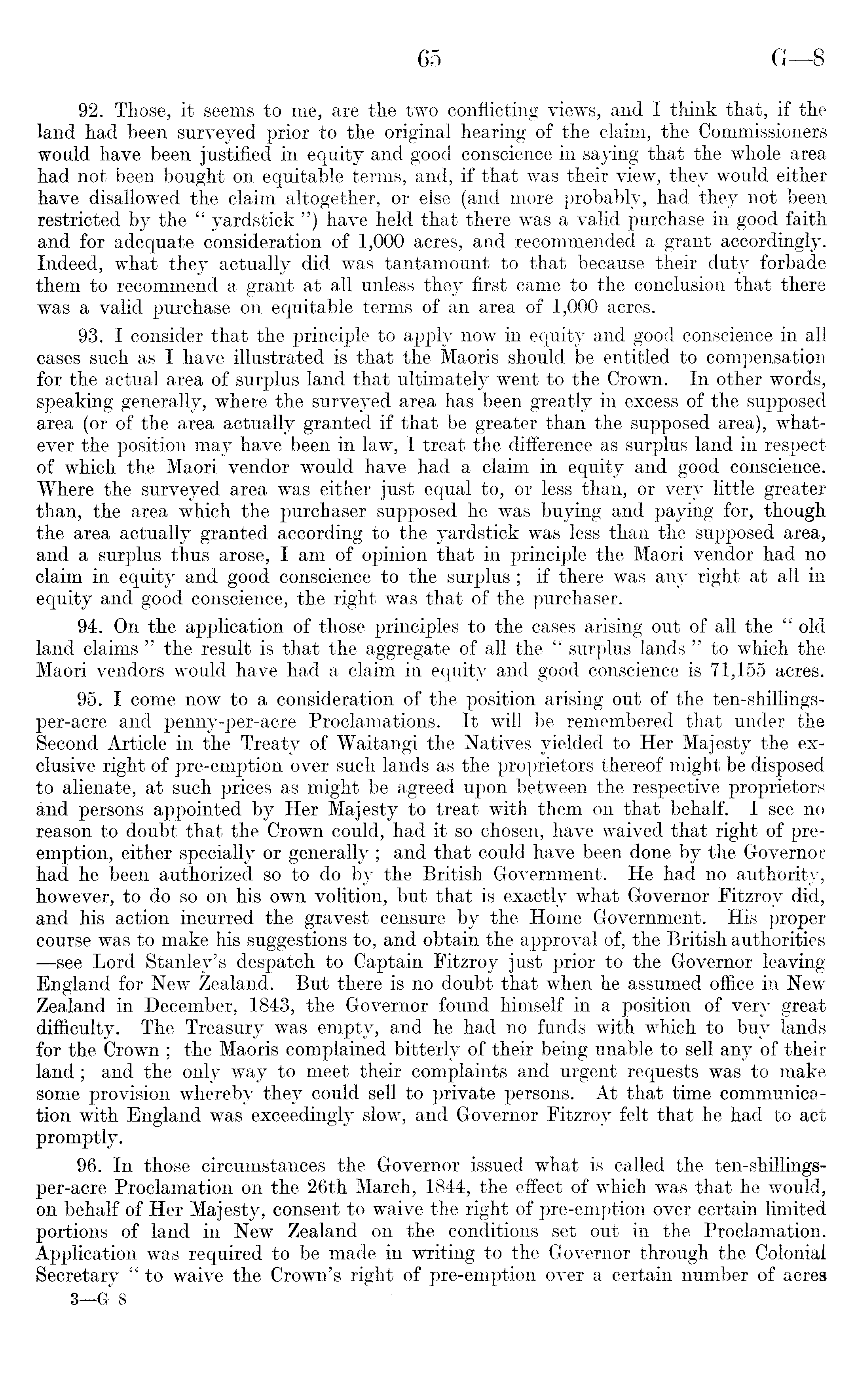 92. Those, it seems to me, are the two conflicting views, and I think that, if the land had been surveyed prior to the original hearing of the claim, the Commissioners would have been justified in equity and good conscience in saying that the whole area had not been bought on equitable terms, and, if that was their view, they would either have disallowed the claim altogether, or else (and more probably, had they not been restricted by the " yardstick ") have held that there was a valid purchase in good faith and for adequate consideration of 1,000 acres, and recommended a grant accordingly. Indeed, what they actually did was tantamount to that because their duty forbade them to recommend a grant at all unless they first came to the conclusion that there was a valid purchase on equitable terms of an area of 1,000 acres. 93. I consider that the principle to apply now in equity and good conscience in all cases such as I have illustrated is that the Maoris should be entitled to compensation for the actual area of surplus land that ultimately went to the Crown. In other words, speaking generally, where the surveyed area has been greatly in excess of the supposed area (or of the area actually granted if that be greater than the supposed area), whatever the position may have been in law, I treat the difference as surplus land in respect of which the Maori vendor would have had a claim in equity and good conscience. Where the surveyed area was either just equal to, or less than, or very little greater than, the area which the purchaser supposed he was buying and paying for, though the area actually granted according to the yardstick was less than the supposed area, and a surplus thus arose, I am of opinion that in principle the Maori vendor had no claim in equity and good conscience to the surplus ; if there was any right at all in equity and good conscience, the right was that of the purchaser. 94. On the application of those principles to the cases arising out of all the " old land claims " the result is that the aggregate of all the " surplus lands " to which the Maori vendors would have had a claim in equity and good conscience is 71,155 acres. 95. I come now to a consideration of the position arising out of the ten-shillings-per-acre and penny-per-acre Proclamations. It will be remembered that under the Second Article in the Treaty of Waitangi the Natives yielded to Her Majesty the exclusive right of pre-emption over such lands as the proprietors thereof might be disposed to alienate, at such prices as might be agreed upon between the respective proprietors and persons appointed by Her Majesty to treat with them on that behalf. I see no reason to doubt that the Crown could, had it so chosen, have waived that right of preemption, either specially or generally ; and that could have been done by the Governor had he been authorized so to do by the British Government. He had no authority, however, to do so on his own volition, but that is exactly what Governor Fitzroy did, and his action incurred the gravest censure by the Home Government. His proper course was to make his suggestions to, and obtain the approval of, the British authorities —see Lord Stanley's despatch to Captain Fitzroy just prior to the Governor leaving England for New Zealand. But there is no doubt that when he assumed office in New Zealand in December, 1843, the Governor found himself in a position of very great difficulty. The Treasury was empty, and he had no funds with which to buy lands for the Crown ; the Maoris complained bitterly of their being unable to sell any of their land ; and the only way to meet their complaints and urgent requests was to make some provision whereby they could sell to private persons. At that time communication with England was exceedingly slow, and Governor Fitzroy felt that he had to act promptly. 96. In those circumstances the Governor issued what is called the ten-shillings-per-acre Proclamation on the 26th March, 1844, the effect of which was that he would, on behalf of Her Majesty, consent to waive the right of pre-emption over certain limited portions of land in New Zealand on the conditions set out in the Proclamation. Application was required to be made in writing to the Governor through the Colonial Secretary " to waive the Crown's right of pre-emption over a certain number of acres