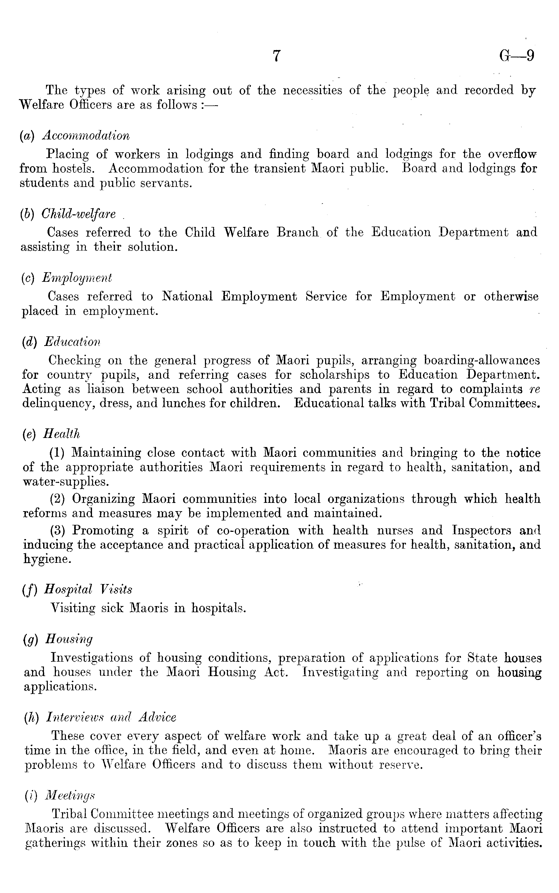 The types of work arising out of the necessities of the people and recorded by Welfare Officers are as follows : {a) Accommodation Placing of workers in lodgings and finding board and lodgings for the overflow from hostels. Accommodation for the transient Maori public. Board and lodgings for students and public servants. (b) Child-welfare . Cases referred to the Child Welfare Branch of the Education Department and assisting in their solution. (c) Employment Cases referred to National Employment Service for Employment or otherwise placed in employment. (d) Education Checking on the general progress of Maori pupils, arranging boarding-allowances for country pupils, and referring cases for scholarships to Education Department. Acting as liaison between school authorities and parents in regard to complaints re delinquency, dress, and lunches for children. Educational talks with Tribal Committees, (e) Health (1) Maintaining close contact with Maori communities and bringing to the notice of the appropriate authorities Maori requirements in regard to health, sanitation, and water-supplies. (2) Organizing Maori communities into local organizations through which health reforms and measures may be implemented and maintained. (3) Promoting a spirit of co-operation with health nurses and Inspectors and inducing the acceptance and practical application of measures for health, sanitation, and hygiene. {/) Hospital Visits Visiting sick Maoris in hospitals. (g) Housing Investigations of housing conditions, preparation of applications for State houses and houses under the Maori Housing Act. Investigating and reporting on housing applications. (h) Interviews and Advice These cover every aspect of welfare work and take up a great deal of an officer's time in the office, in the field, and even at home. Maoris are encouraged to bring their problems to Welfare Officers and to discuss them without reserve. (i) Meetings Tribal Committee meetings and meetings of organized groups where matters affecting Maoris are discussed. Welfare Officers are also instructed to attend important Maori gatherings within their zones so as to keep in touch with the pulse of Maori activities.