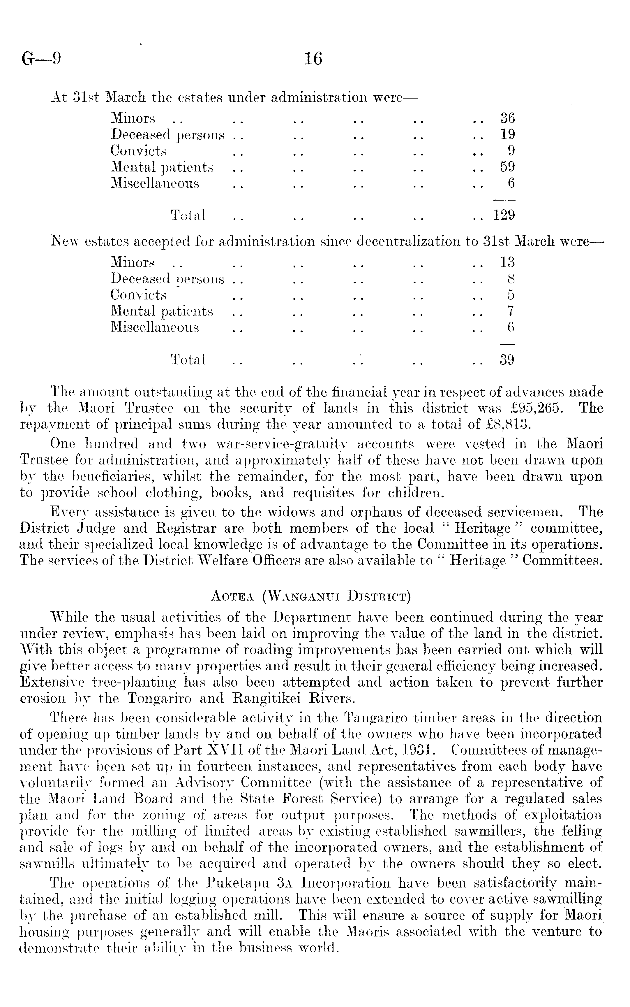 At 31st March the estates under administration were — Minors .. .. .. .. .. .. 36 Deceased persons .. .. .. .. 19 Convicts .. .. .. .. 9 Mental patients .. .. .. .. .. 59 Miscellaneous .. .. .. .. 6 Total .. .. .. .. ..129 New estates accepted for administration since decentralization to 31st March were— Minors .... .. .. .. 13 Deceased persons .. .. .. .. 8 Convicts .. .. .. .. 5 Mental patients .. .. .. .. 7 Miscellaneous .. .. .. .. 6 Total .. .. .. ..39 The amount outstanding at the end of the financial year in respect of advances made by the Maori Trustee on the security of lands in this district was £95,265. The repayment of principal sums during the year amounted to a total of £8,813. One hundred and two war-service-gratuity accounts were vested in the Maori Trustee for administration, and approximately half of these have not been drawn upon by the beneficiaries, whilst the remainder, for the most part, have been drawn upon to provide school clothing, books, and requisites for children. Every assistance is given to the widows and orphans of deceased servicemen. The District Judge and Registrar are both members of the local " Heritage " committee, and their specialized local knowledge is of advantage to the Committee in its operations. The services of the District Welfare Officers are also available to " Heritage " Committees. Aotea (Wanganui District) While the usual activities of the Department have been continued during the year under review, emphasis has been laid on improving the value of the land in the district. With this object a programme of roading improvements has been carried out which will give better access to many properties and result in their general efficiency being increased. Extensive tree-planting has also been attempted and action taken to prevent further erosion by the Tongariro and Rangitikei Rivers. There has been considerable activity in the Tangariro timber areas in the direction of opening up timber lands by and on behalf of the owners who have been incorporated under the provisions of Part XVII of the Maori Land Act, 1931. Committees of management have been set up in fourteen instances, and representatives from each body have voluntarily formed an Advisory Committee (with the assistance of a representative of the Maori Land Board and the State Forest Service) to arrange for a regulated sales plan and for the zoning of areas for output purposes. The methods of exploitation provide for the milling of limited areas by existing established sawmillers, the felling and sale of logs by and on behalf of the incorporated owners, and the establishment of sawmills ultimately to be acquired and operated by the owners should they so elect. The operations of the Puketapu 3a Incorporation have been satisfactorily maintained, and the initial logging operations have been extended to cover active sawmilling by the purchase of an established mill. This will ensure a source of supply for Maori housing purposes generally and will enable the Maoris associated with the venture to demonstrate their ability in the business world.